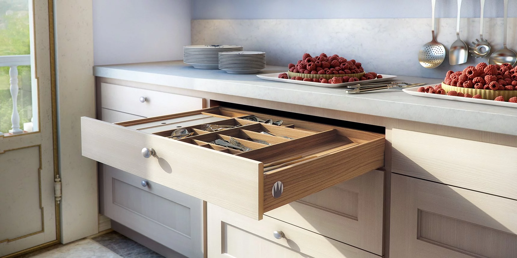 Благодаря сочетанию высоких шкафов и настенных полок кухня Brampton имеет живой вид. Центральную часть модели занимает остров, который покрыт каррарским мрамором. Изделие выполнено из элитной древесины, доставленной прямо из Корсики. Этот материал обладает однородной текстурой с едва заметной зернистостью, что вместе с белым мрамором создаёт идеальное сочетание.