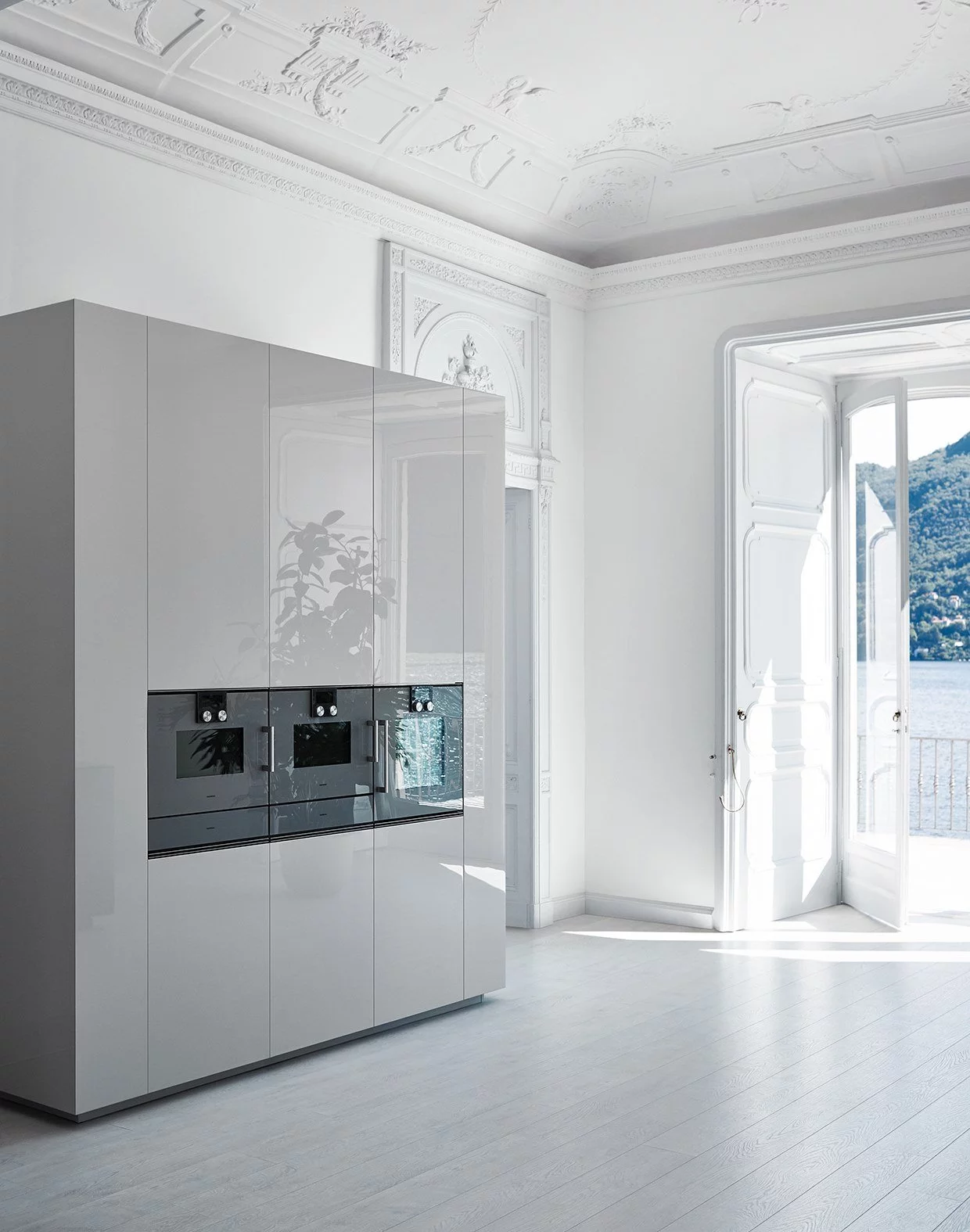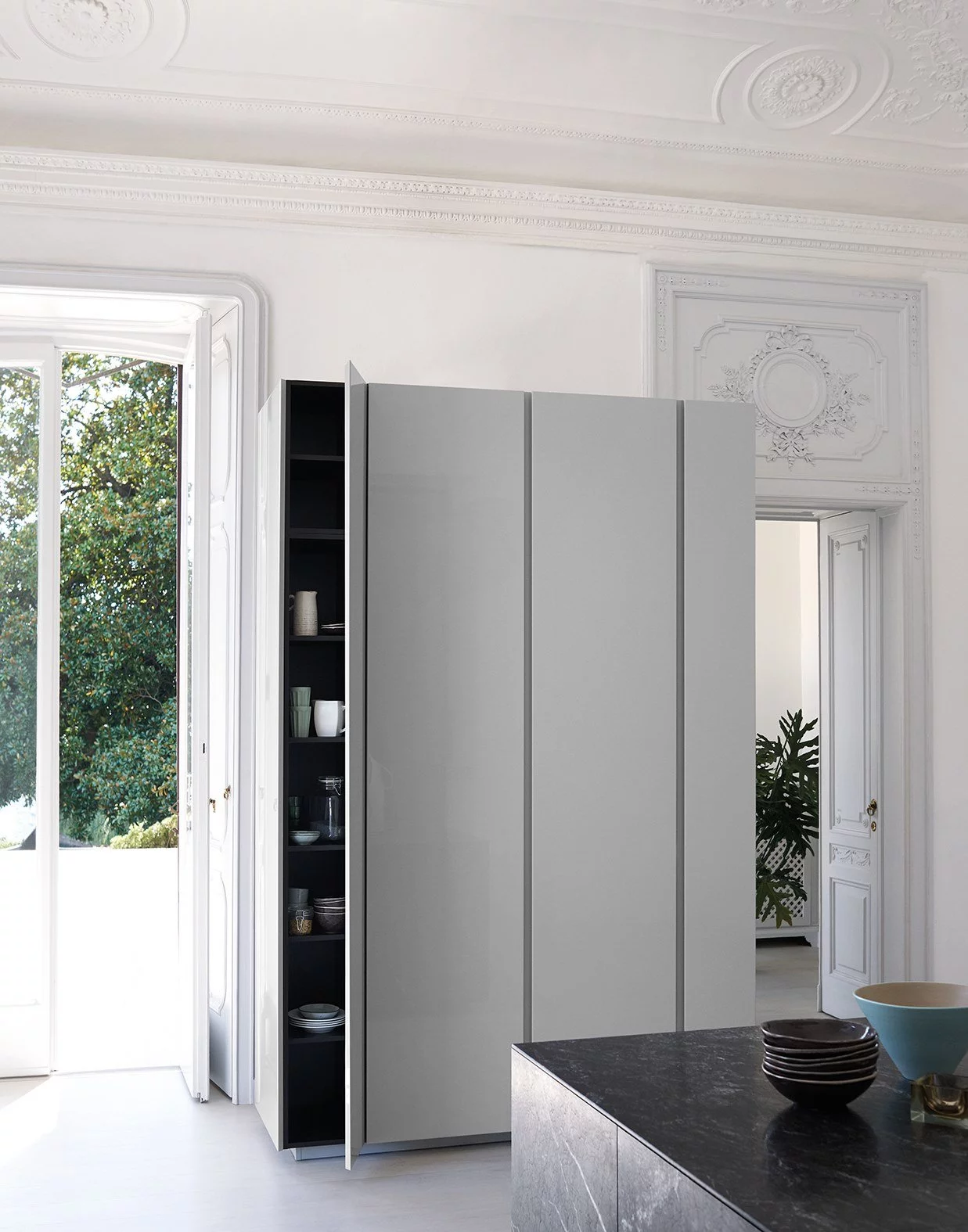 Система хранения кухни N_Elle представлена в виде отдельно стоящего модуля с глухими фасадами белого цвета. За ними можно скрыть от лишних глаз крупную посуду и кухонную технику. Кроме этого, имеется ещё один модуль для интеграции бытовой техники.