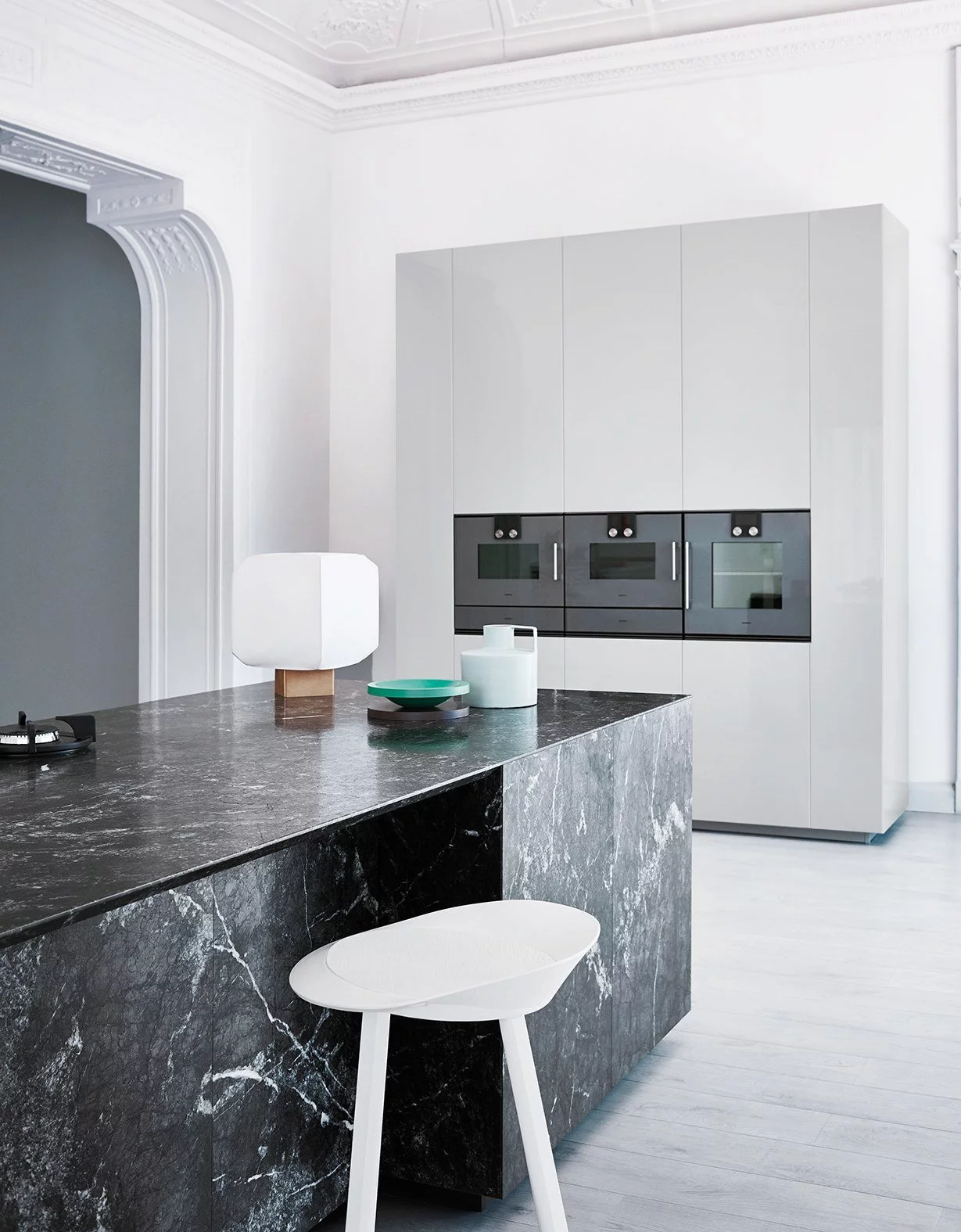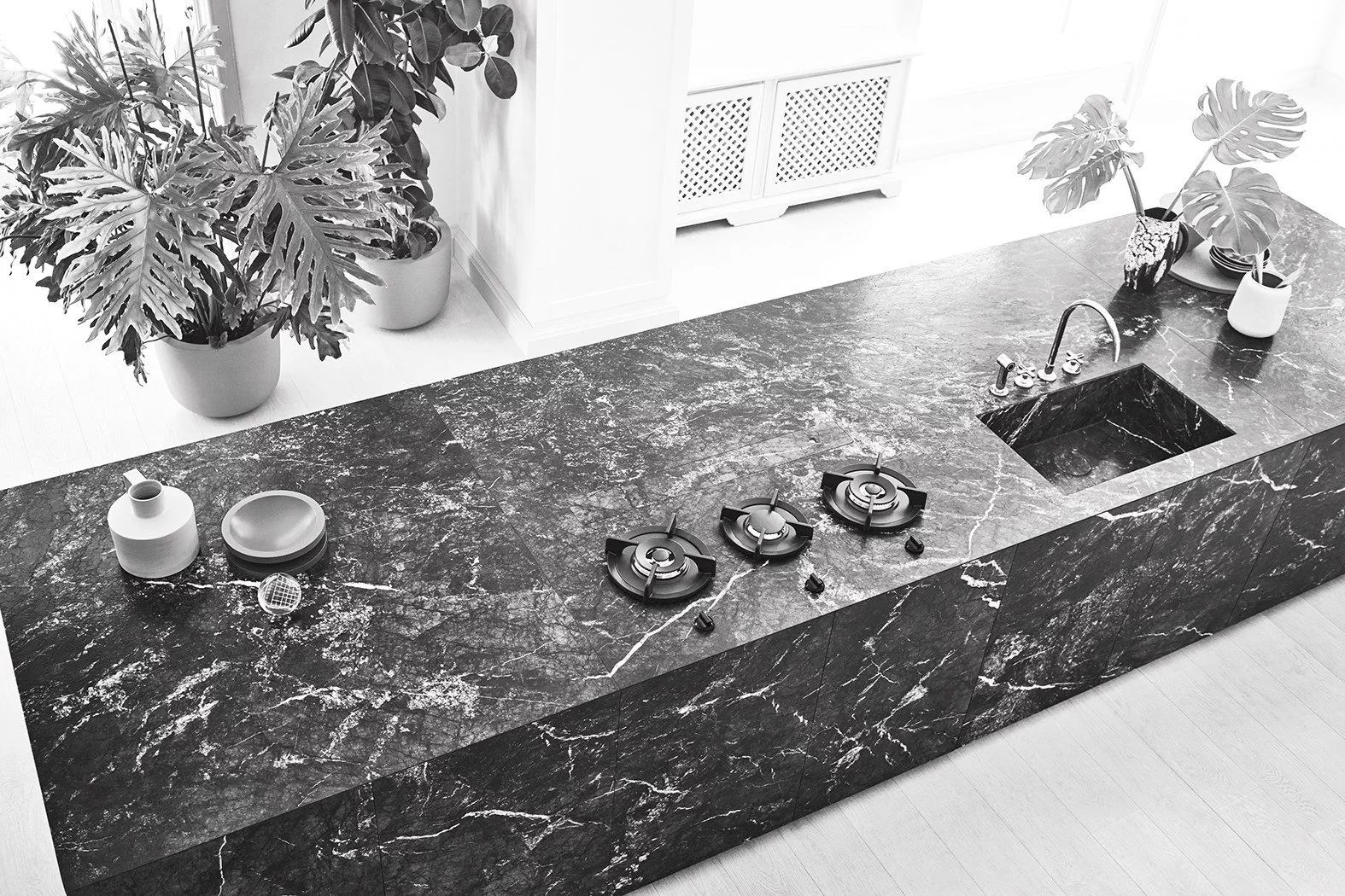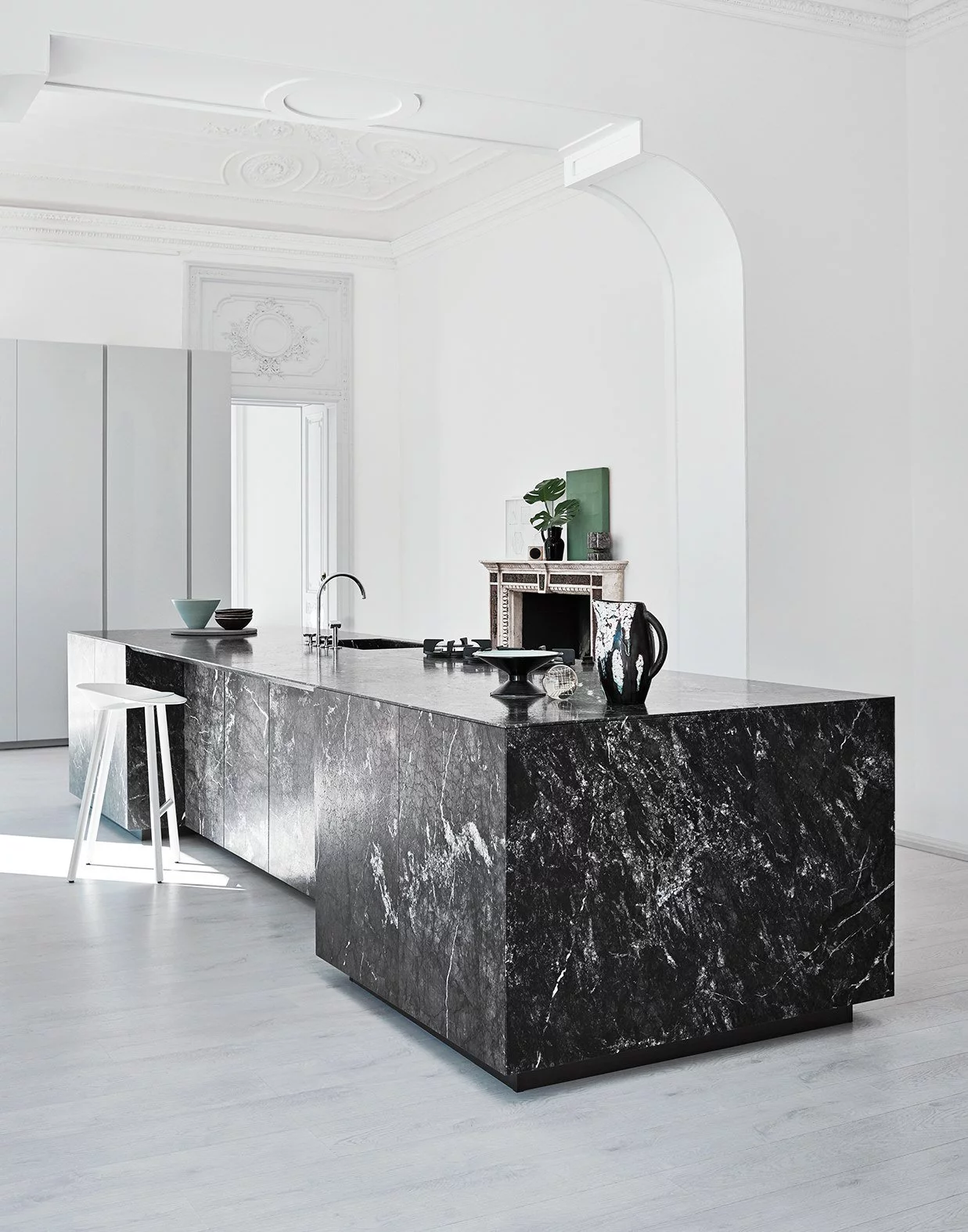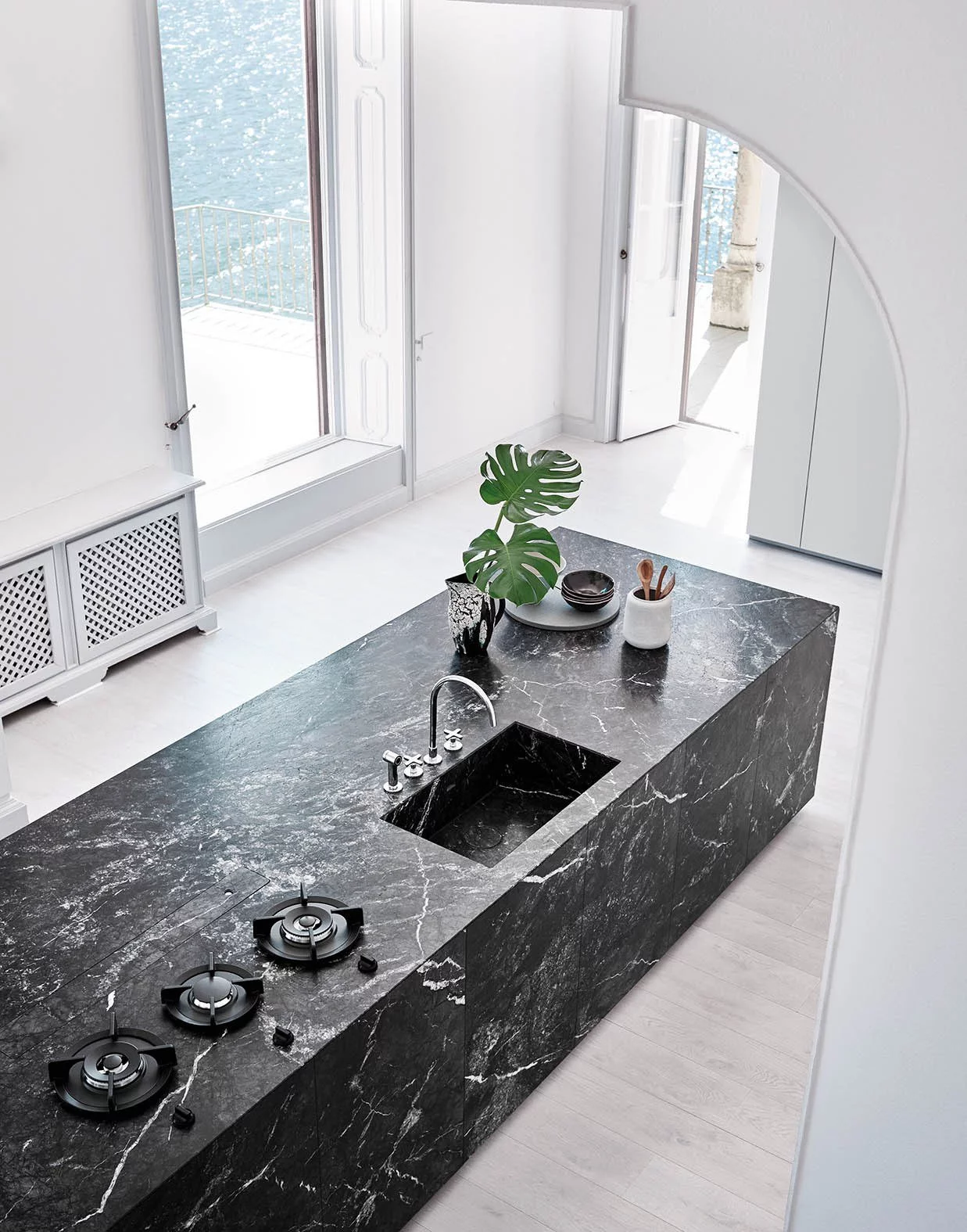 Изысканная кухня N_Elle от фабрики Cesar представлена минималистичном дизайне. Взгляд притягивает отделка в тёмном мраморе с белыми прожилками. Ничего лишнего: габаритный остров вмещает в себя варочную поверхность, мойку, внедрённую в модуль, и большую рабочую область. Кроме этого, имеется комфортная зона для перекуса с выемкой для ног.