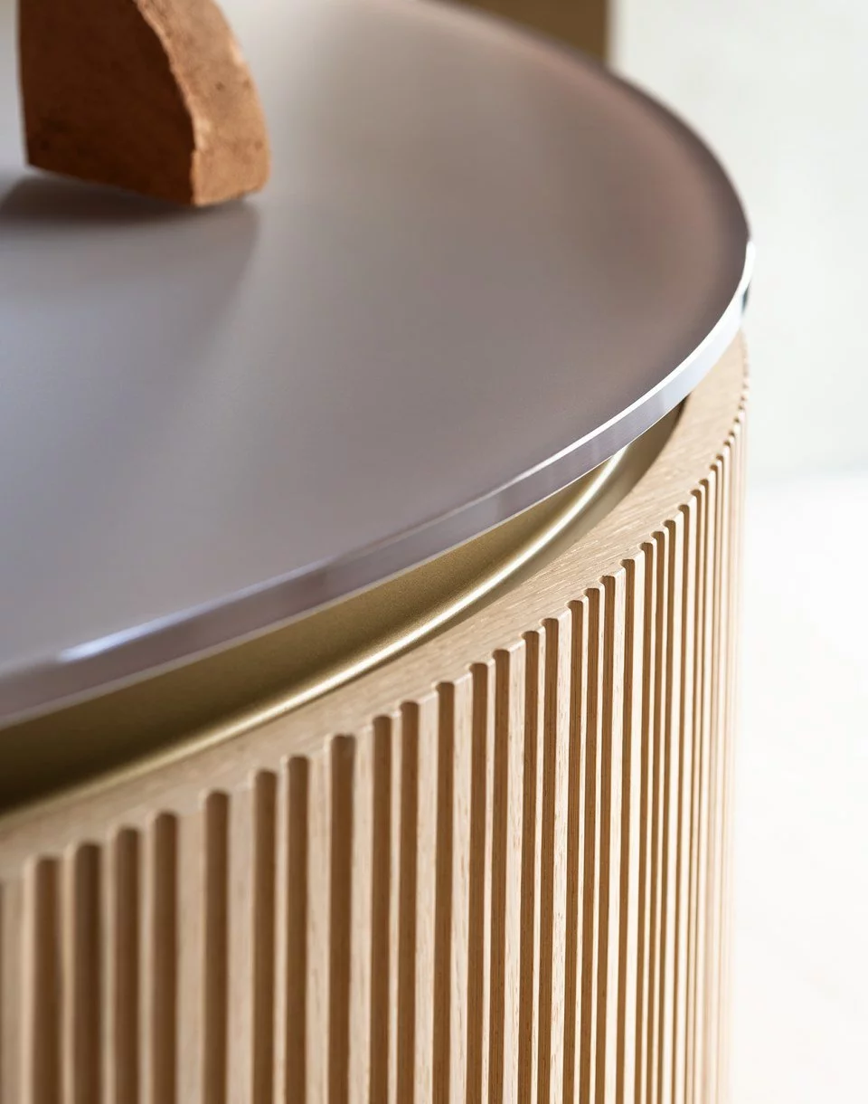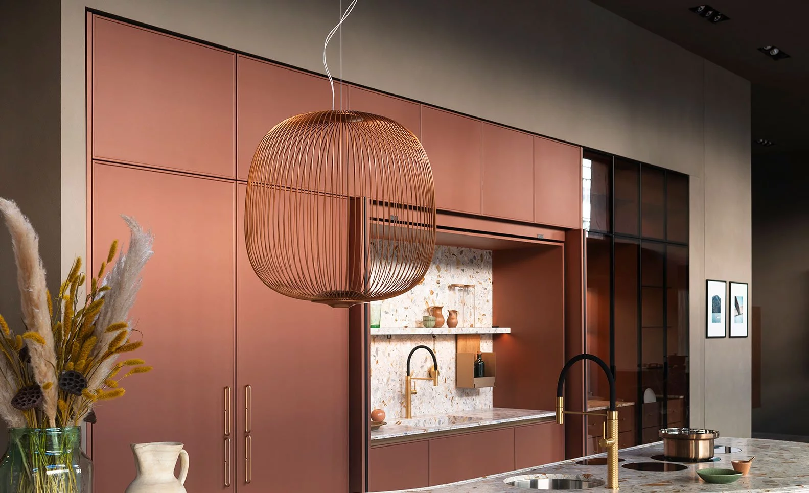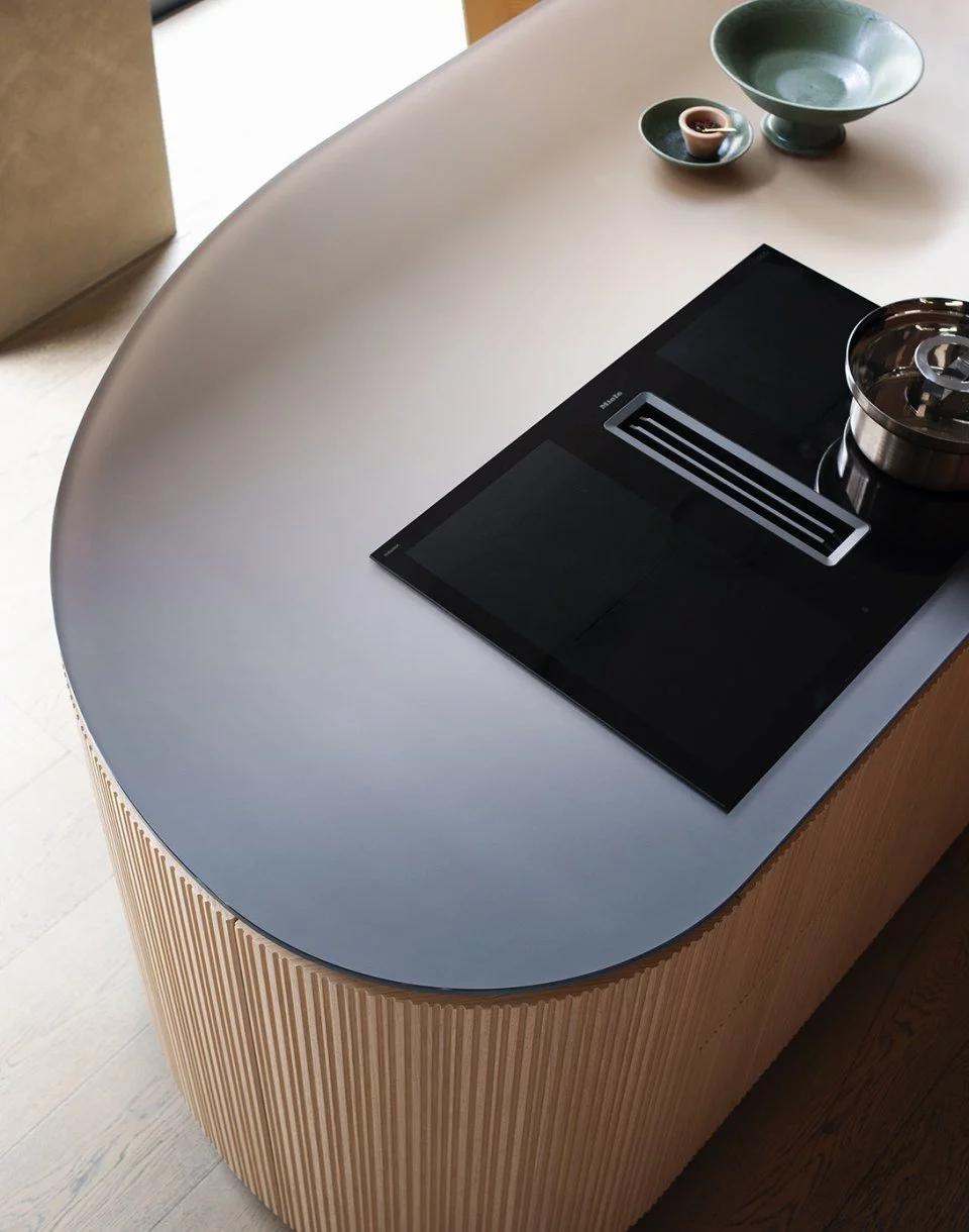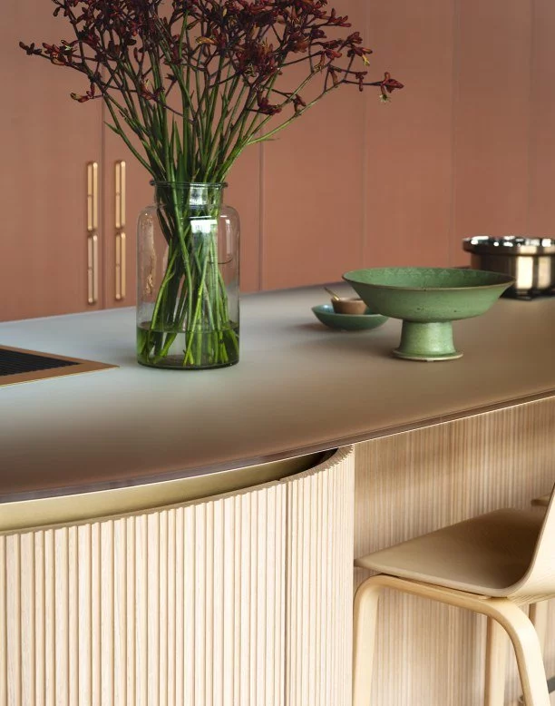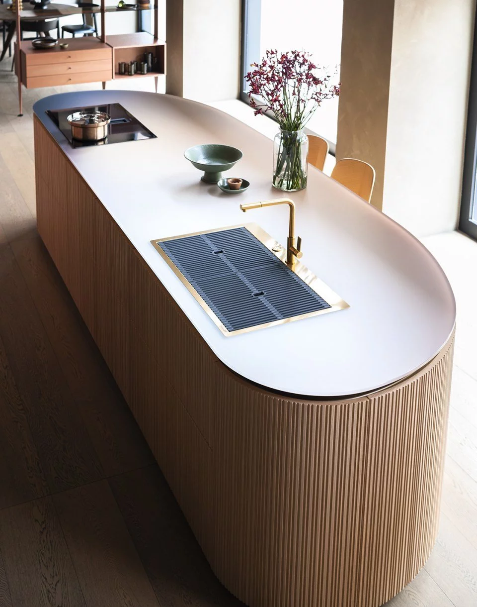 Остров Tangram со столешницей из оксидированного стекла Nuance Arenaria и створка Groove в отделке Rovere Nordico. Высокие шкафы Maxima 2.2 с витриной Bronzo. Подвесная система наполнения модулей Comb со спинкой из агломерата мрамора Bianco Apuano.