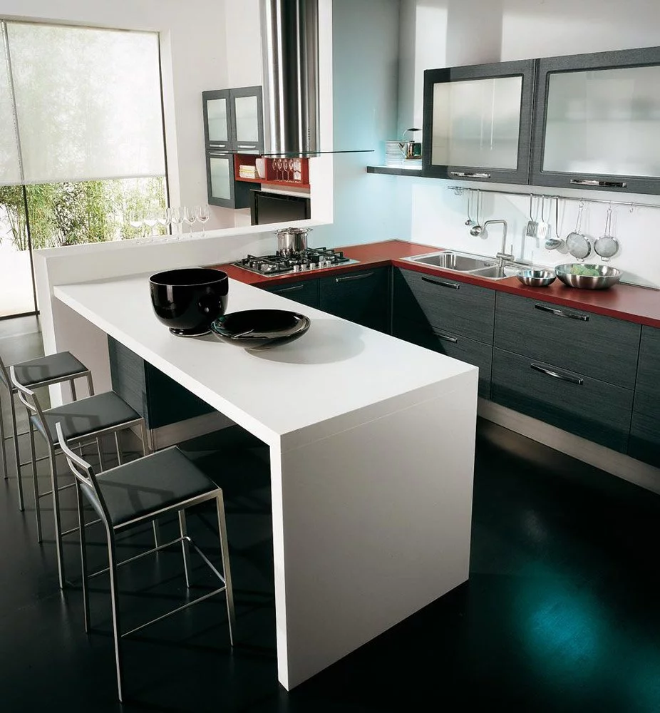 В качестве отделки применяется глянцевая или матовая ламинатная пленка. Доступен вариант с использованием крашеного закаленного стекла. Что касается цветовых решений, то вы можете выбрать черно-белый гарнитур или сочетание этих тонов с включением красного.