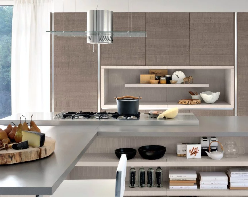 Очередная коллекция известной итальянской фабрики Lube позволяет использовать пространство с максимальным удобством: остров с мойкой и варочной панелью может быть объединен с обеденной зоной или расположен отдельно. Не менее практичны и открытые полки, аккуратные и гармонично сочетающиеся с общим дизайном.