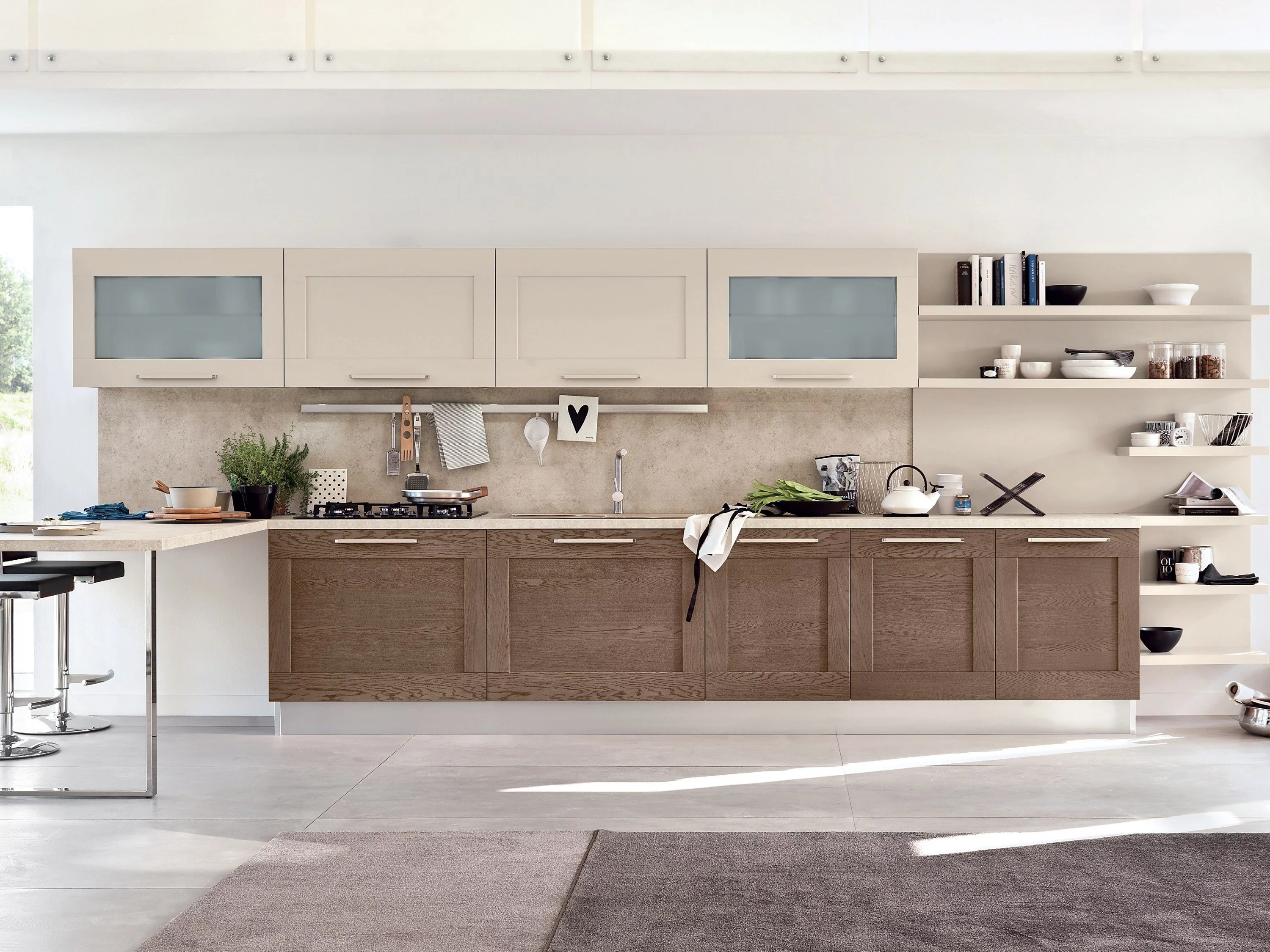 Кухня Gallery от фабрики Lube Cucine — это переплетение высокого качества материалов и оригинальности исполнения. Формы традиционны, просты, но вместе с тем идеальны для создания комфорта и уюта. Светлые тона зрительно увеличивают пространство и привносят гармонию в общий стиль.