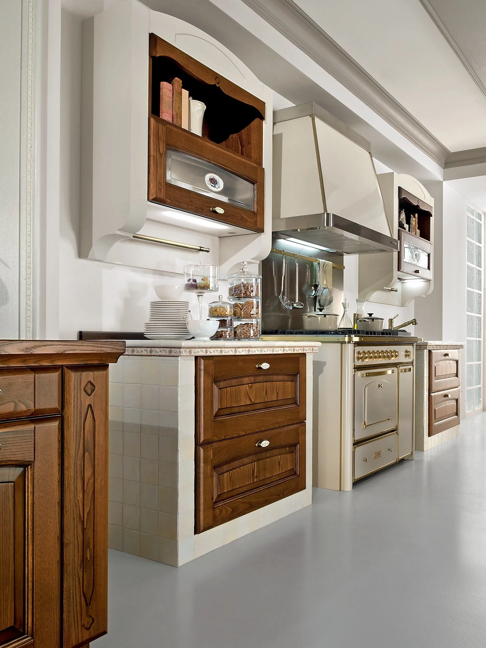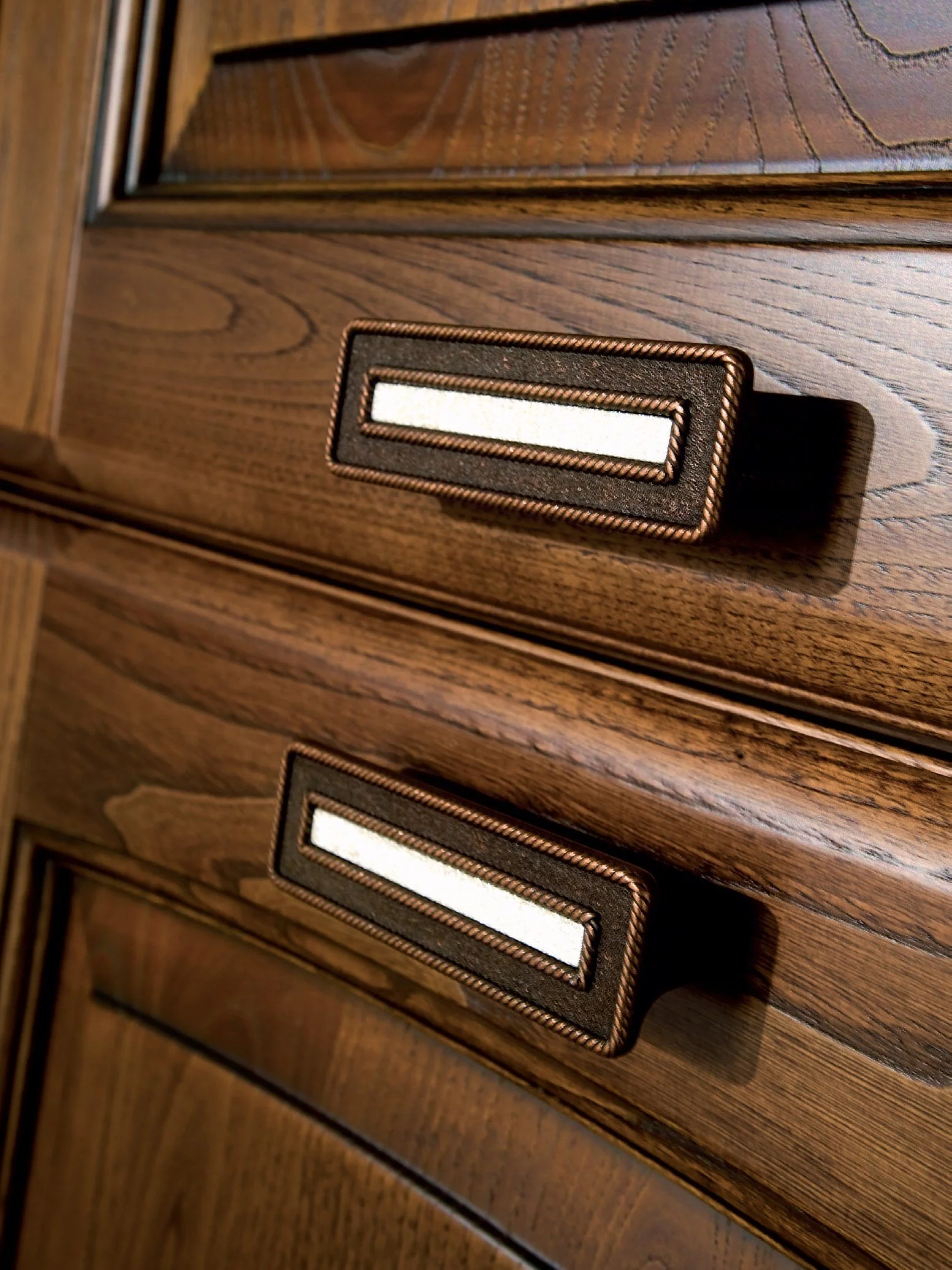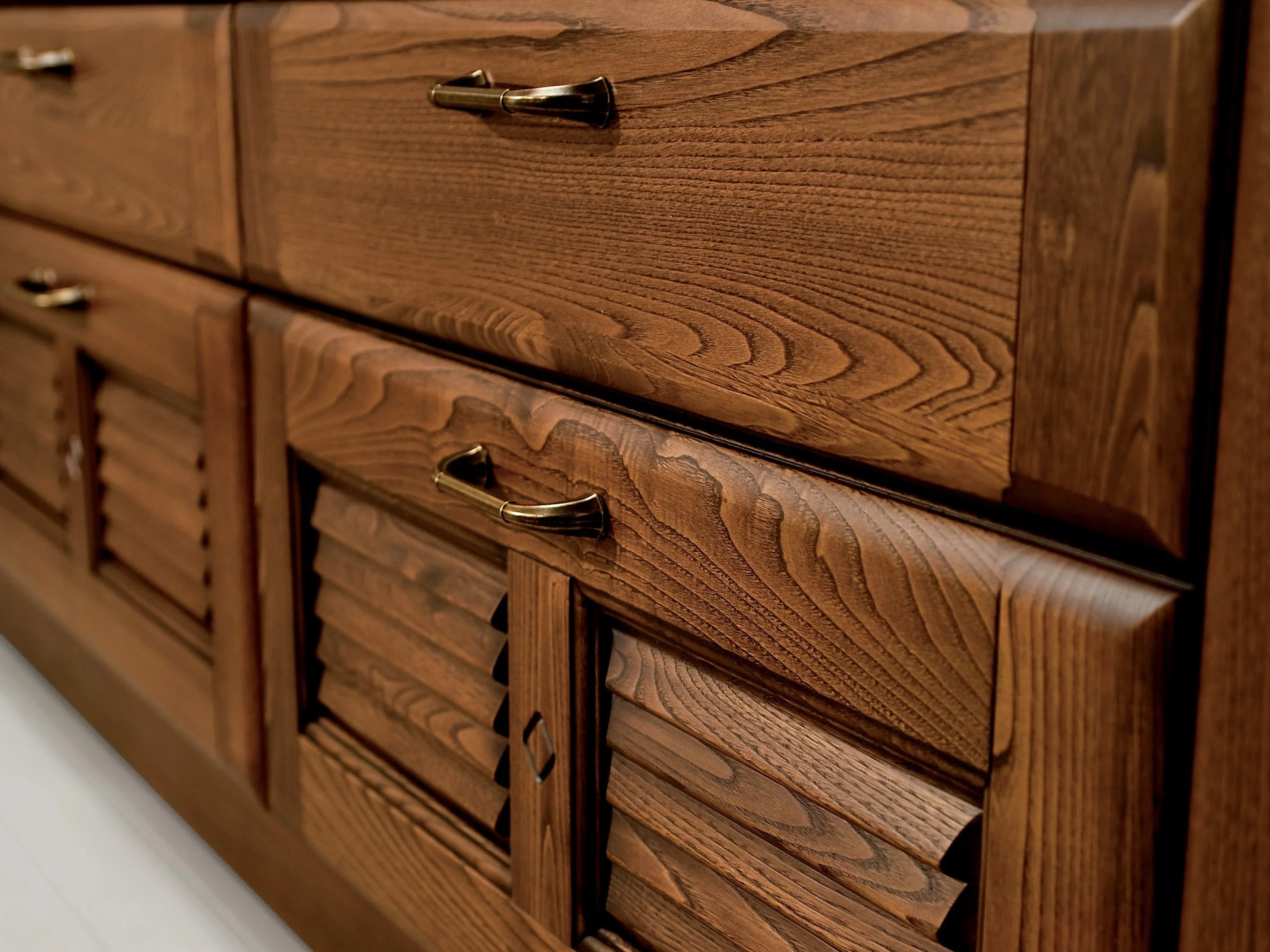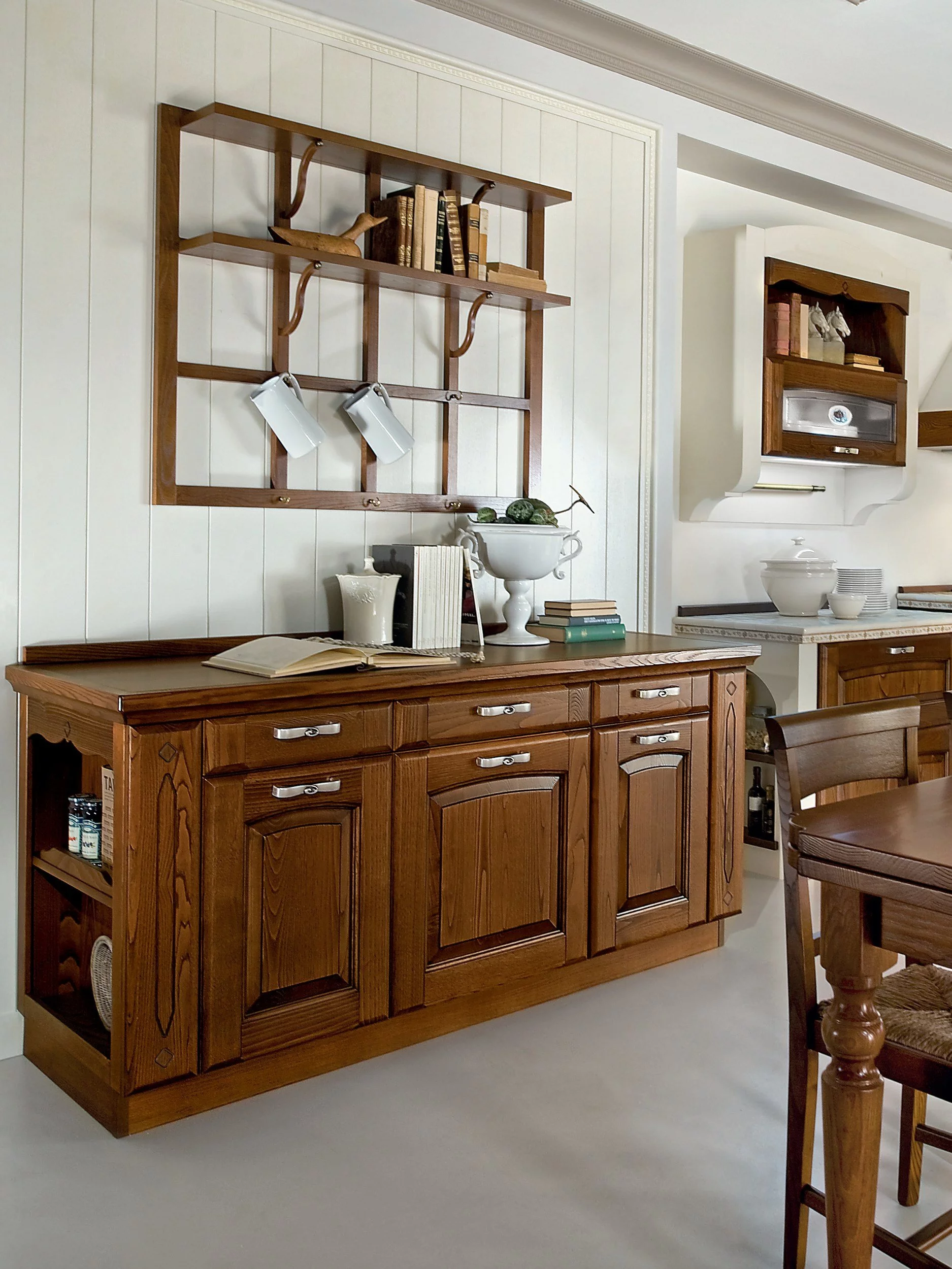 Фасад кухни выполнен из массивов ясеня, ореха и каштана. Доступны варианты с сатинированным закаленным стеклом, украшенным деревянной решеткой или иным элементом декора.