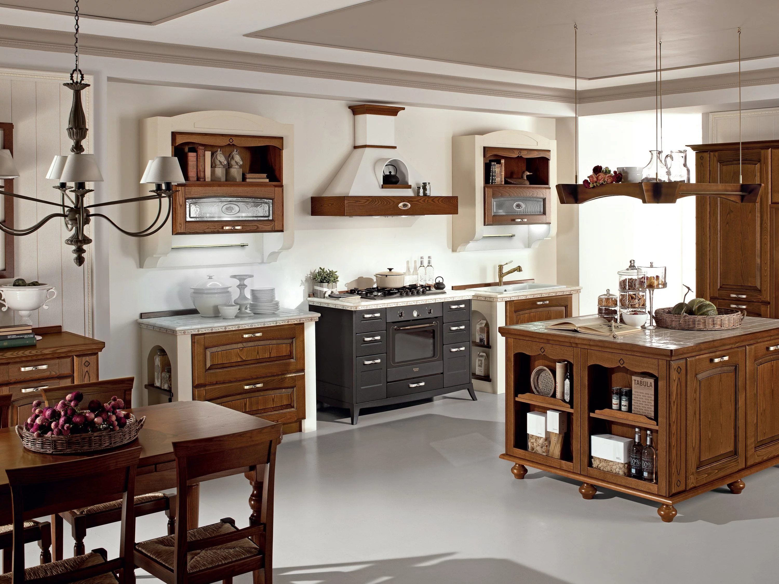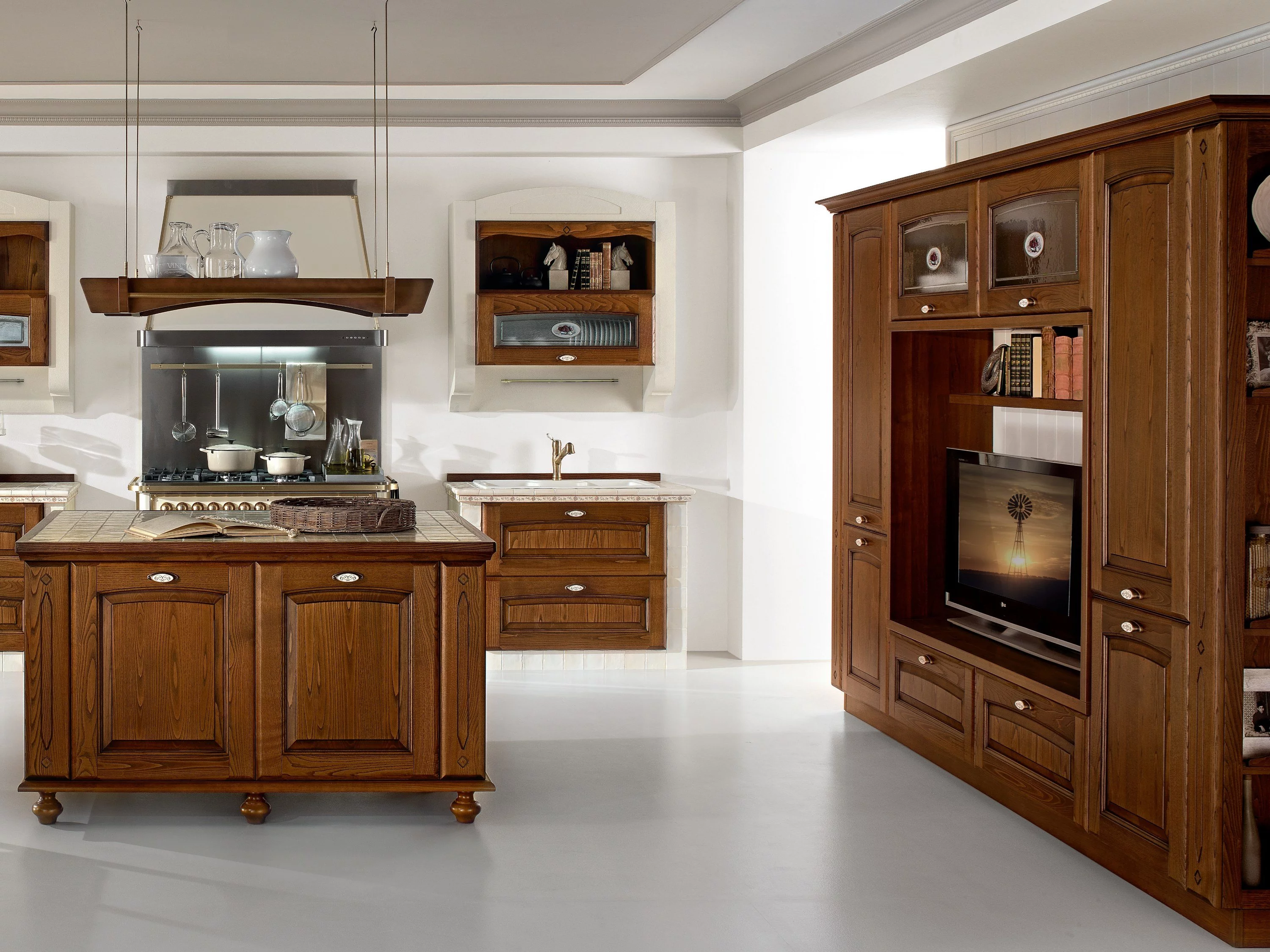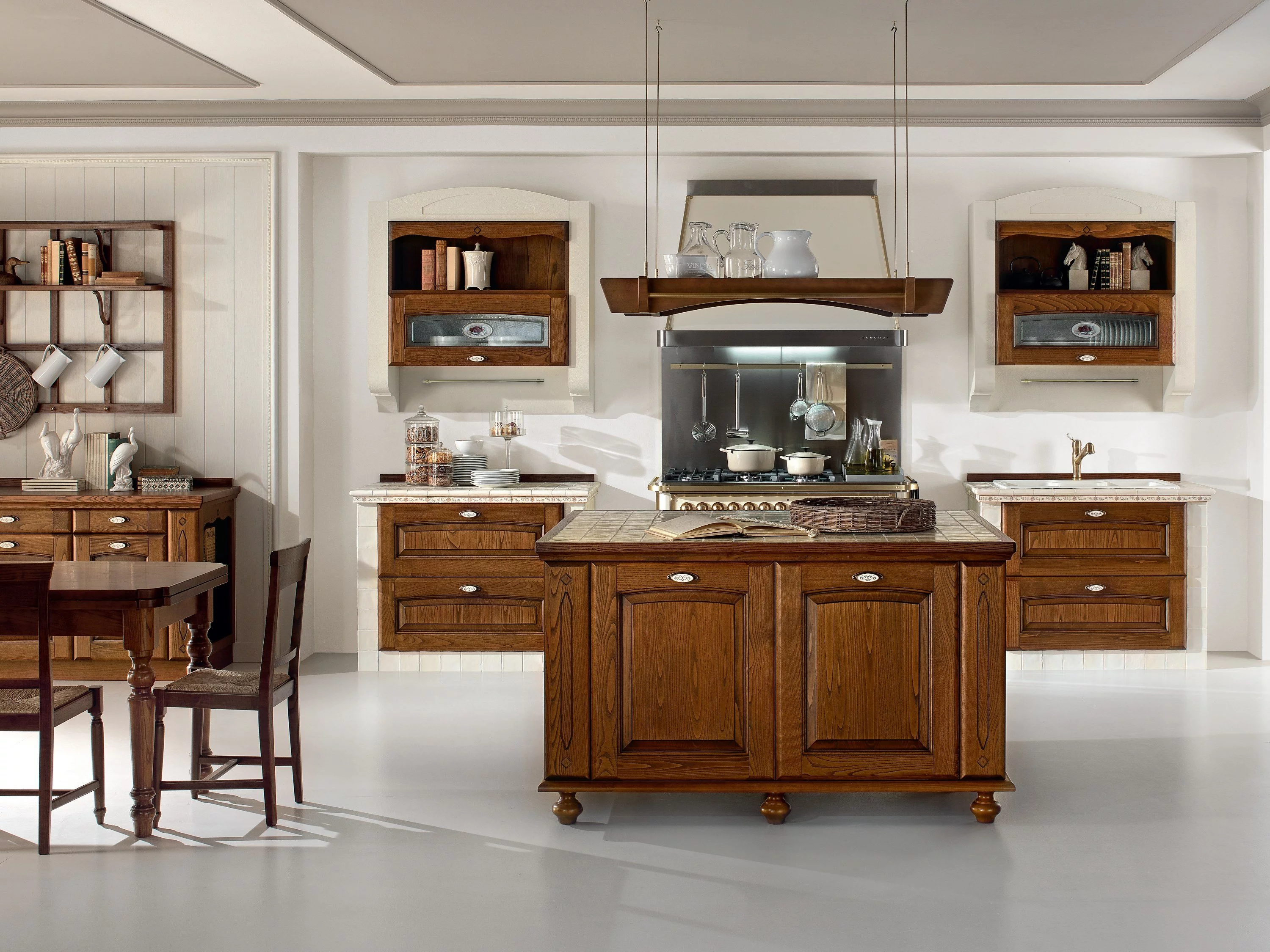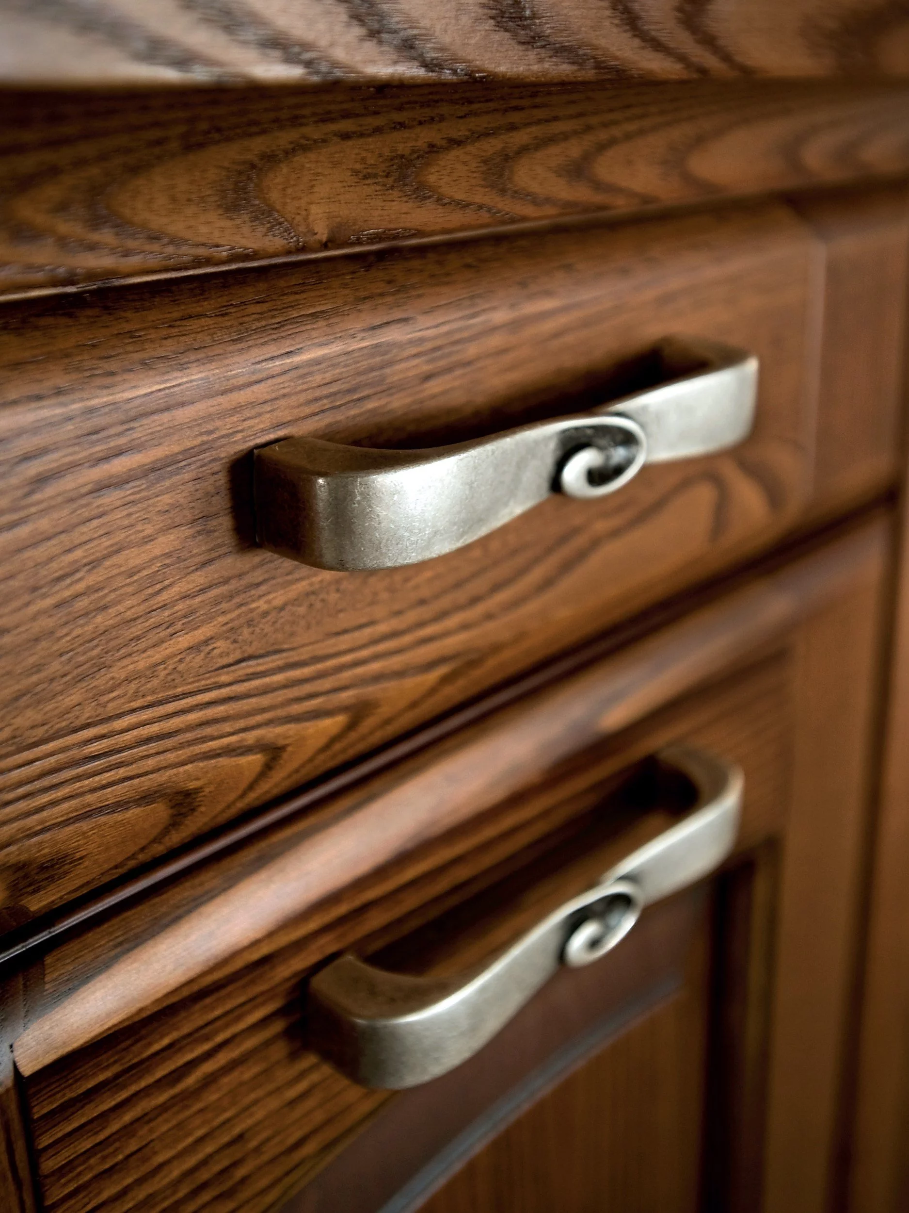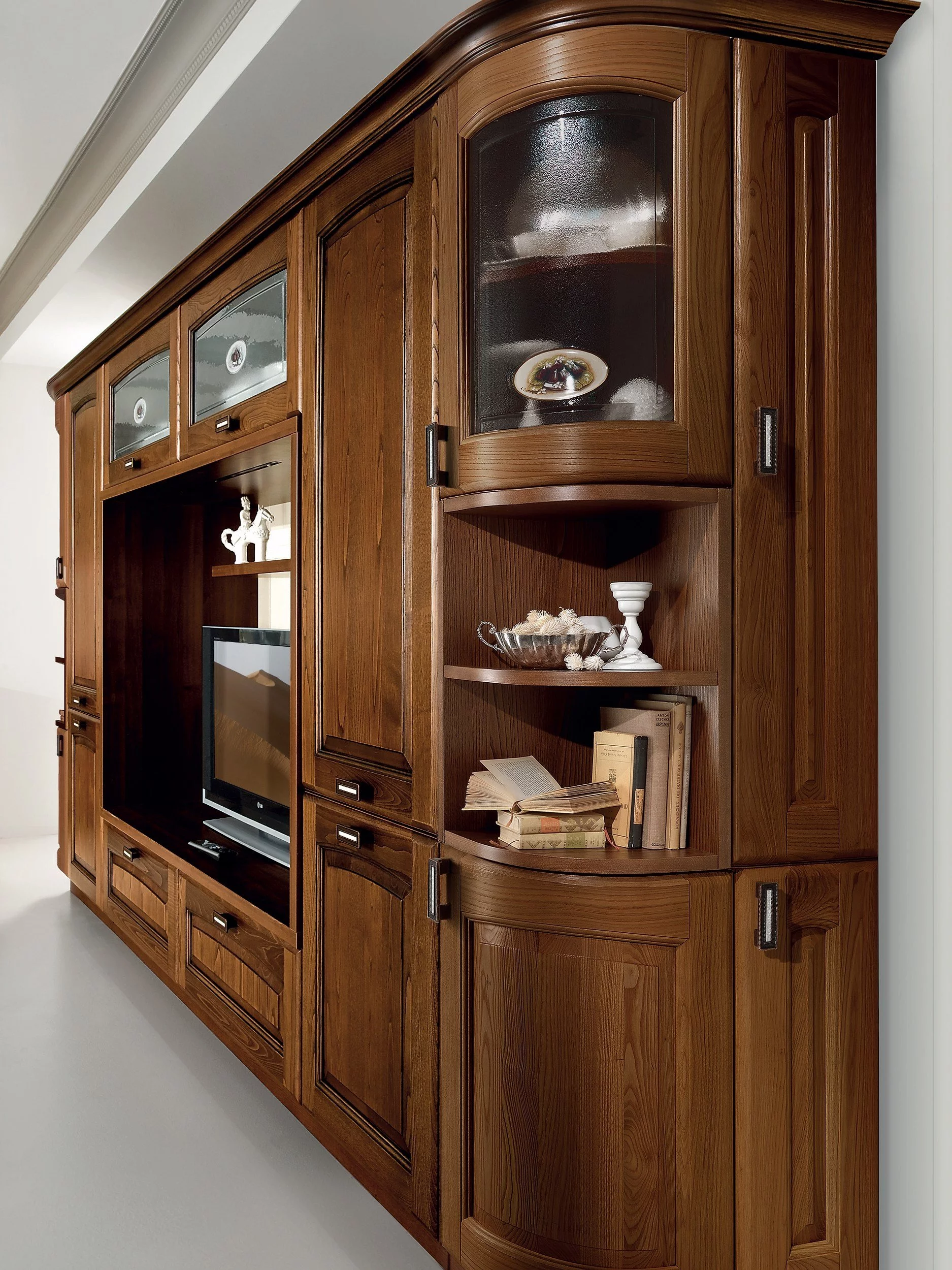 Фасад кухни выполнен из массивов ясеня, ореха и каштана. Доступны варианты с сатинированным закаленным стеклом, украшенным деревянной решеткой или иным элементом декора.