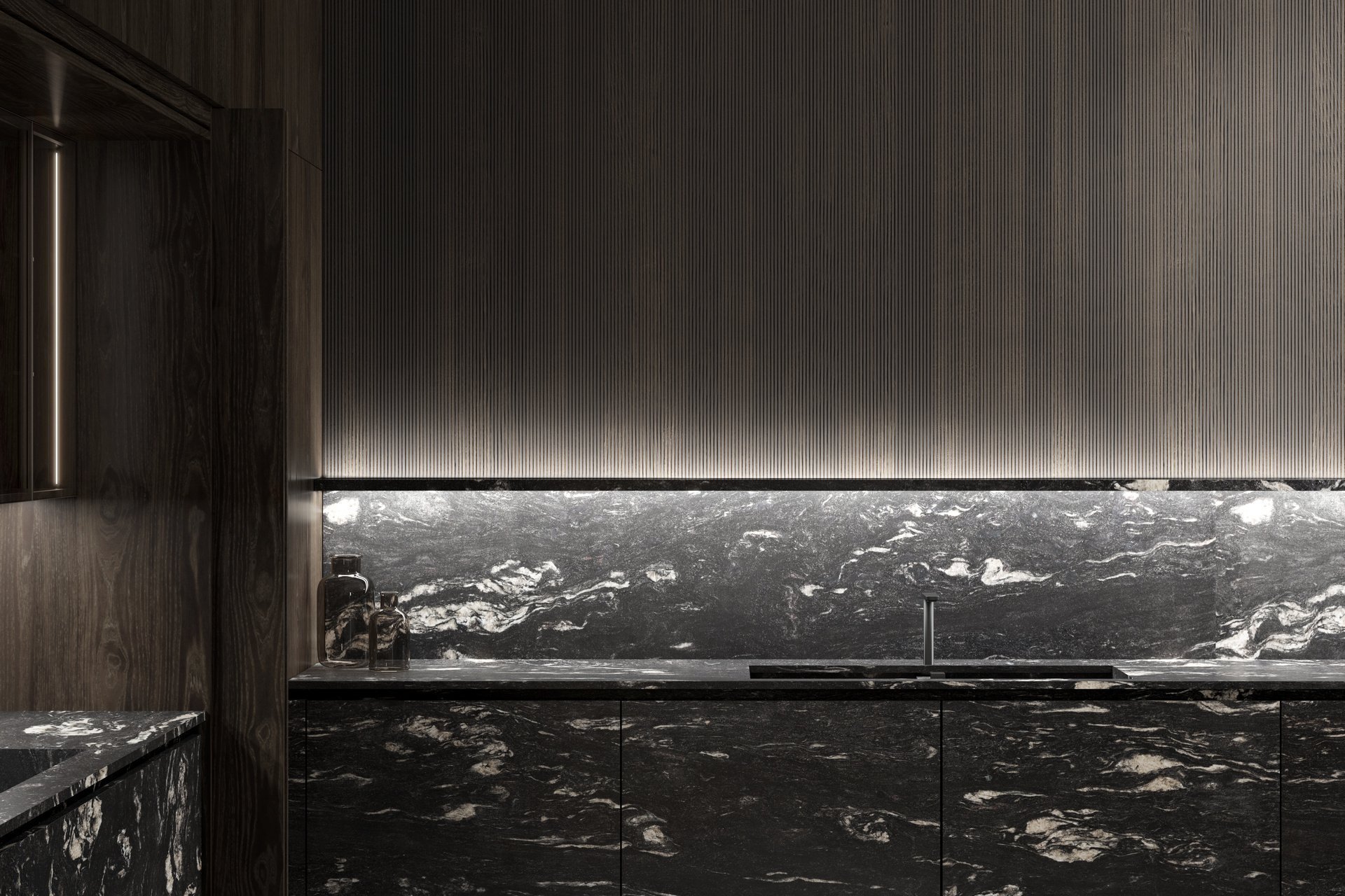 Освещение играет важную роль в создании атмосферы: оно подчёркивает рельеф древесины, усиливает глубину оттенков и добавляет интерьеру мягкое, уютное свечение. В результате кухня становится не просто функциональным пространством, а стильной архитектурной зоной, которая органично вписывается в современный интерьер.
