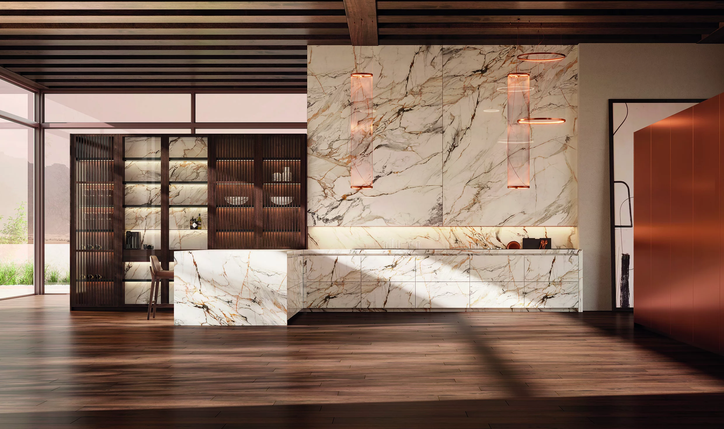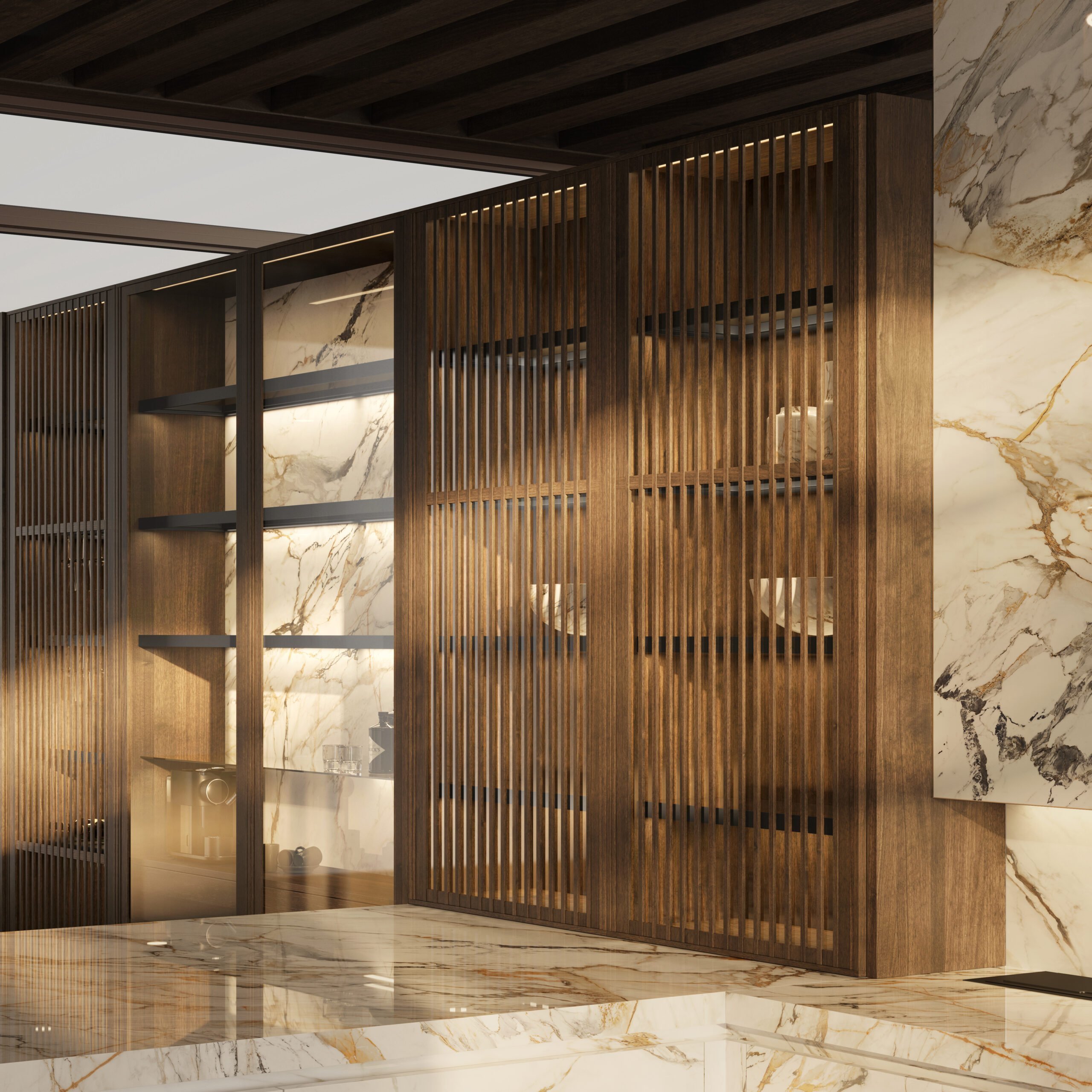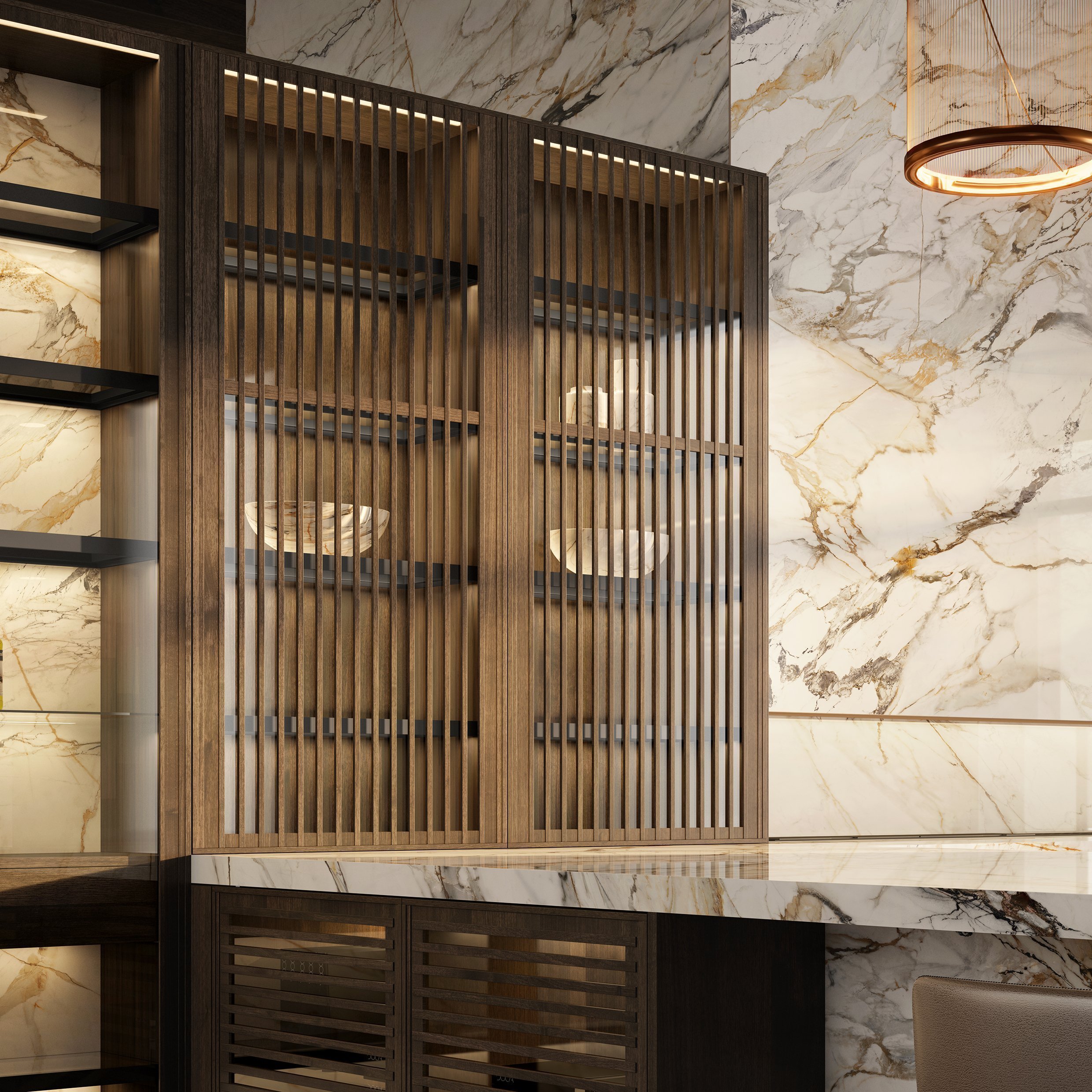 Металлические элементы в бронзовой отделке выступают как выразительный акцент, добавляя интерьеру глубину и характер. Выдвижная колонна - это не только эстетический приём, но и продуманное функциональное решение, позволяющее скрыть системы хранения и технику, сохраняя визуальную чистоту пространства. Контраст дерева и металла формирует сложную, многослойную композицию, которая раскрывается по-разному при изменении освещения и угла обзора.