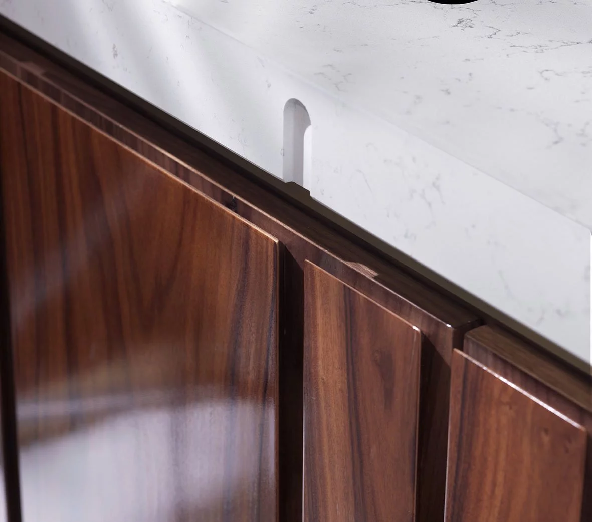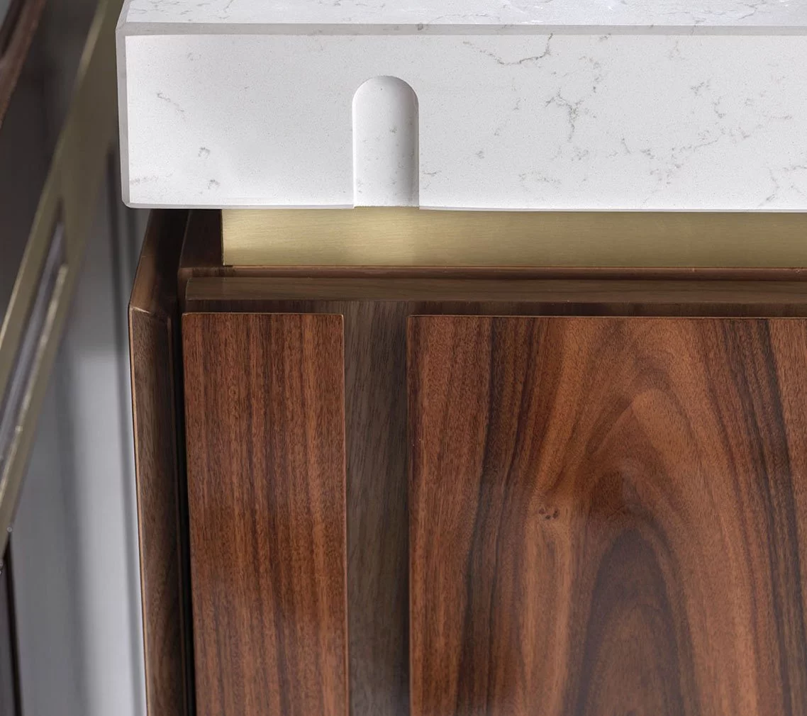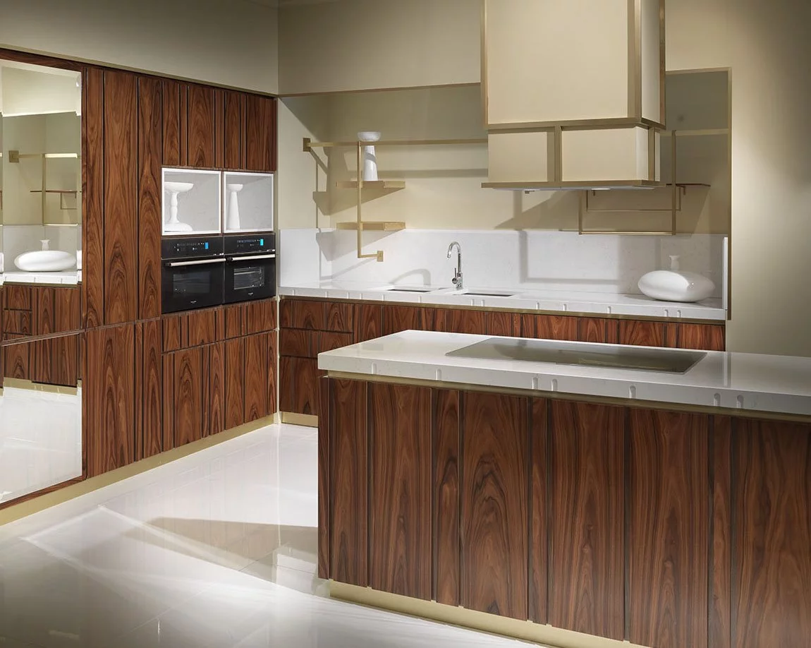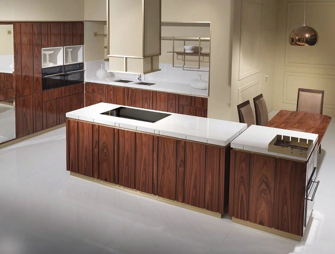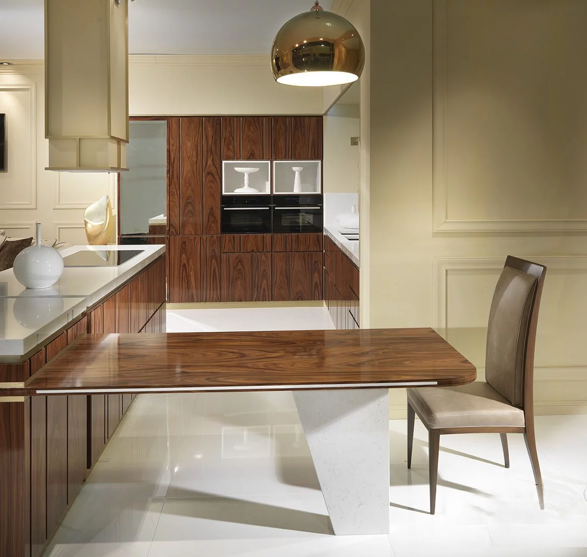 Современная кухня Lumia от итальянской фабрики Ebanart является образцом минималистического стиля с классическими элементами. Богатые тёмные фасады из натурального дерева защищает специальное лаковое покрытие, придающее изделию дополнительный шарм. Столешница рабочих зон выполнена в белом цвете из камня.