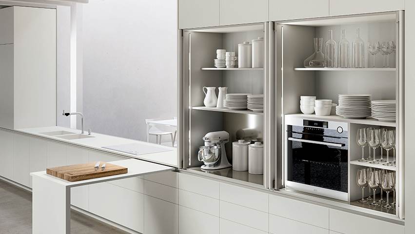 Кухня Slim — это минималистично белая отделка и скрытые ручки. На ней размещено множество открытых полок по бокам, всё остальное скрывается за глухими фасадами из МДФ и натурального массива.