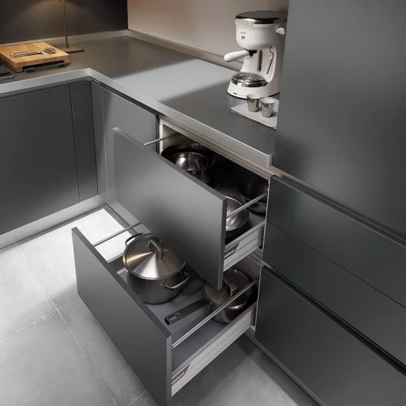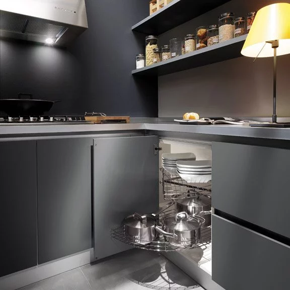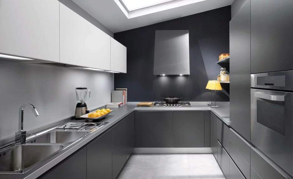 Но, всё-таки нельзя забывать о дизайне, внешнем исполнении — ведь именно он привлекает в первую очередь. Лаконичные, прямые линии придают коллекции некую строгость, которая смягчается подобранными материалами: теплым деревом, светлым, практически белым глянцем. Баланс хай-тека и домашнего уюта можно корректировать самостоятельно, выбирая один из вариантов исполнения. Тем, кто предпочитает технологичный, индустриальный стиль, подойдет кухня Ernestomeda с панелями насыщенного, глубокого серого цвета.