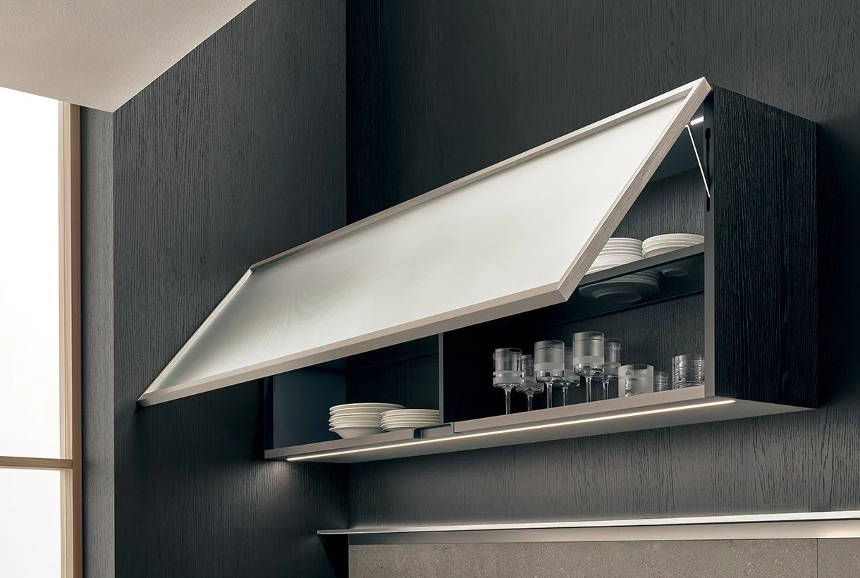 Функциональность K-Lab выражается в продуманных деталях: рамочные фасады с ручкой Shell, push-pull система для навесных шкафов, инновационные модули In-Line с балансирующим механизмом и стеклянными вставками. Все элементы создают гармоничное сочетание современного дизайна и удобства.