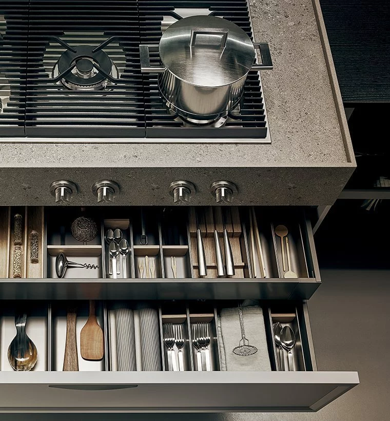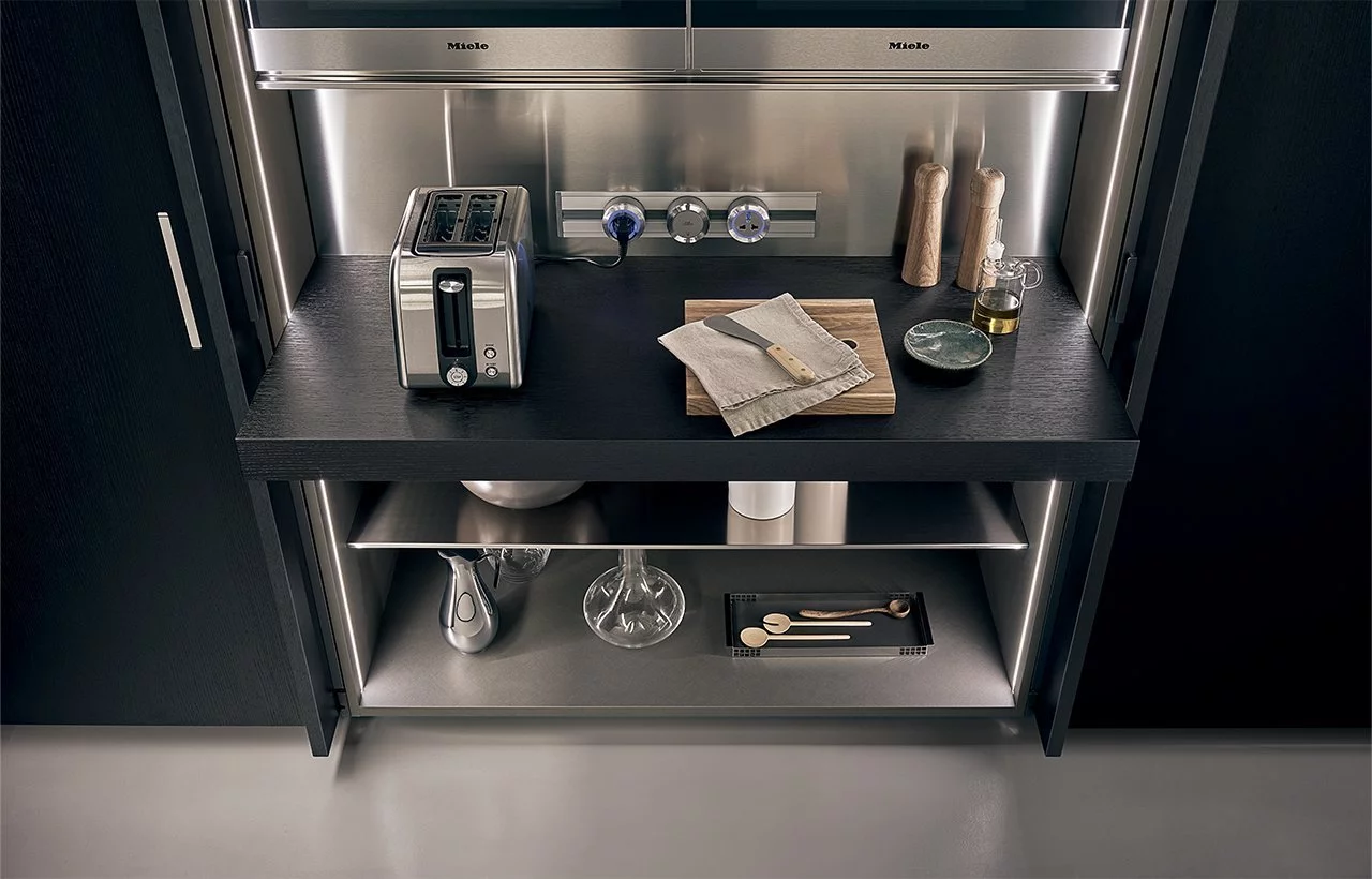 Интерьер кухни K-Lab легко адаптируется под индивидуальные потребности: внутренняя организация шкафов, аксессуары Surf, вдохновлённые искусством Мондриана, выдвижные столы и ящики, стальные панели с розетками для техники. Всё это делает кухню невероятно функциональной и эргономичной.