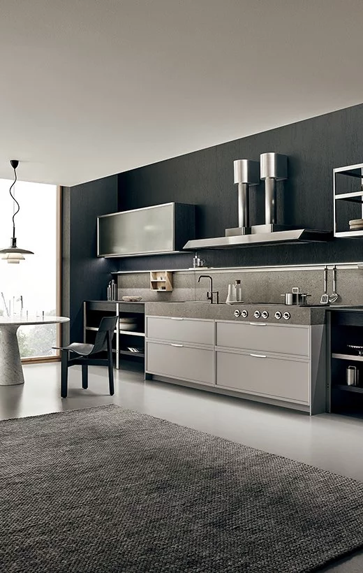 Коллекция K-Lab — это кухня, вдохновлённая атмосферой профессиональных гастрономических пространств. Открытые модули с металлическим каркасом и большие рабочие поверхности создают ощущение лёгкости, динамики и свободы. Это не просто интерьер, а настоящий кулинарный центр, где готовка превращается в искусство.
