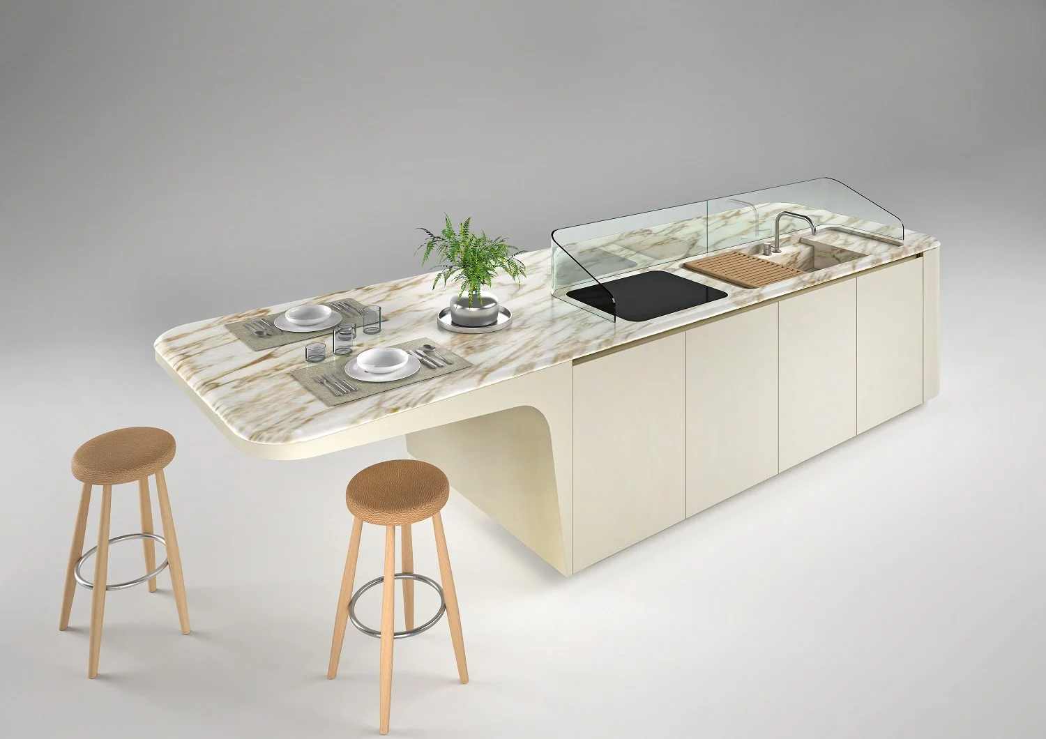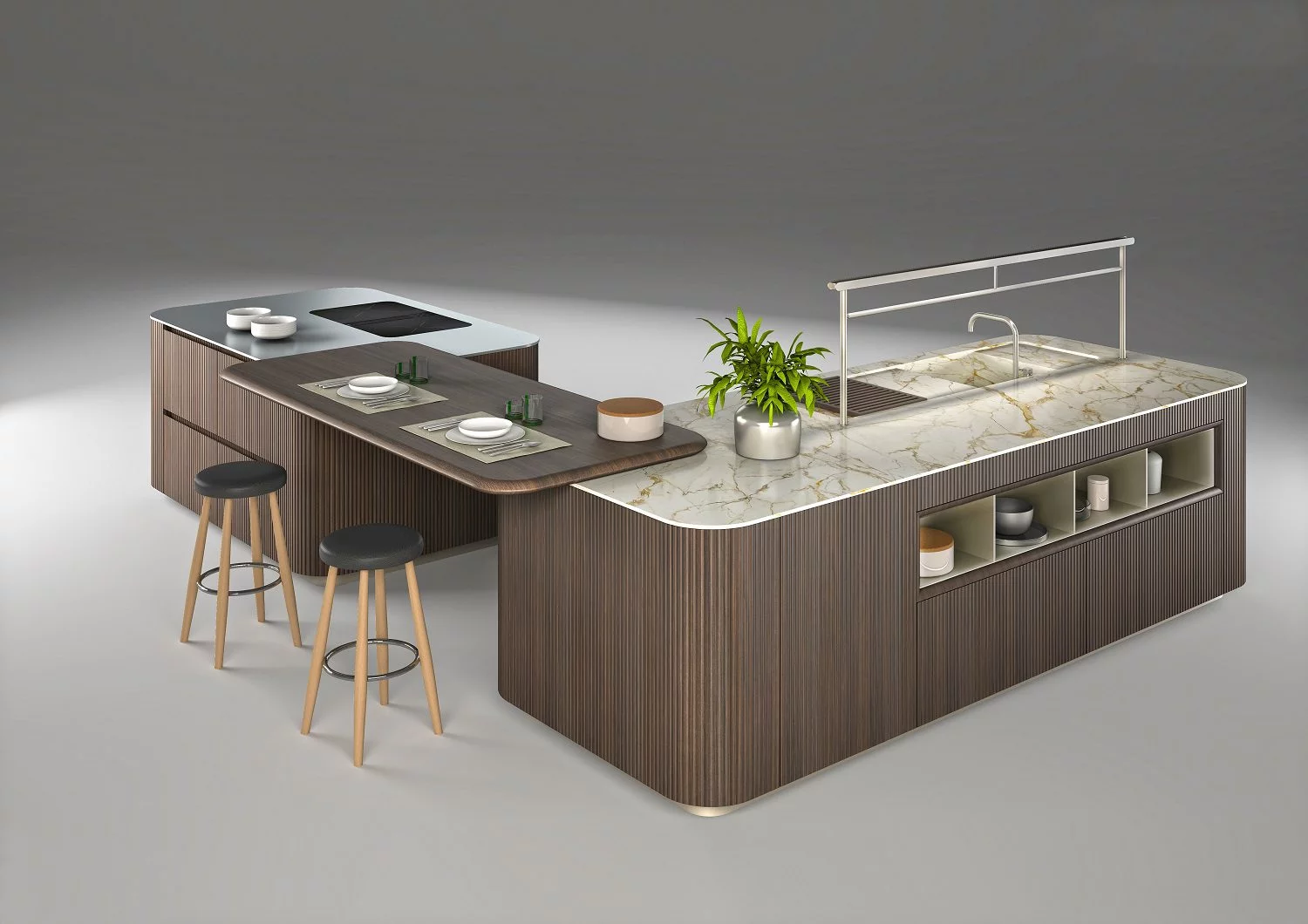 Главная особенность модели - использование закруглённых линий и плавных переходов между элементами. Это касается как фасадов, так и островной части. В конструкции острова предусмотрен встроенный стол, который выходит за пределы основной поверхности и может использоваться как дополнительная рабочая зона или место для приёма пищи.