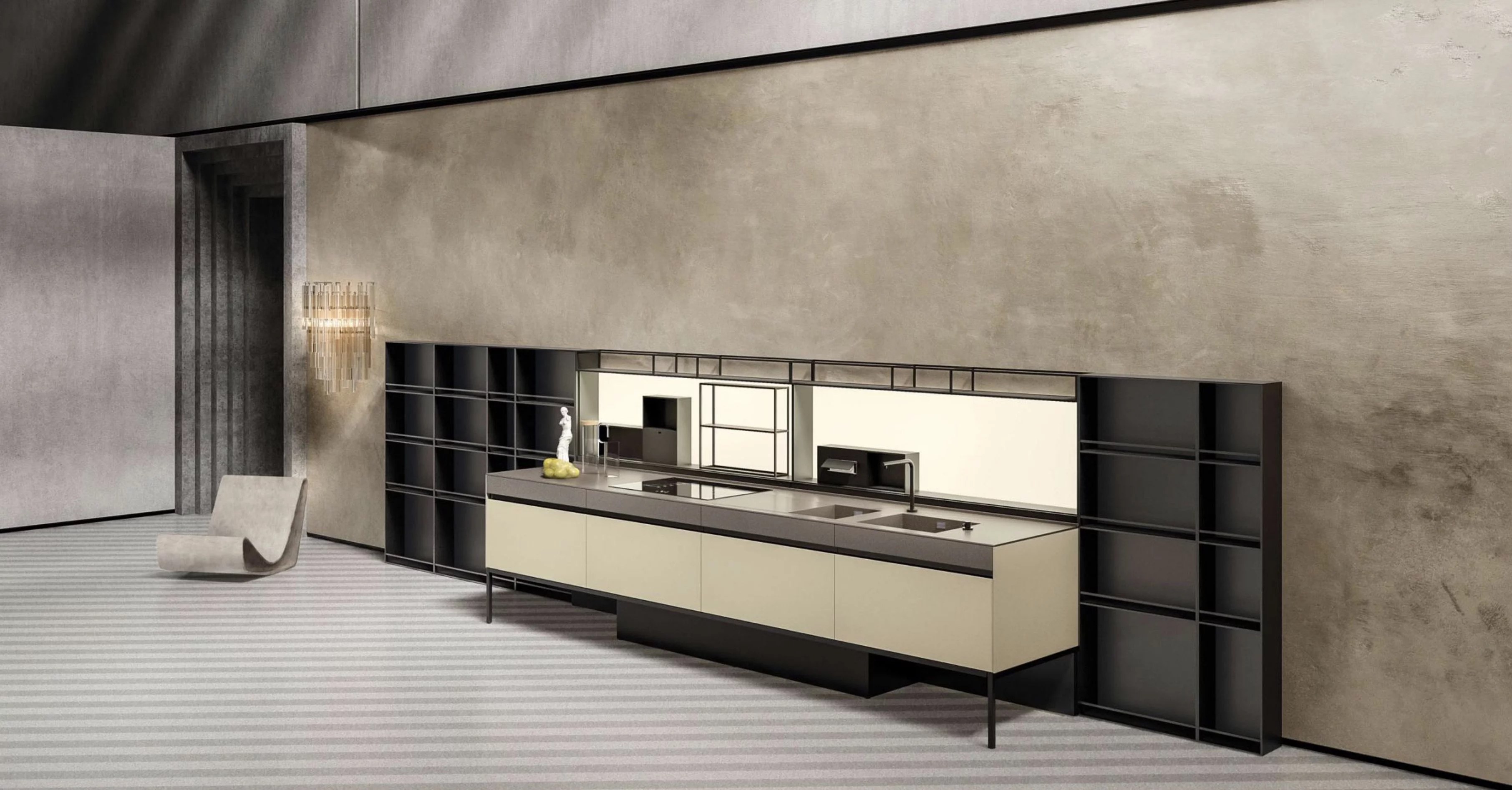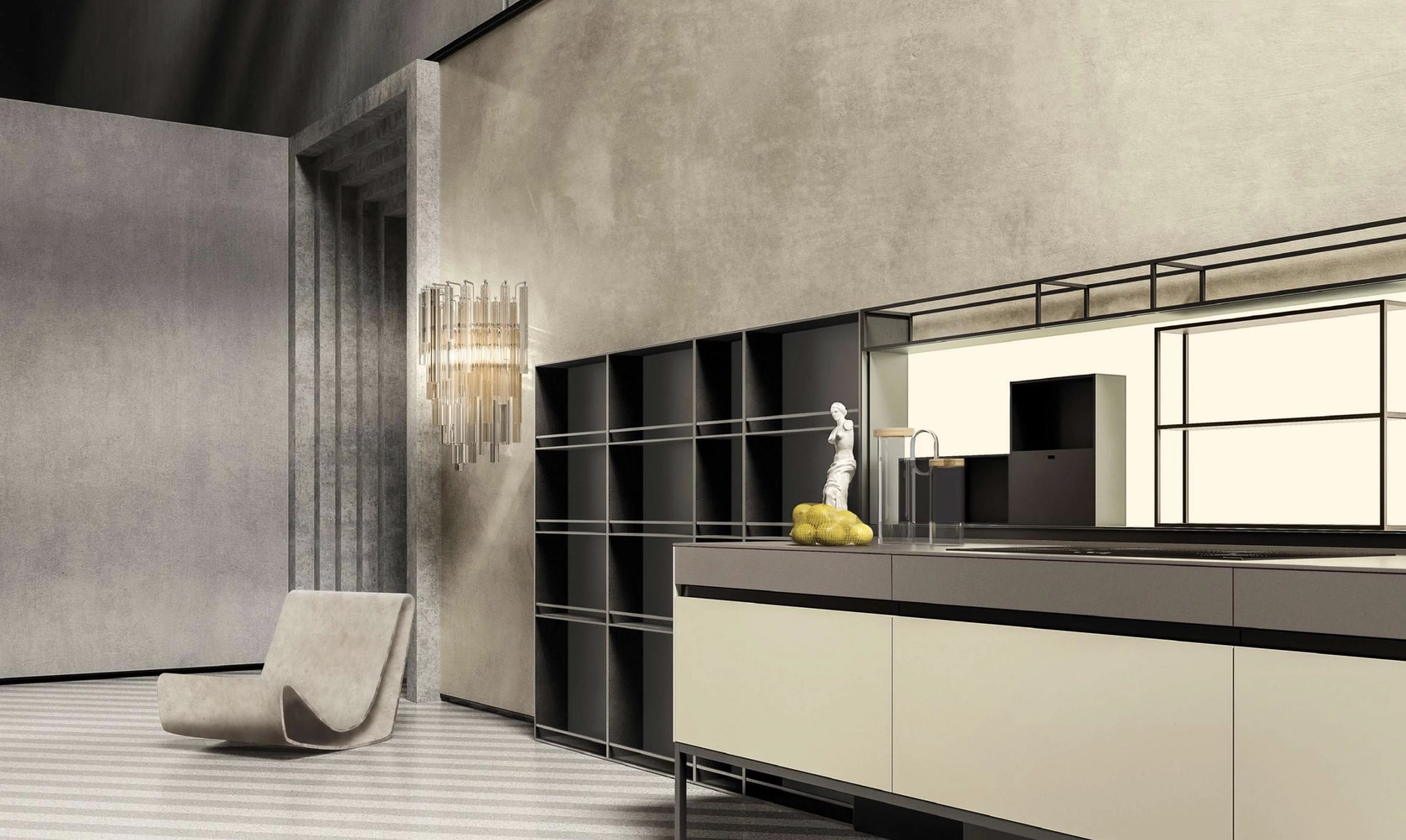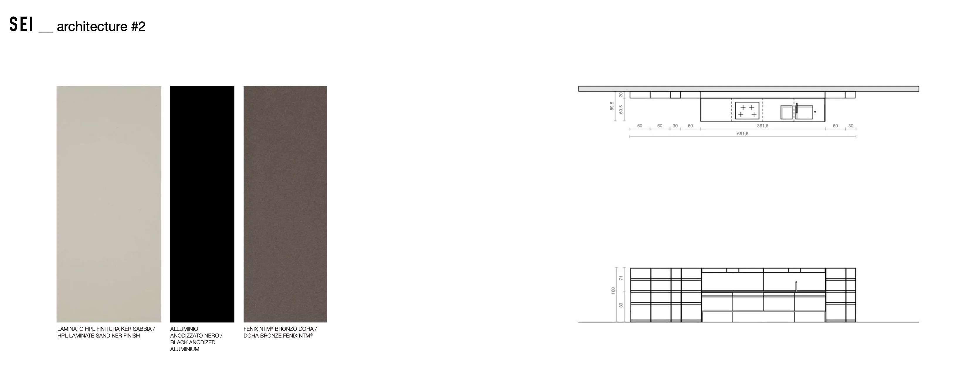Кухня Sei №2 представлена в минималистической цветовой гамме — сочетании белых фасадов и темно-серой системы хранения. Перпендикулярно рабочей области установлена подсветка, придающая пространству приятную атмосферу. Передняя часть острова базируется на тонких ножках.