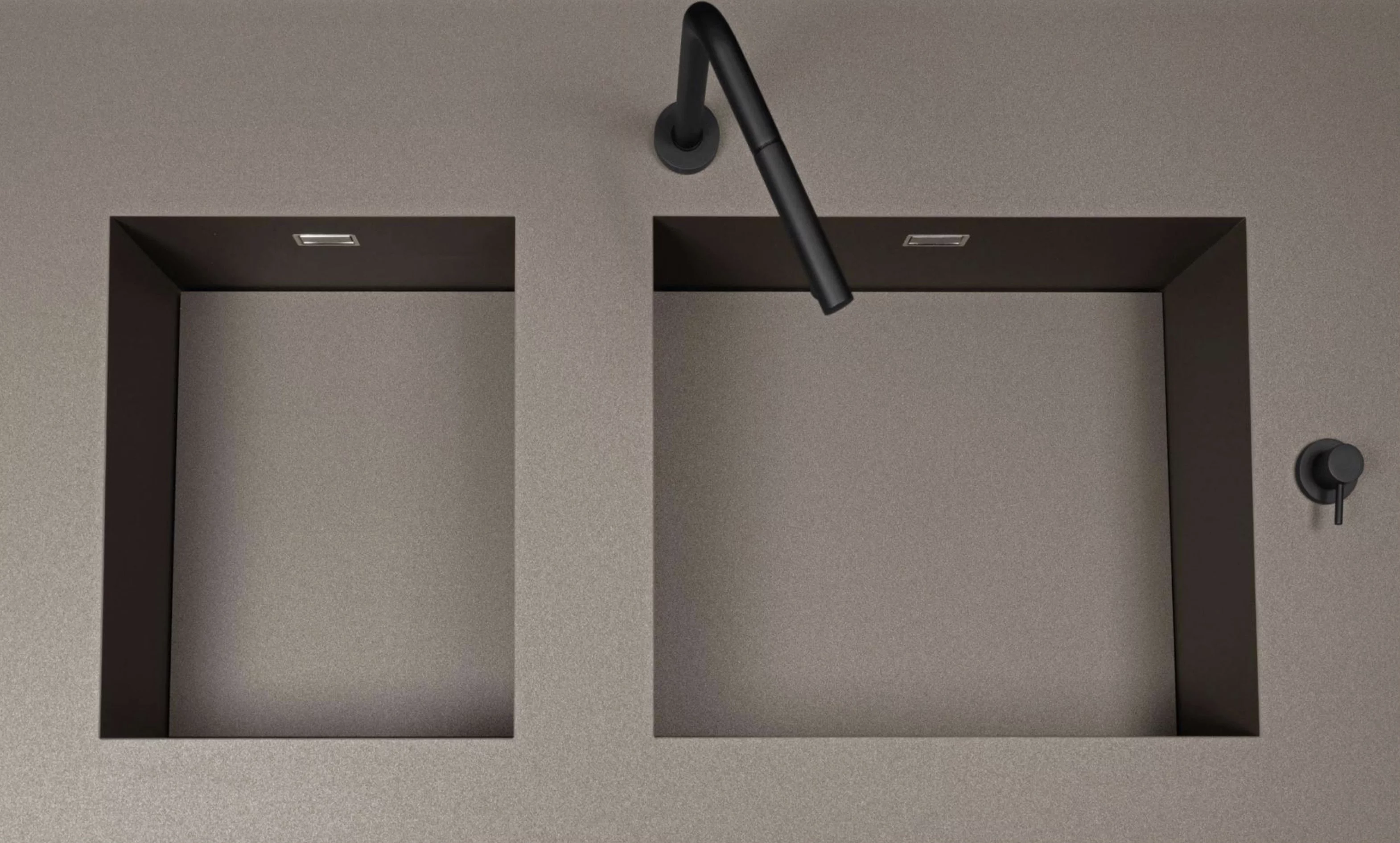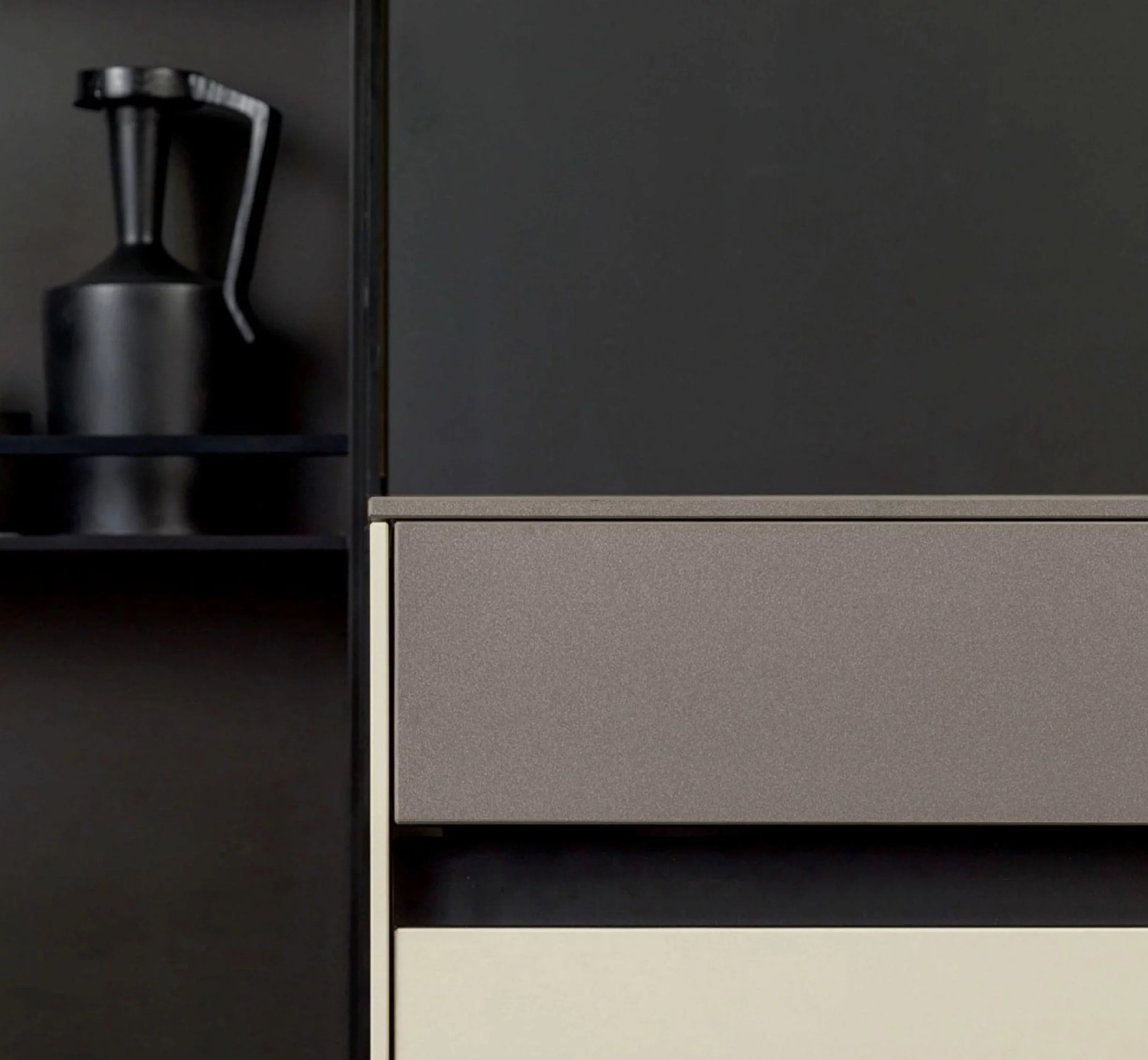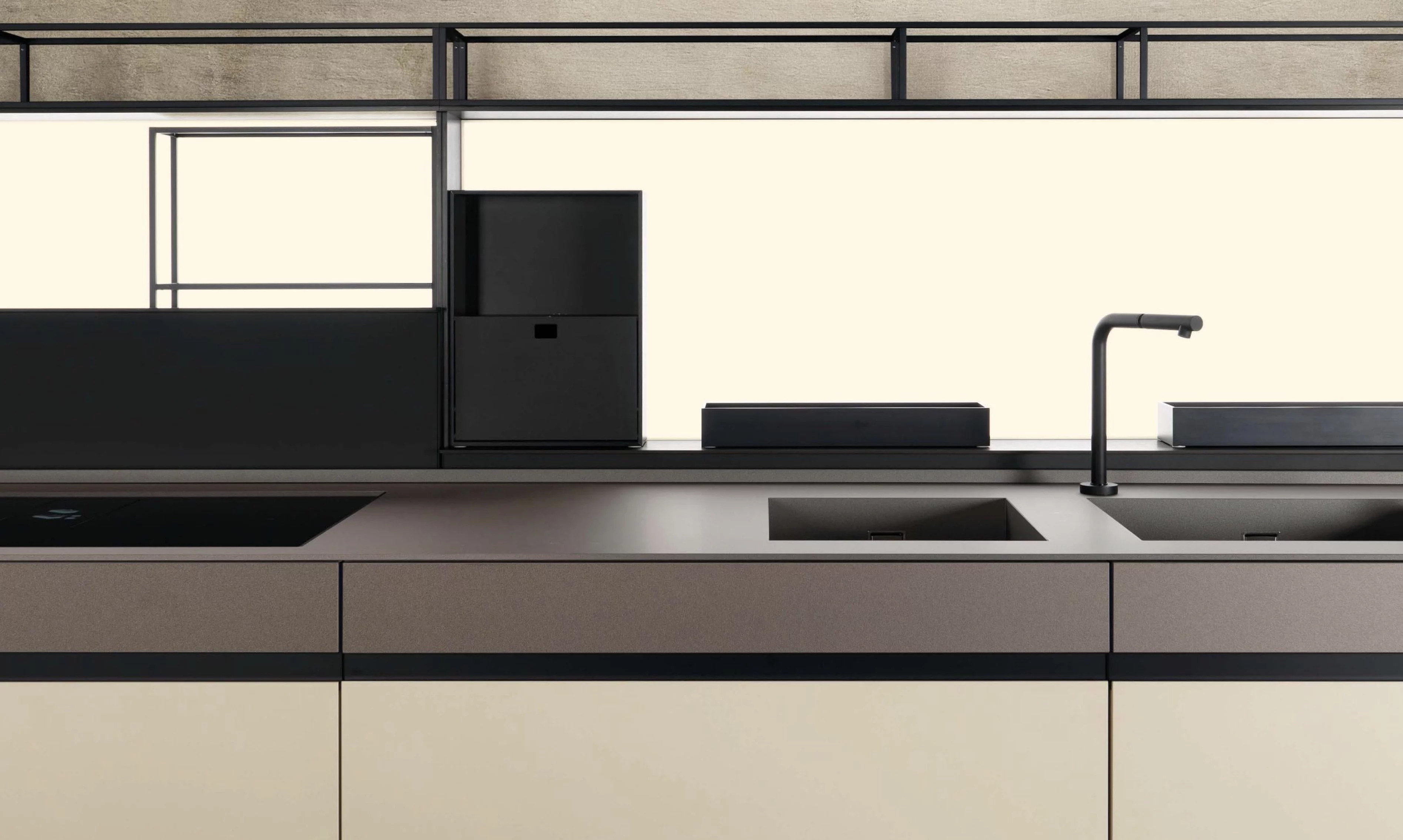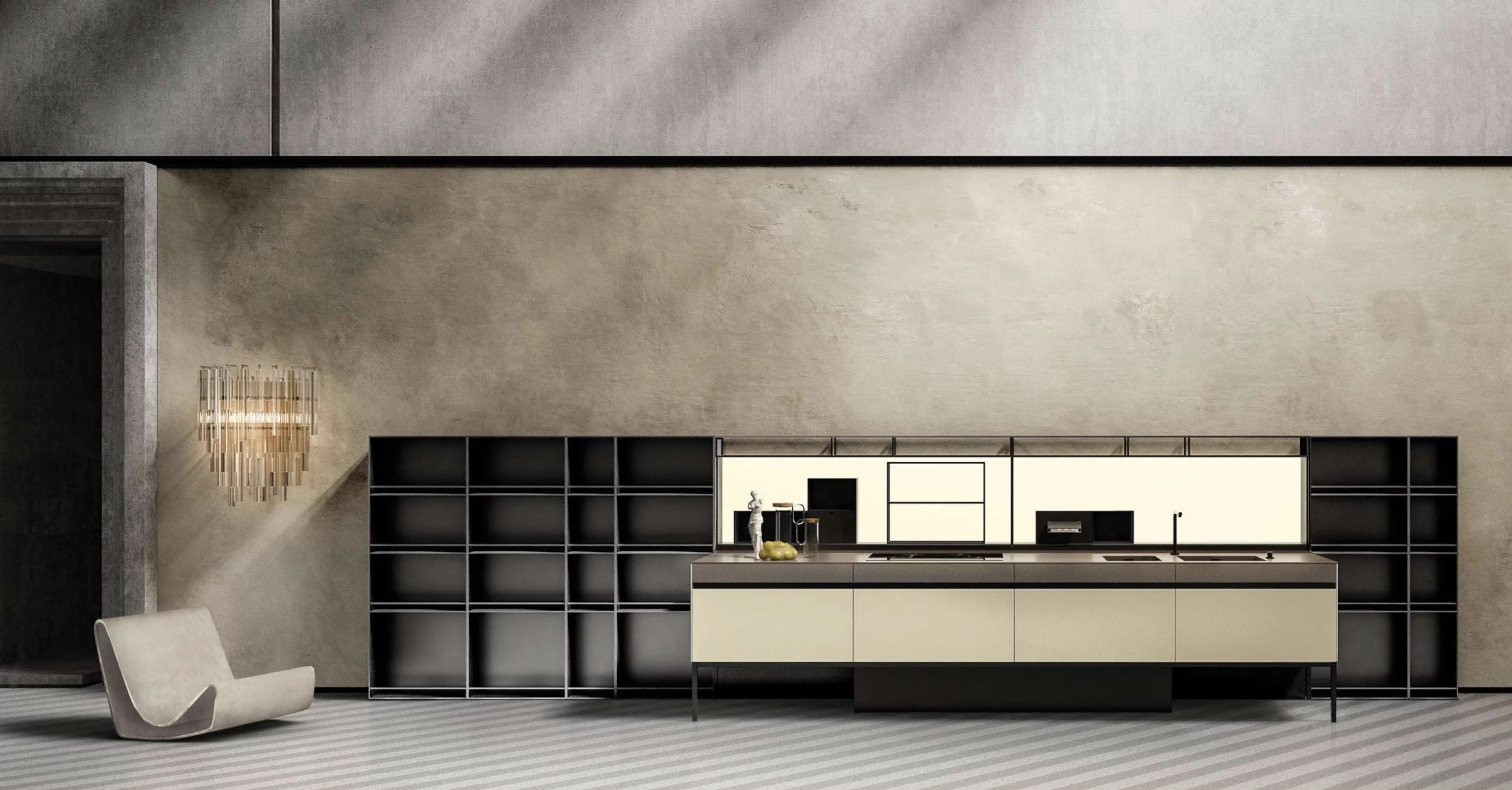 Кухня Sei №2 представлена в минималистической цветовой гамме — сочетании белых фасадов и темно-серой системы хранения. Перпендикулярно рабочей области установлена подсветка, придающая пространству приятную атмосферу. Передняя часть острова базируется на тонких ножках.