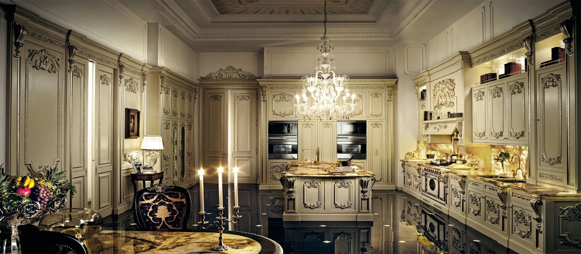 Функциональность повышается за счет применения профессиональных кухонной техники, а также автоматизации мебели: характерны вращающиеся полки шкафов и движущиеся пилястры. Ониксовые поверхности оригинального стола и просторного острова имеют внутреннюю подсветку светодиодами, что позволяет кухне действительно сверкать.
