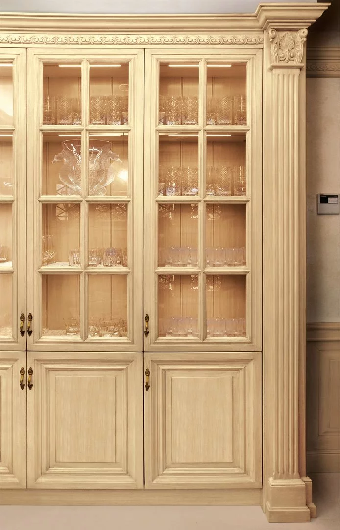 Кухня Diamond от итальянского производителя элитной мебели Faoma оправдывает свое название роскошью и совершенством. Лакировка цвета слоновой кости придает уют, а декорирование панелей и входного портала покрытыми орнаментами из сусального серебра ручной работы добавляет шика и великолепия.