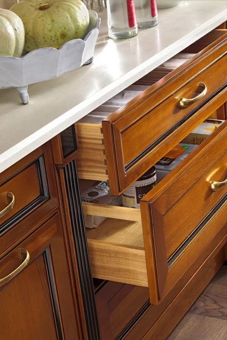 Кухня Milano обладает вместительными модулями, широкими выдвижными ящиками и отделениями для встроенной техники. Некоторые дверцы гарнитура декорированы прозрачным стеклом, за которым возможно эффектно расположить изысканный сервиз.