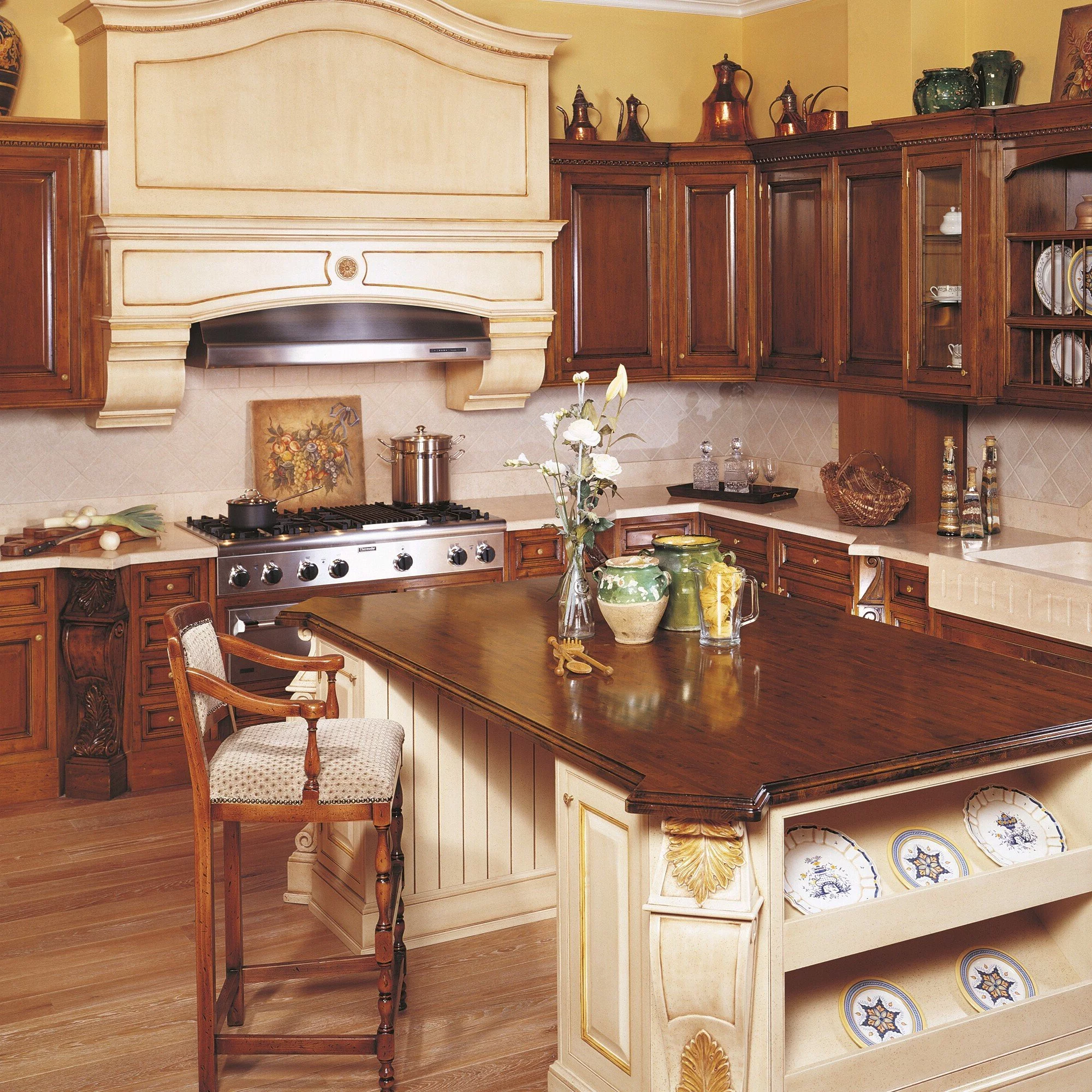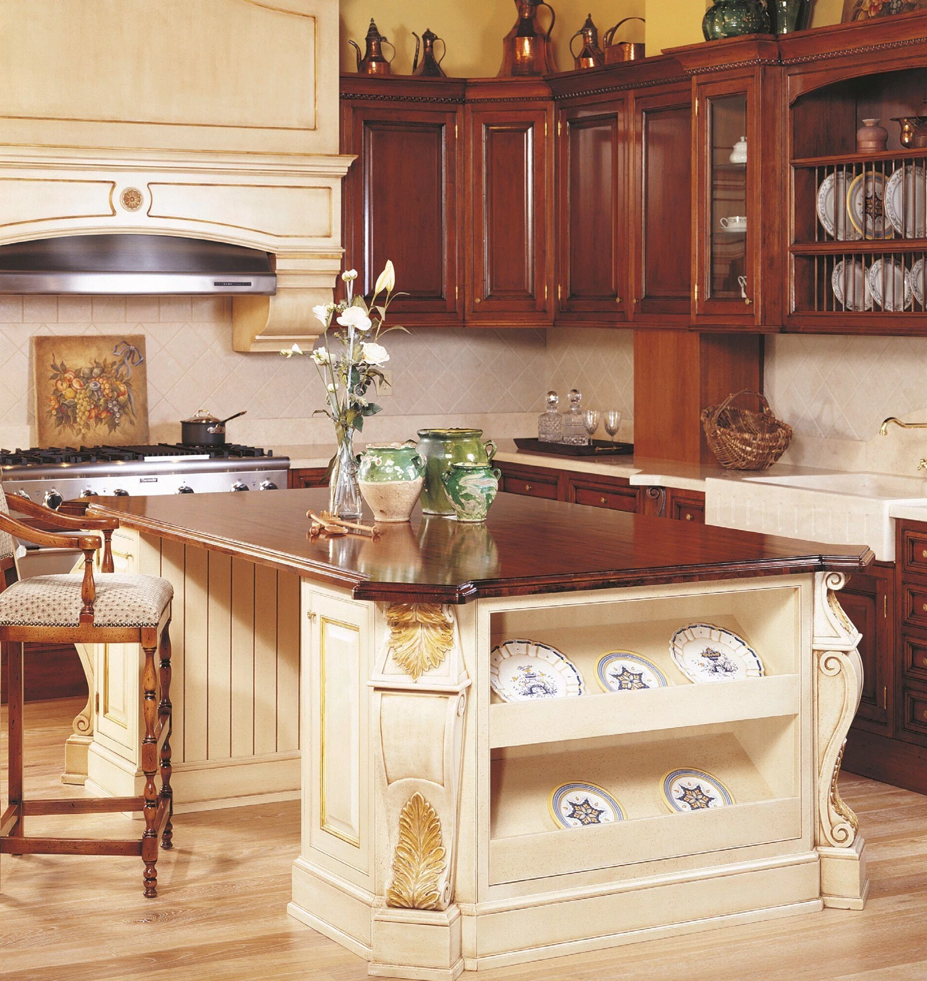 Весь уют и комфорт загородного дома передаст кухня Country от итальянского бренда Francesco Molon. Модель выполнена в отделке тёмного и светлого дерева, где ярко прослеживается природный рисунок древесины. Декоративная резьба по дереву украшена золотым патинированием.