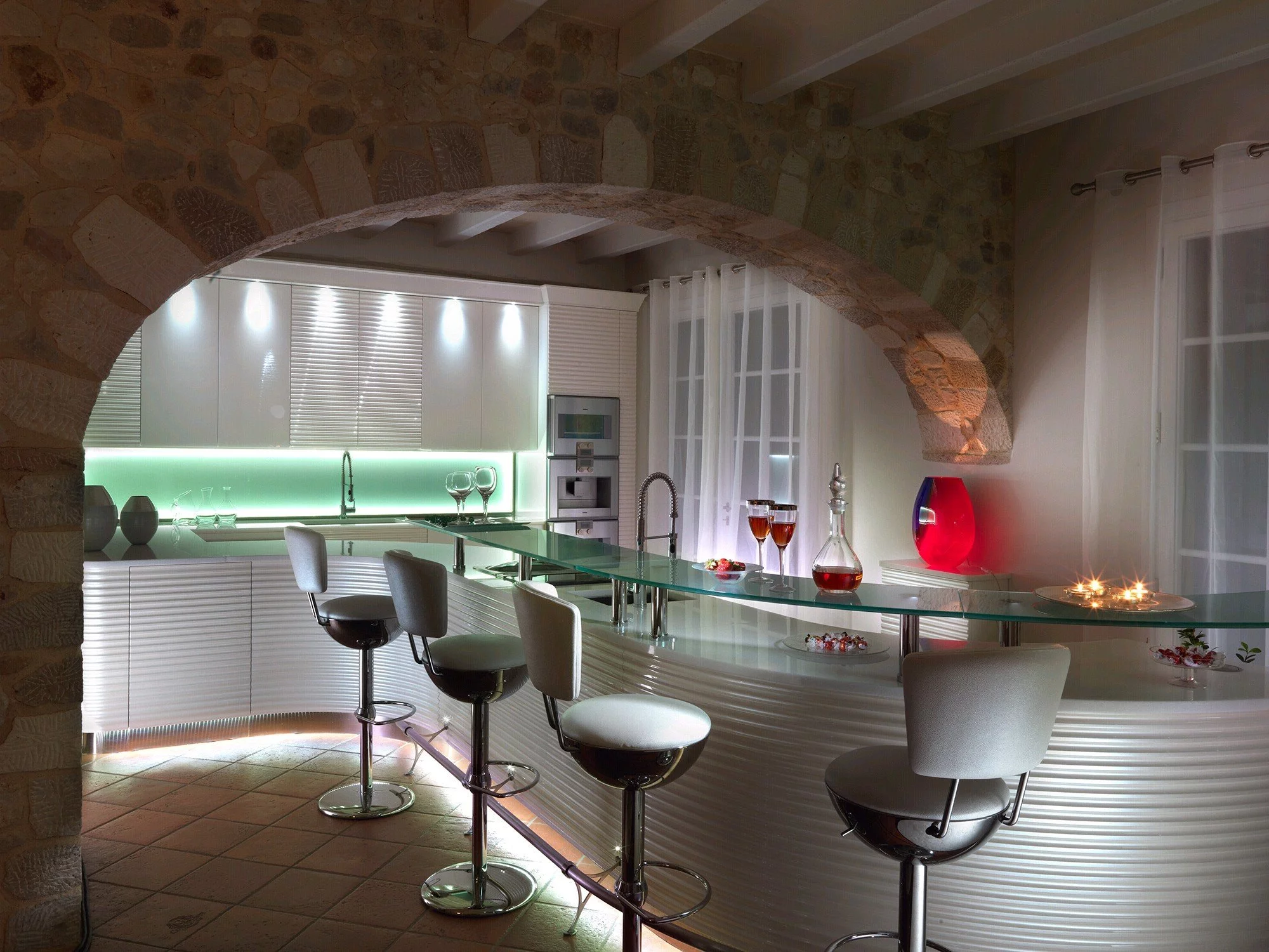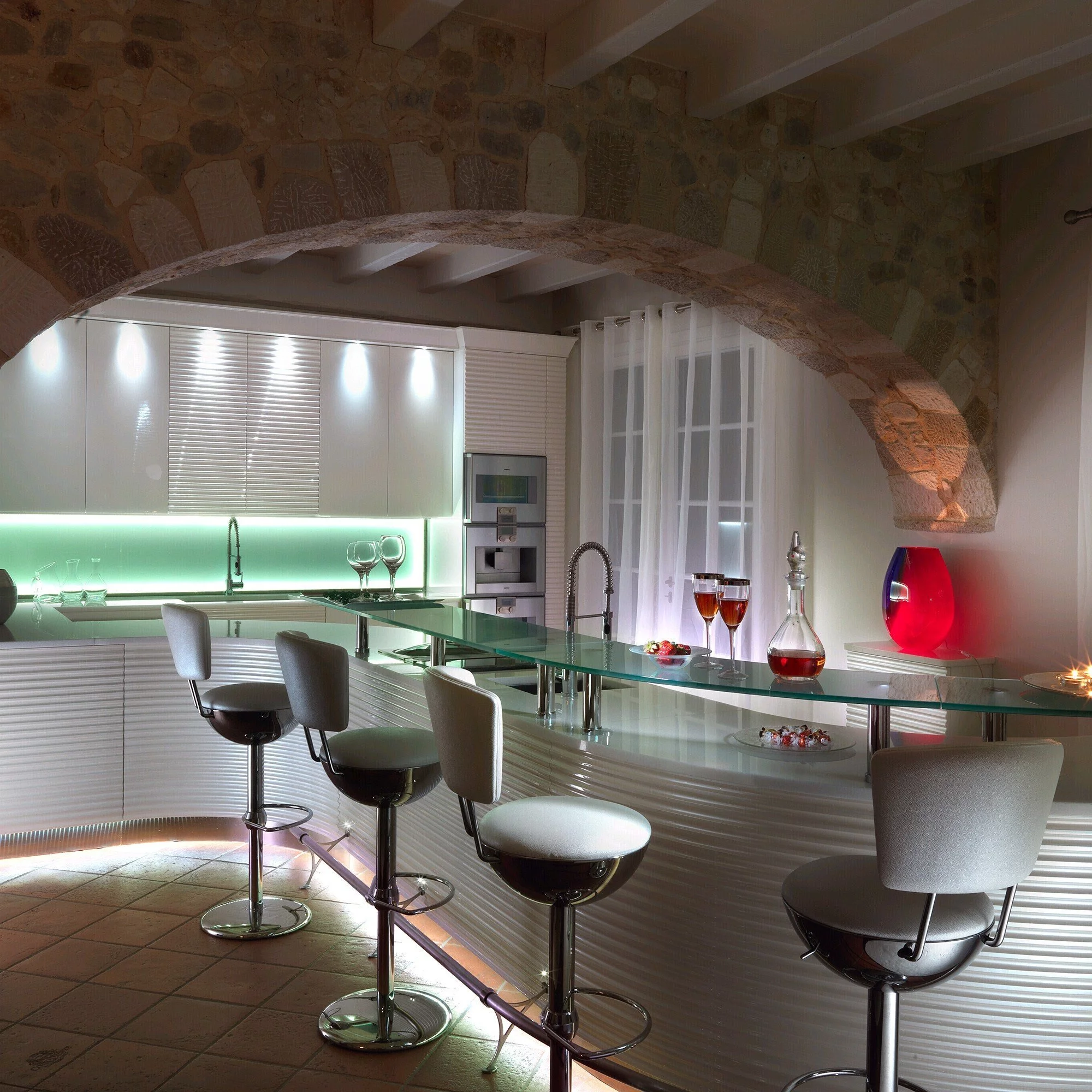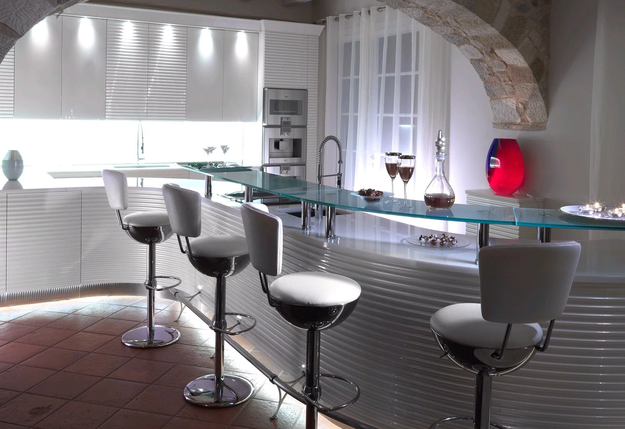 Эклектическая кухня Perla от итальянской фабрики Francesco Molon отличается оригинальным дизайном и современной изогнутой столешницей. Дополнительно очарование модели придаёт контраст света и тени на заднем фоне изделия и интегрированная светодиодная подсветка.