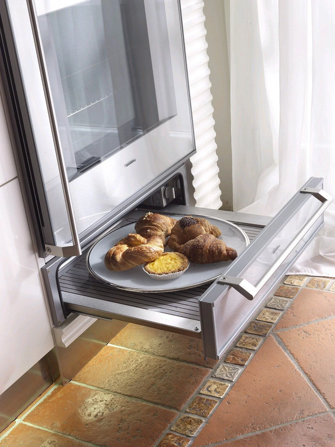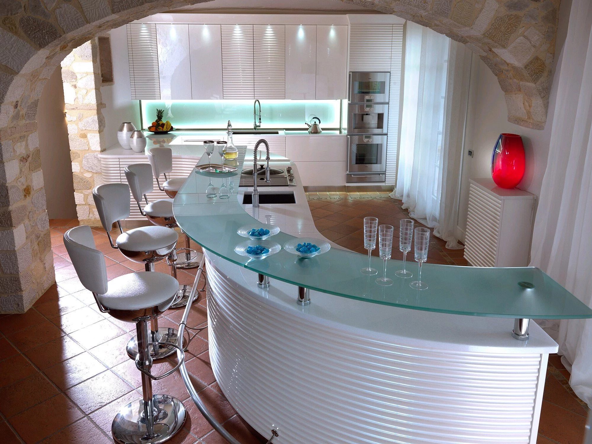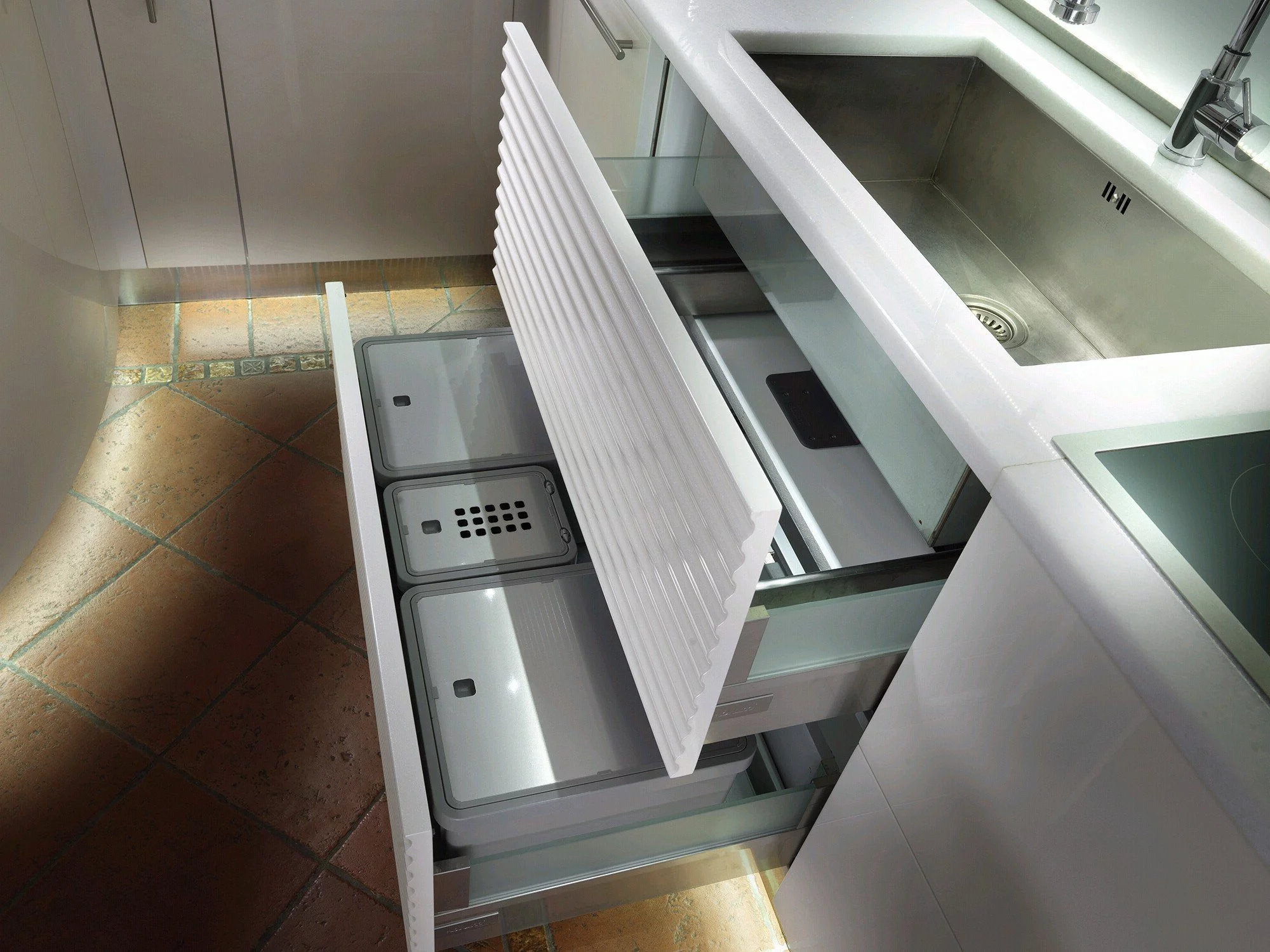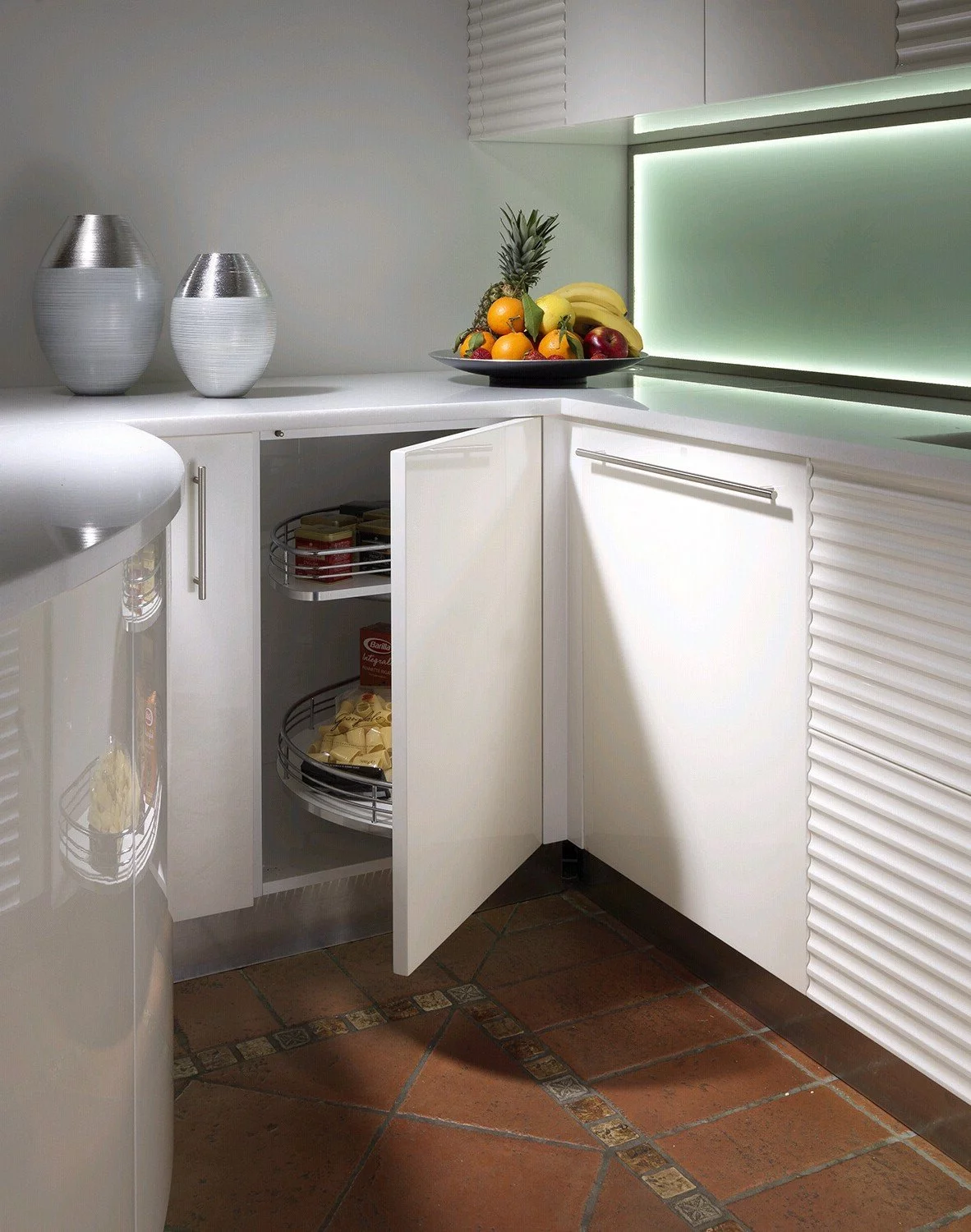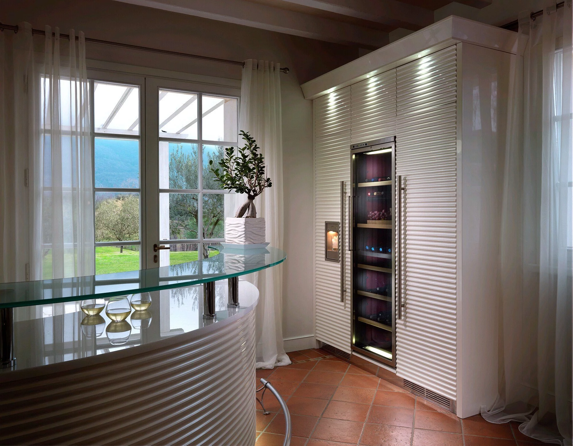 Фасады кухни Perla характеризуются двумя видами текстур: ребристой и гладкой. Кроме этого, фронты выполнены из натурального массива тополя с лаковым покрытием. Скрытые ручки дополняют стиль классического арт-деко. На изогнутом модульном элементе кухни установлена дополнительная столешница из матового закаленного стекла.