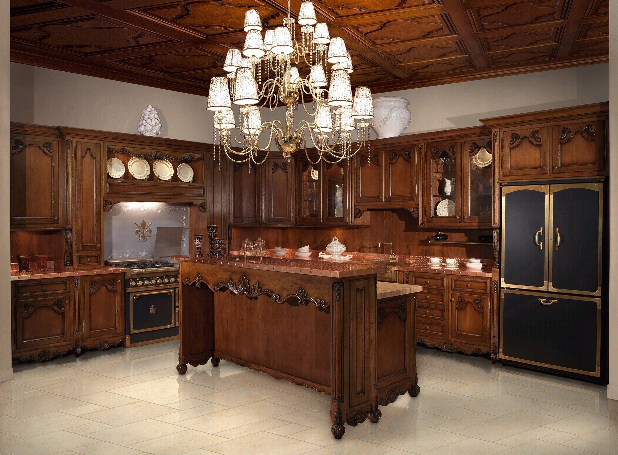 Как и многие модели итальянской фабрики Francesco Molon, кухня Provence предлагается в комплектации с автономным островом, который с одной стороны дополнен барной стойкой. Кроме этого, этот модульный элемент представляет собой систему хранения и место для приготовления блюда. Вся необходимая бытовая техника легко может быть скрыта в высоких шкафах с глухими фасадами.