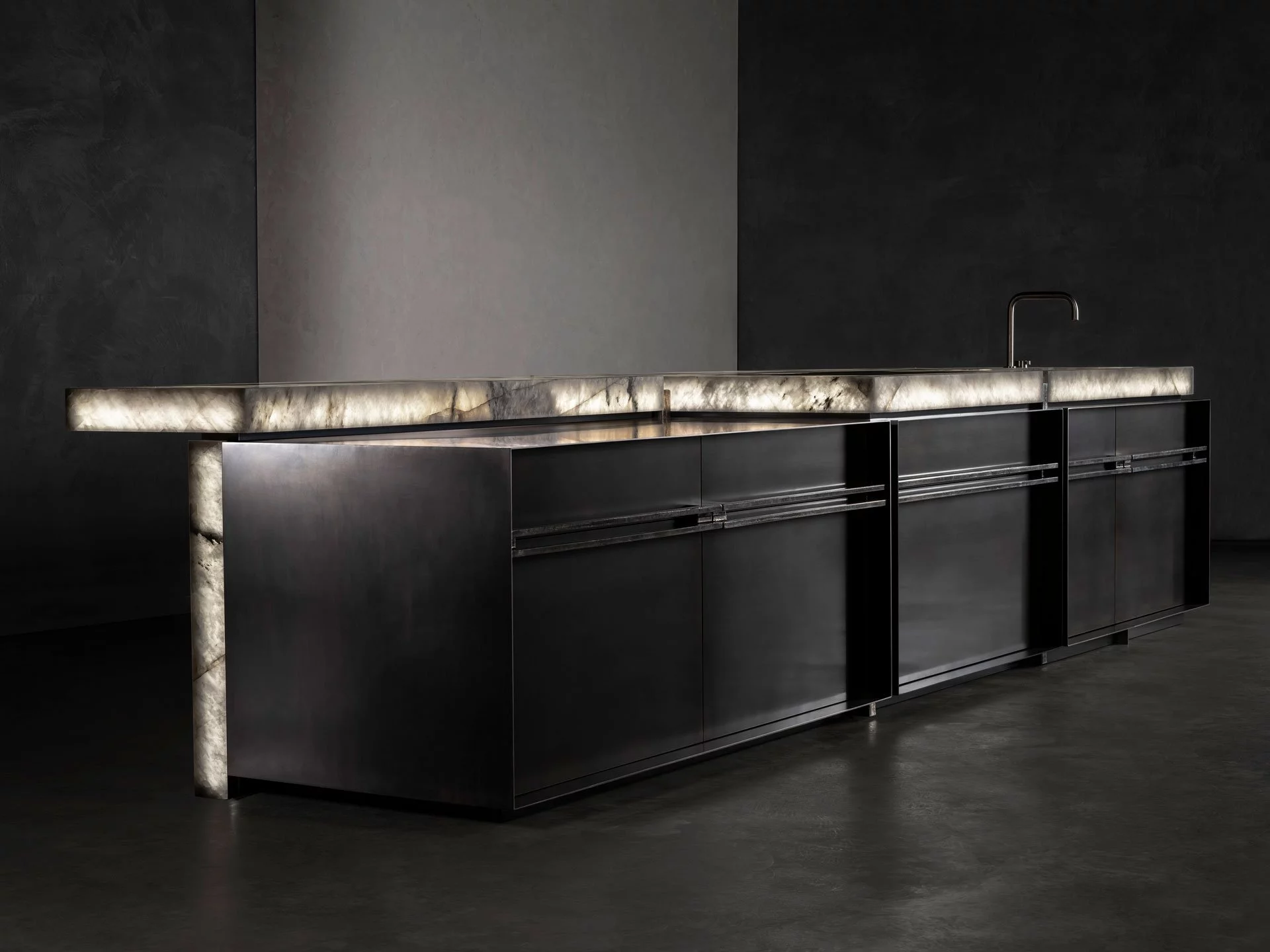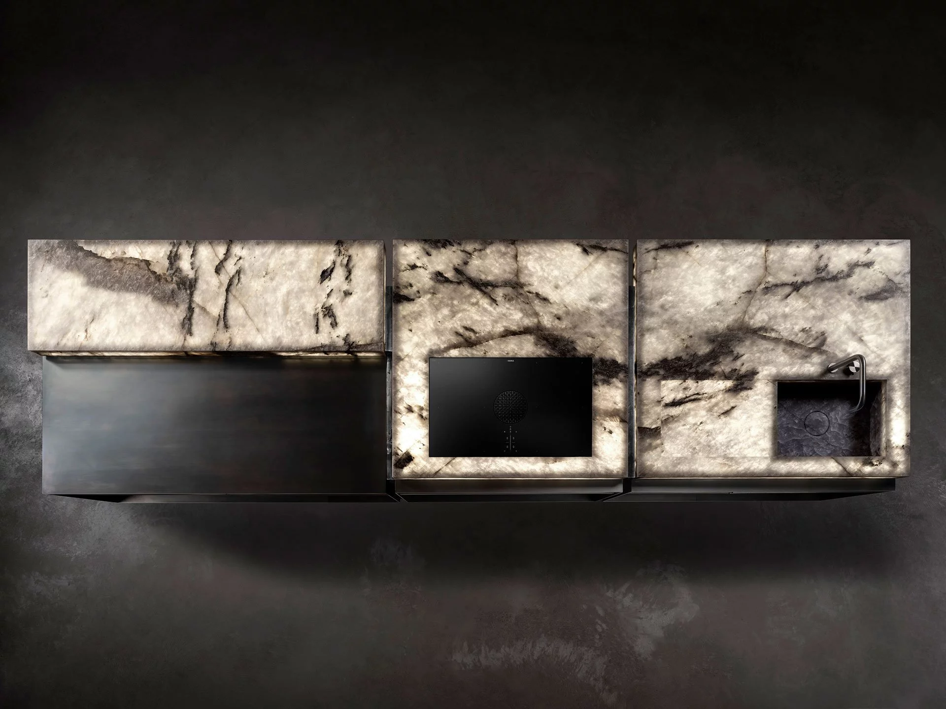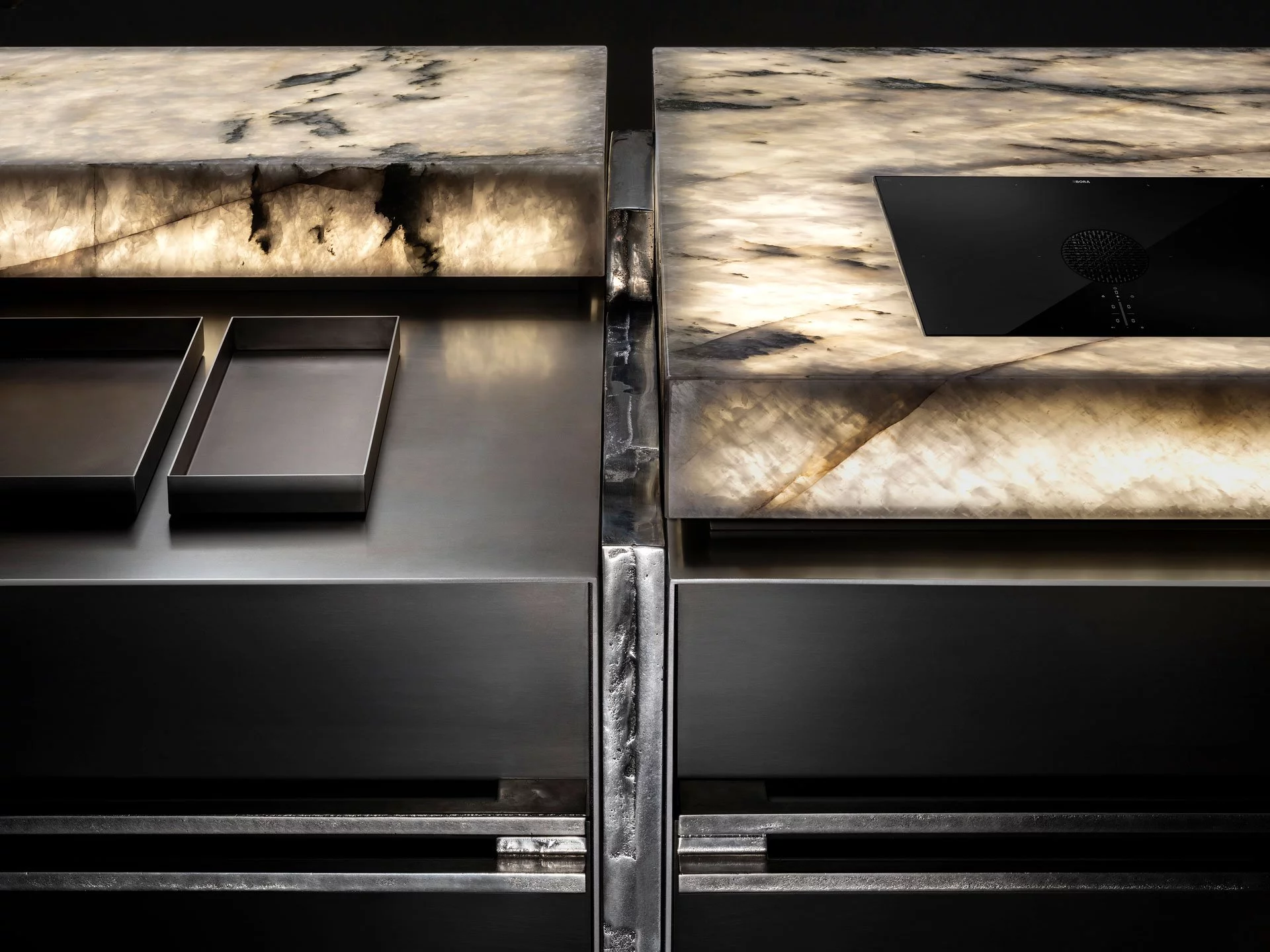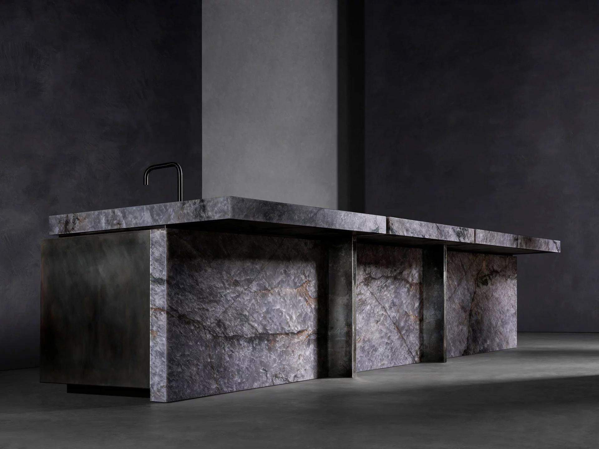 AIR K - это не просто кухонный модуль, а выразительный дизайнерский объект, в котором контраст становится главным художественным приемом. Натуральный камень с его глубиной и светонепроницаемостью эффектно сочетается с четкой геометрией металлических элементов, создавая баланс между природной мягкостью и индустриальной строгостью.