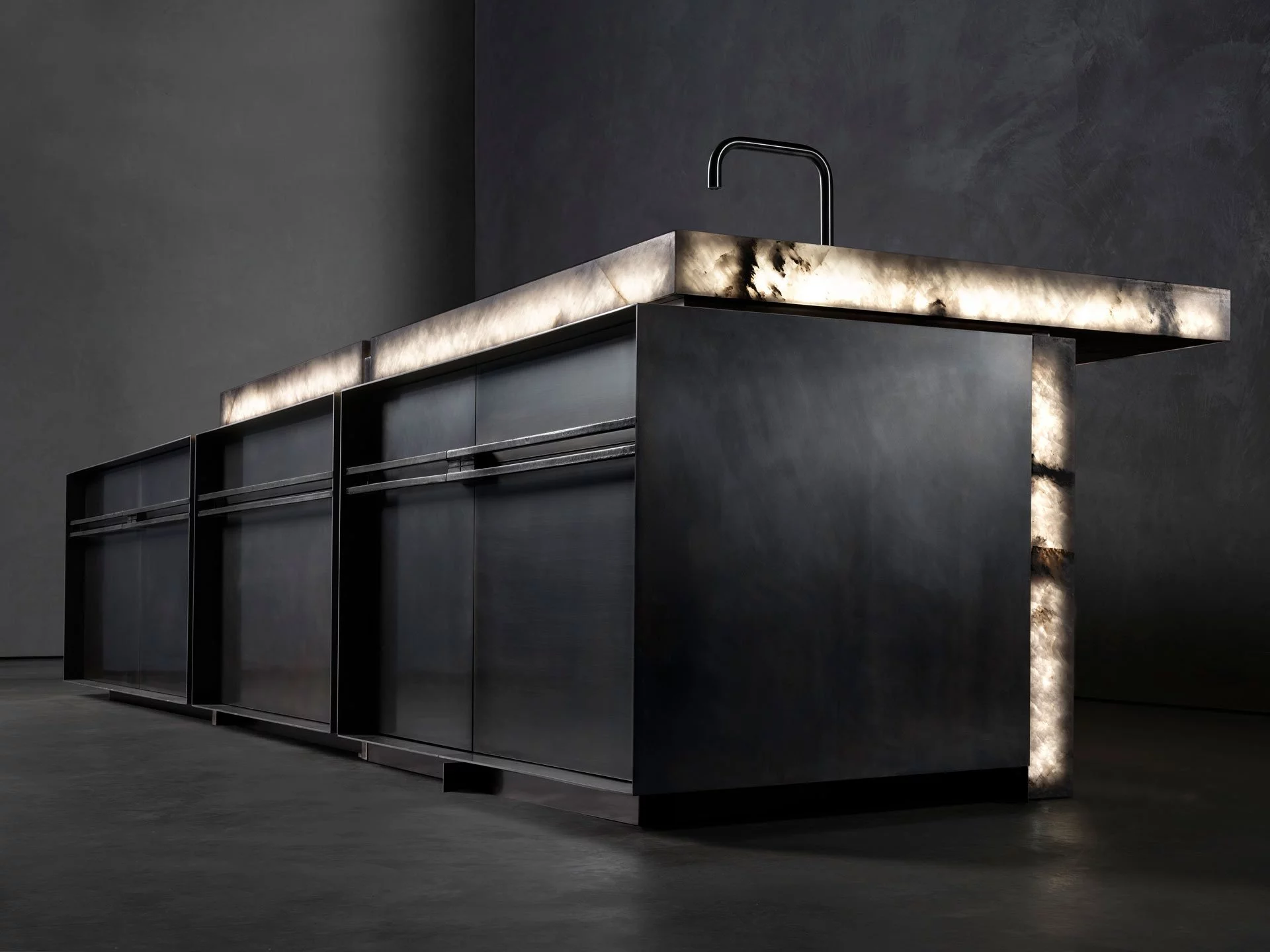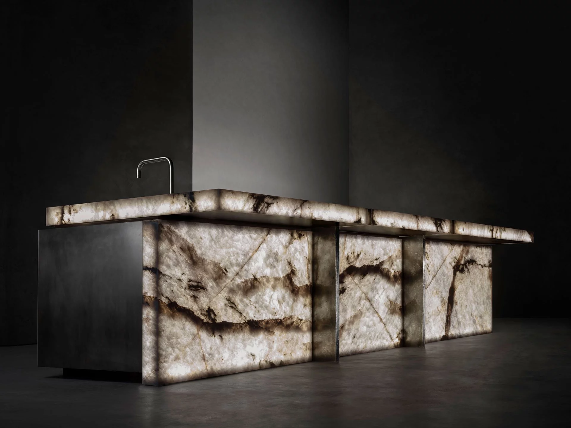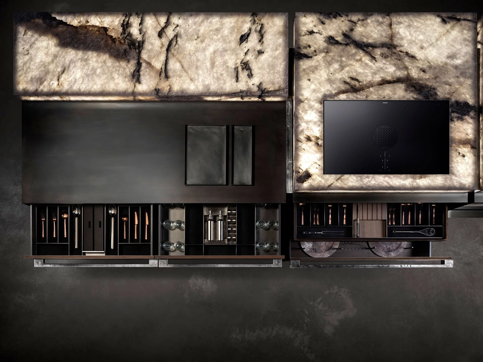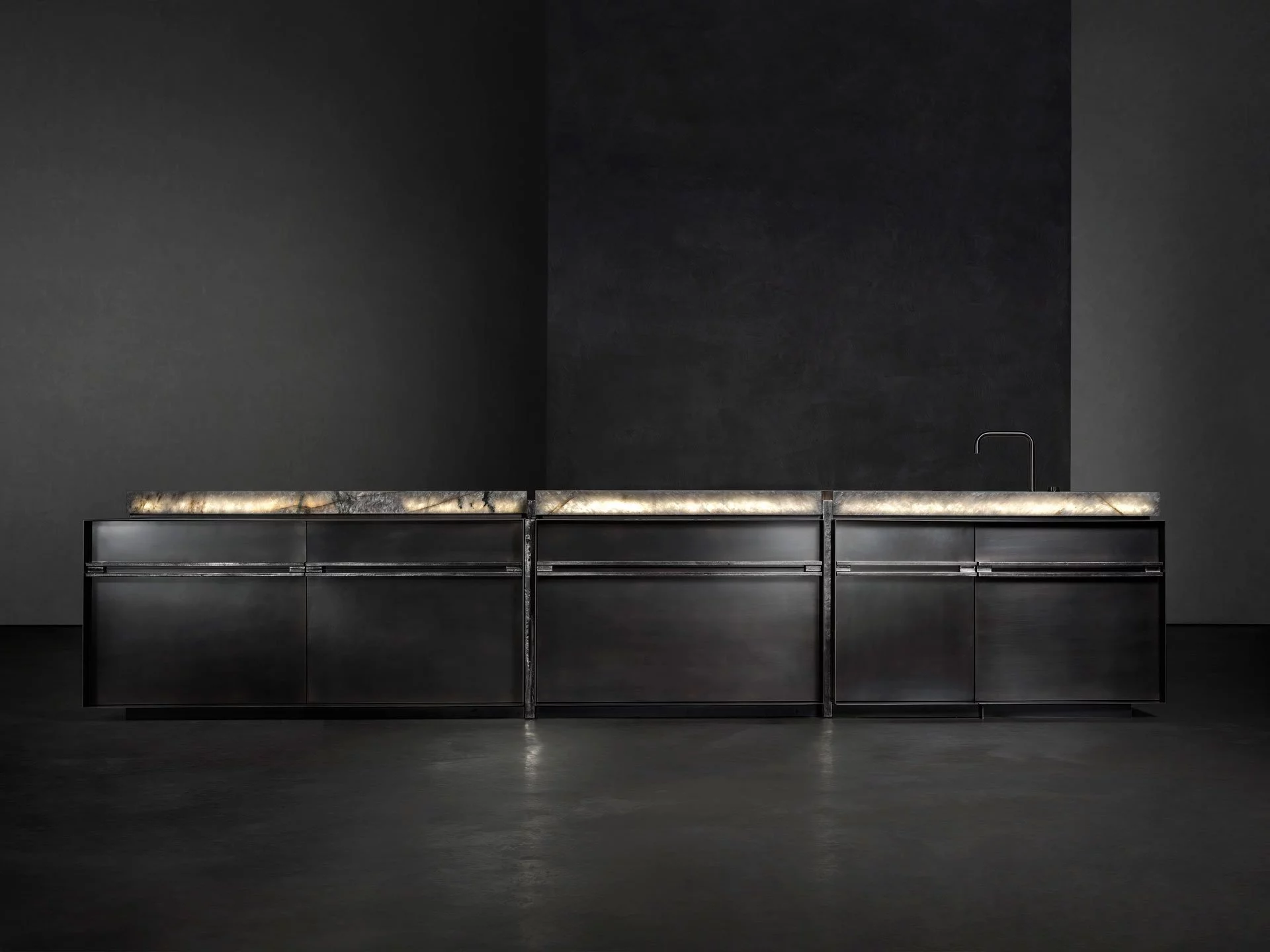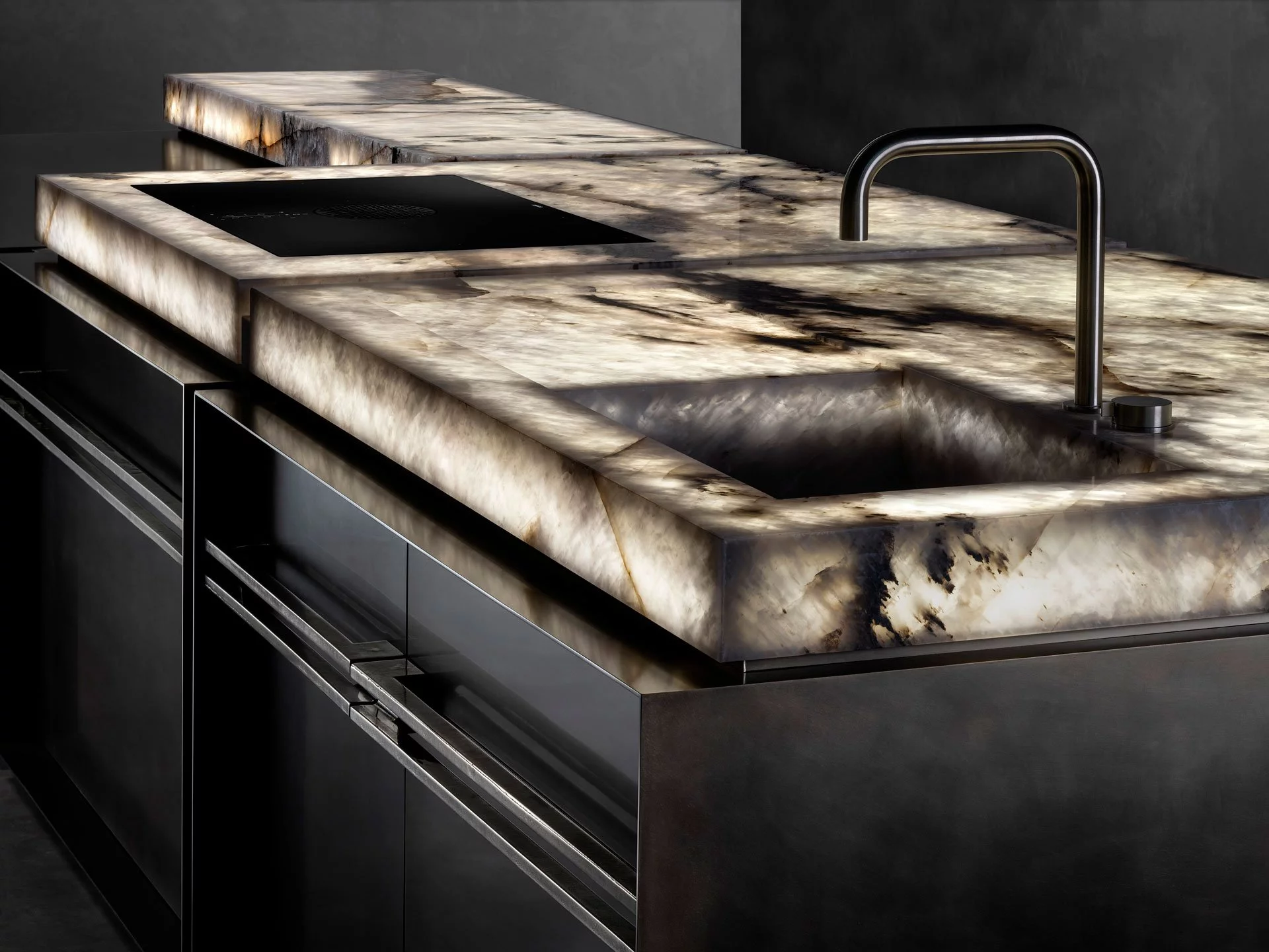AIR K - это не просто кухонный модуль, а выразительный дизайнерский объект, в котором контраст становится главным художественным приемом. Натуральный камень с его глубиной и светонепроницаемостью эффектно сочетается с четкой геометрией металлических элементов, создавая баланс между природной мягкостью и индустриальной строгостью.