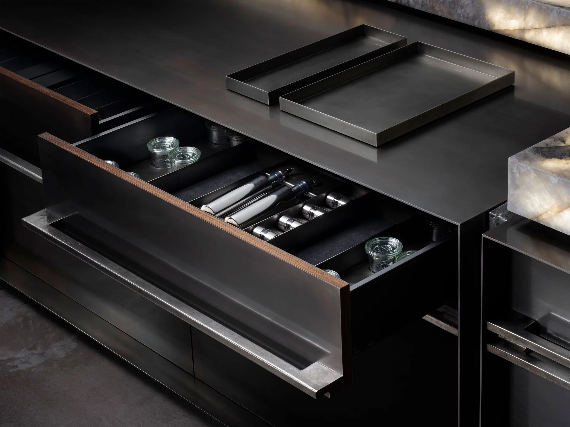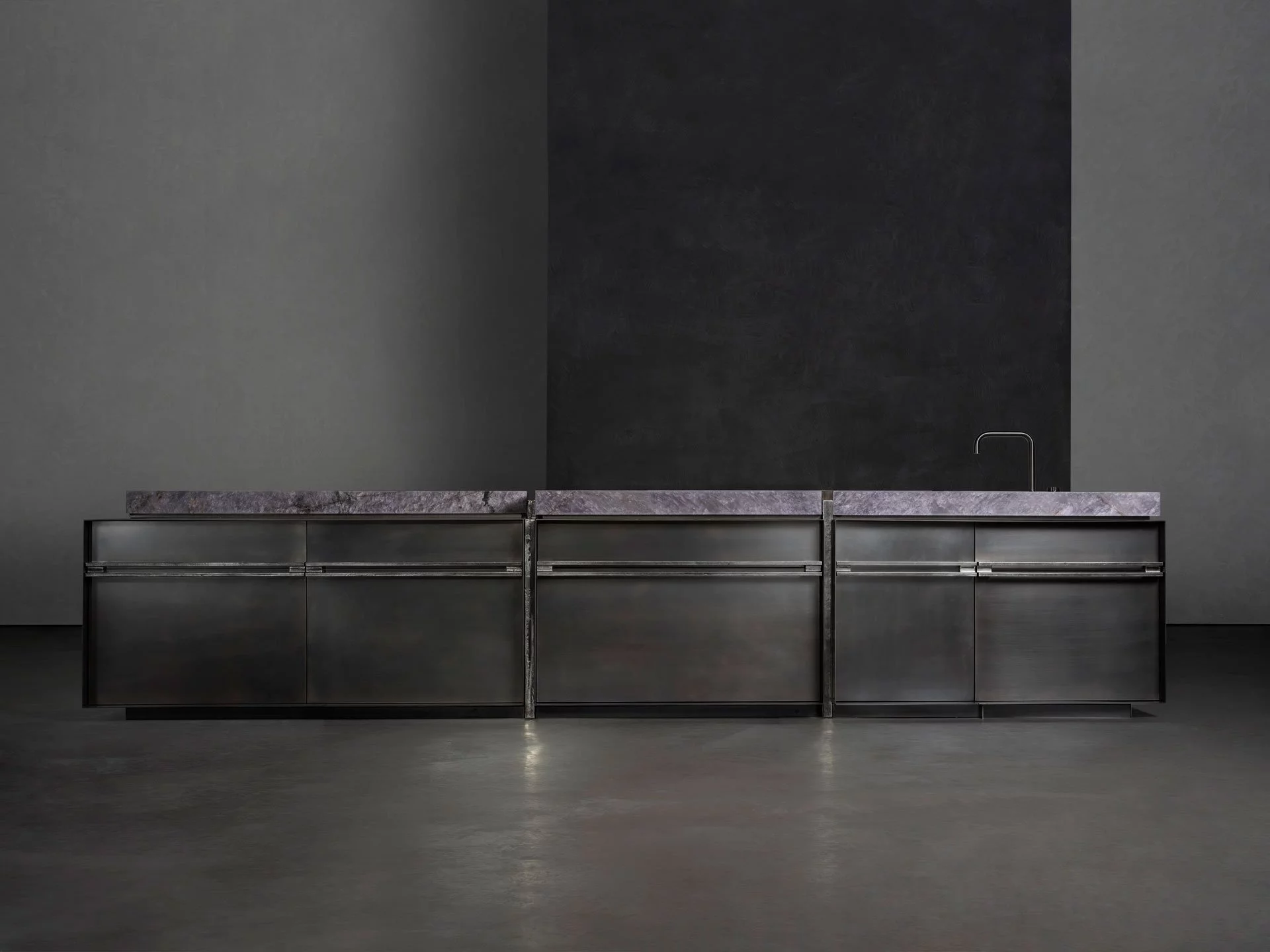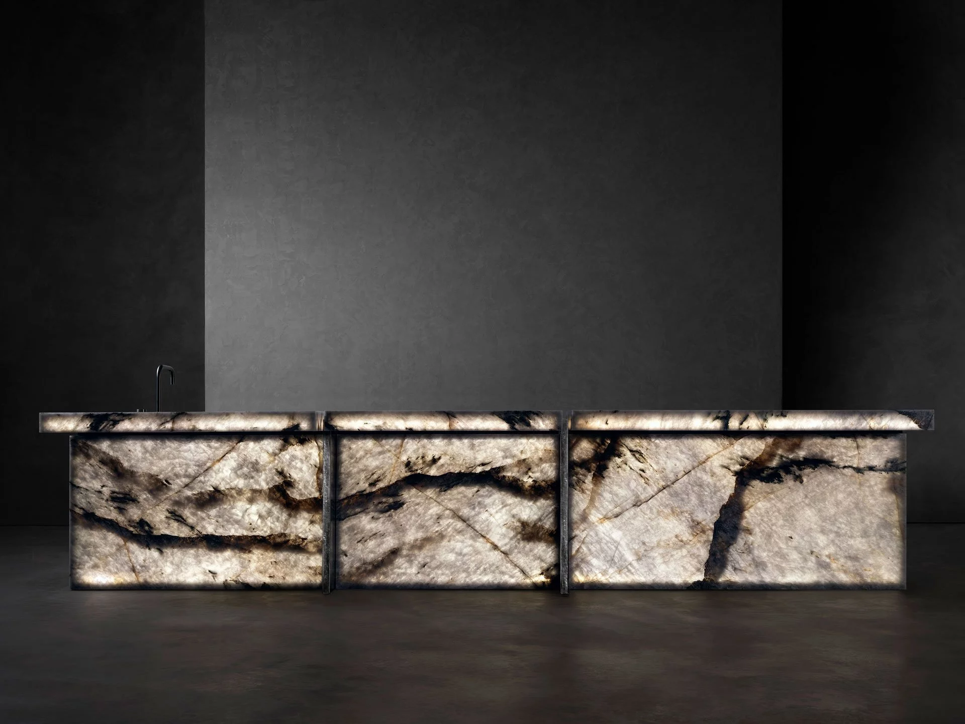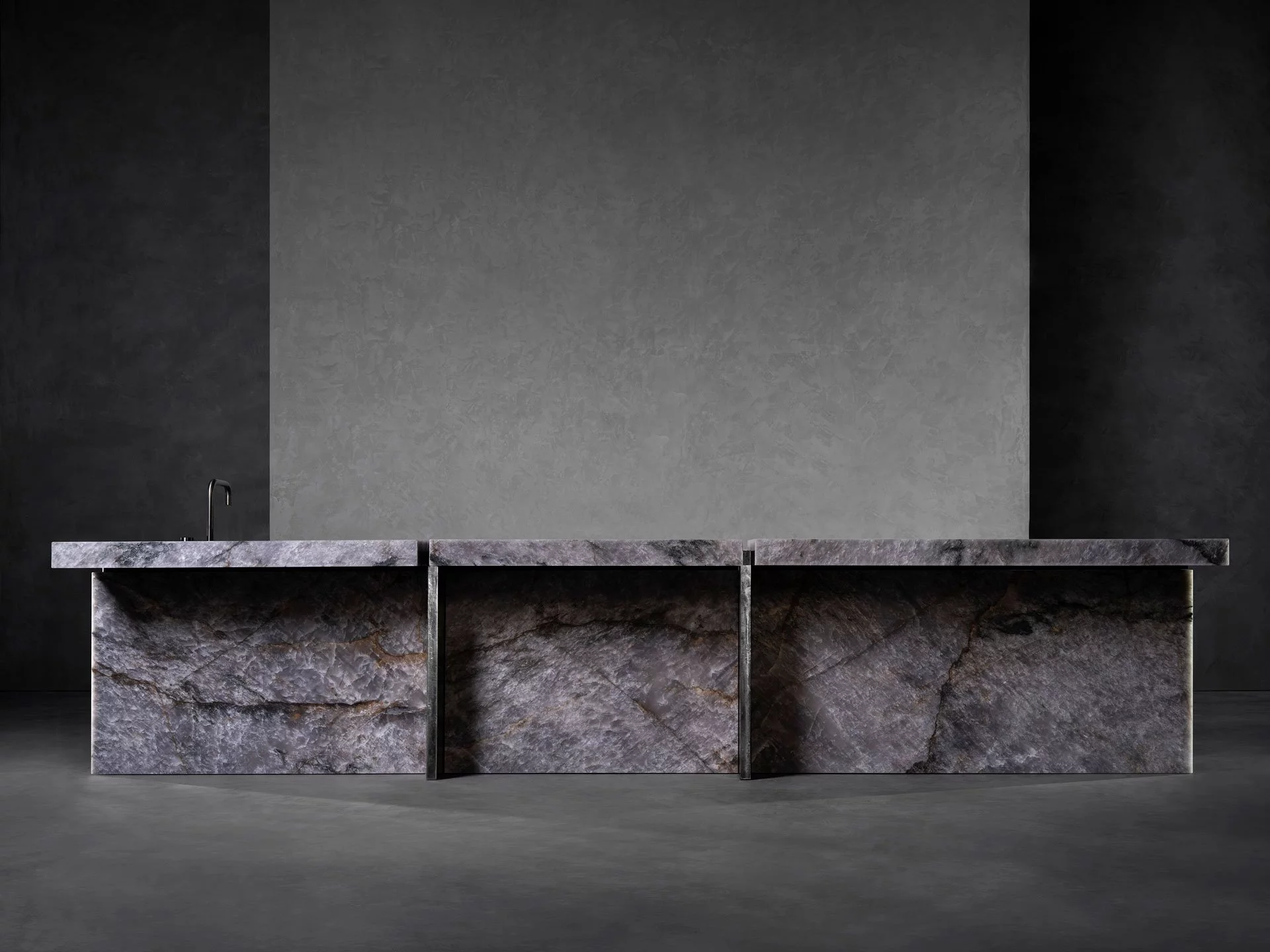 AIR K - это не просто кухонный модуль, а выразительный дизайнерский объект, в котором контраст становится главным художественным приемом. Натуральный камень с его глубиной и светонепроницаемостью эффектно сочетается с четкой геометрией металлических элементов, создавая баланс между природной мягкостью и индустриальной строгостью.