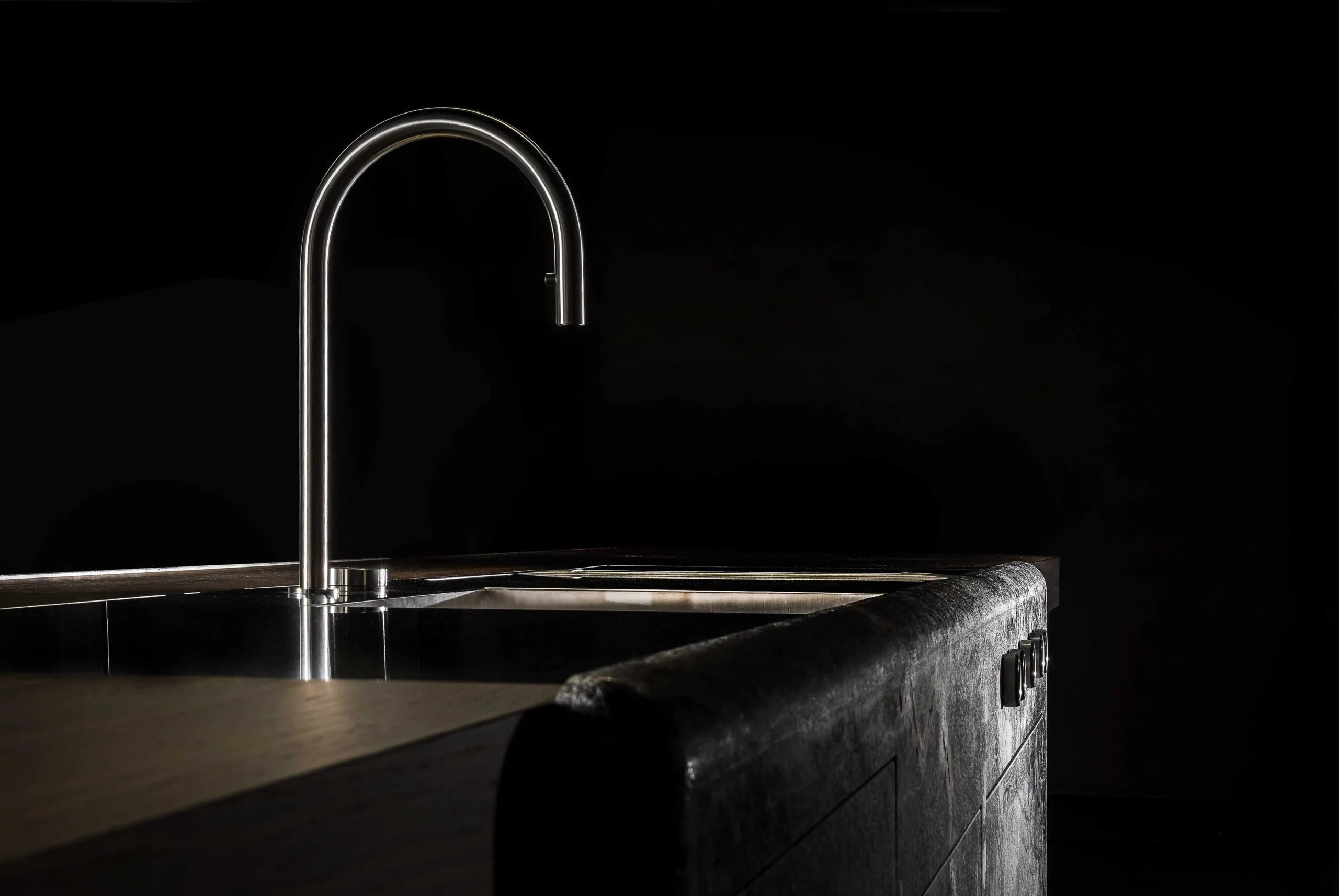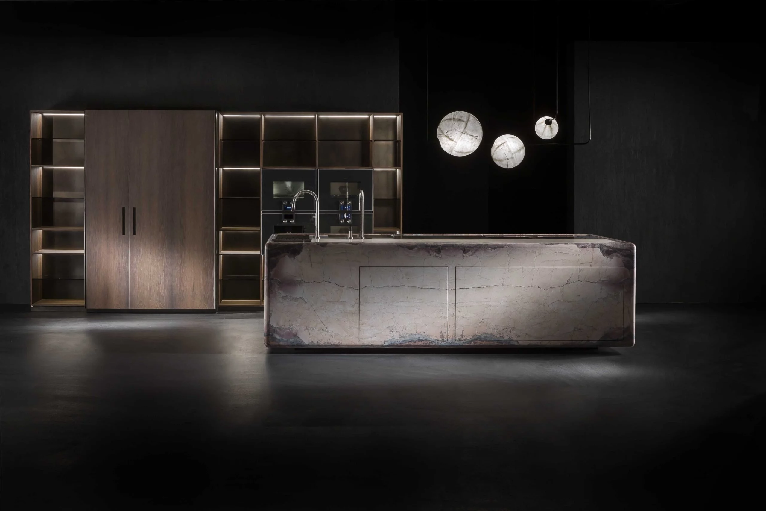 Oneon Kitchen – воплощение уникального мастерства в обработке Ice Onyx, камня, который постоянно удивляет своей виртуозной выразительной мощью. Этот кухонный остров, ставший сердцем общения и главным акцентом современного интерьера, окутан красотой, способной вызвать эмоциональный отклик. На столешнице: Рабочие поверхности Bora и Gaggenau. Отделки: натуральный камень, металл и шпон. Могут быть изменены. Ящики: Ящики из термодревесины с электрическим механизмом мягкого открывания и закрывания. Доступные варианты: термообработанный дуб и ясень болотный оливковый. Каркас: Матовая черная фанера. Цоколь: Нержавеющая сталь или брашированный титан высотой 6 или 1см. Аксессуары: Металлические лотки, держатель для столовых приборов, дренажная решетка, разделочная доска, кожаные подставки.