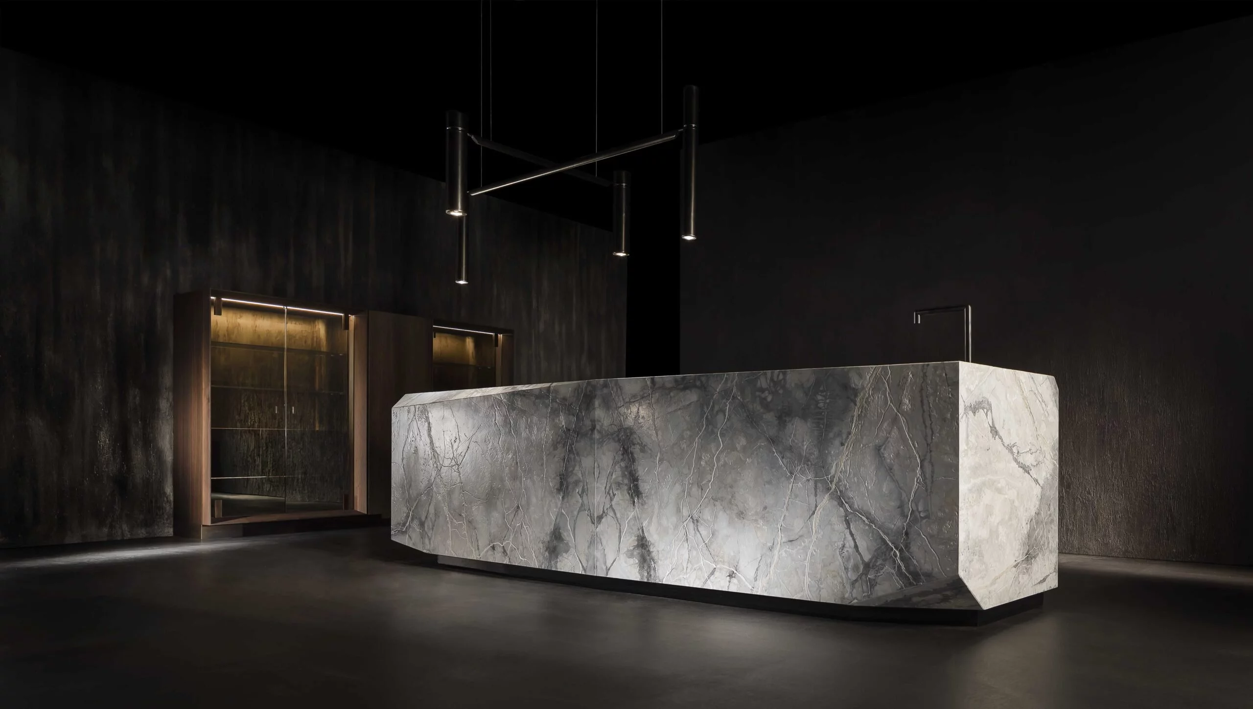 Кухня Ozone - изумительный монолит, сформированный из двух граненых блоков натурального камня, Бречча Медичеа, с мягкой перламутрово-розовой окраской, воплощает в себе суть и изысканную элегантность острова Ozone — совершенного сочетания функциональности и эстетики, ядро нового взгляда на общественность и социальные взаимоотношения.