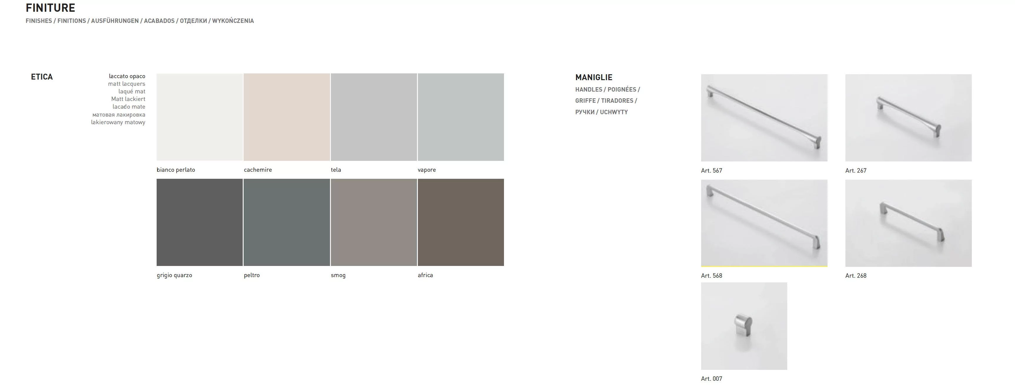 Кухня Etica состоит рабочей зоны-острова, который с противоположной стороны дополнен деревянной столешницей в виде барной стойки. В этой модели явно прослеживается идея быстрого приготовления блюд, сопровождаемое разговорами с членами семьи или друзьями. Кроме этого, изделие включает в себя систему хранения с глухими и стеклянными фасадами, а также по усмотрению заказчика — обеденный деревянный стол и стулья.