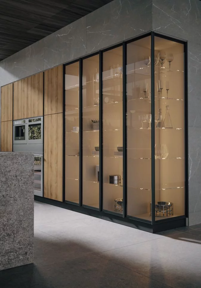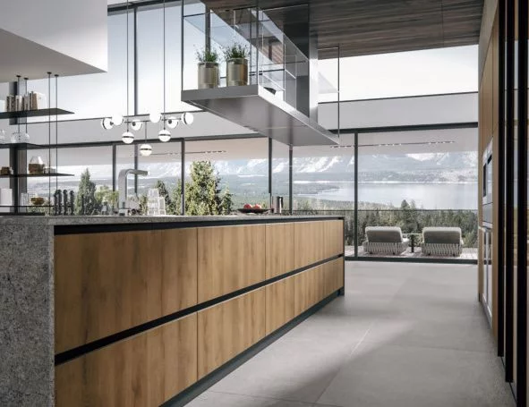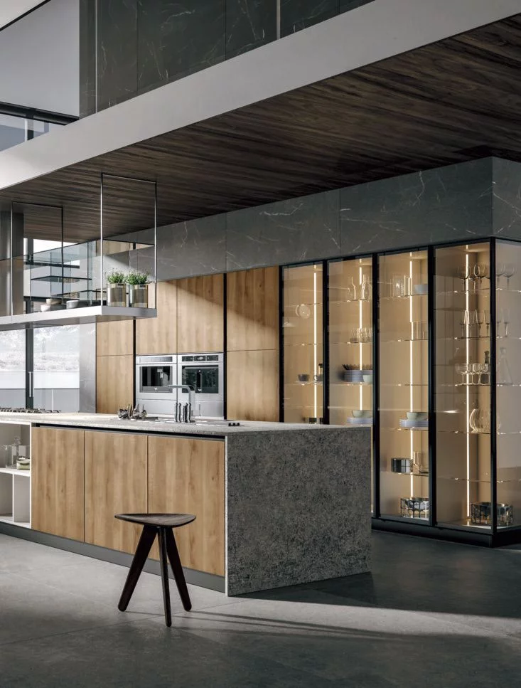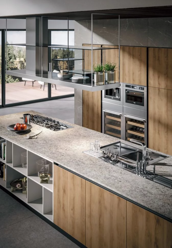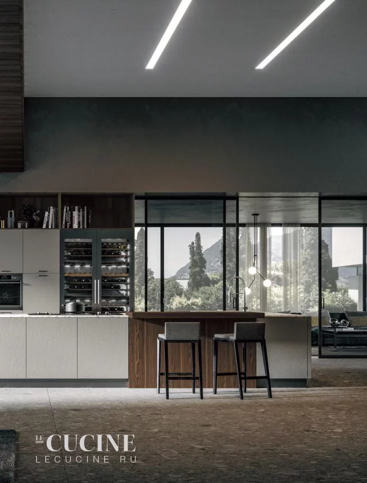 Рабочий остров кухни Genesi представлен в угловом или прямом вариантах, вмещает в себя мойку, варочную поверхность и зону для готовки блюд. Отдельные области отмечены выходящей за пределы острова столешницей, что позволяет их использовать в качестве зоны для завтрака или перекуса.