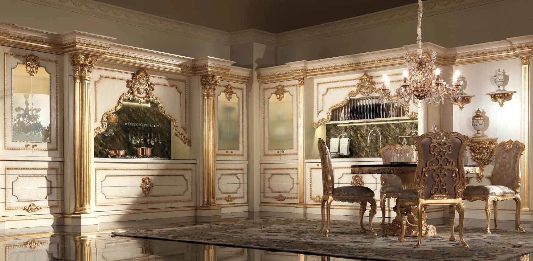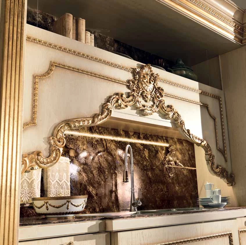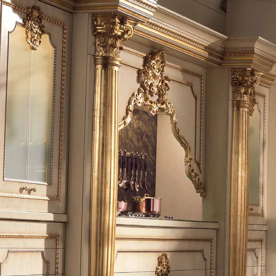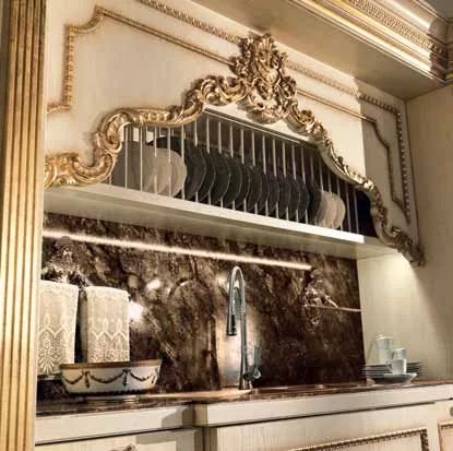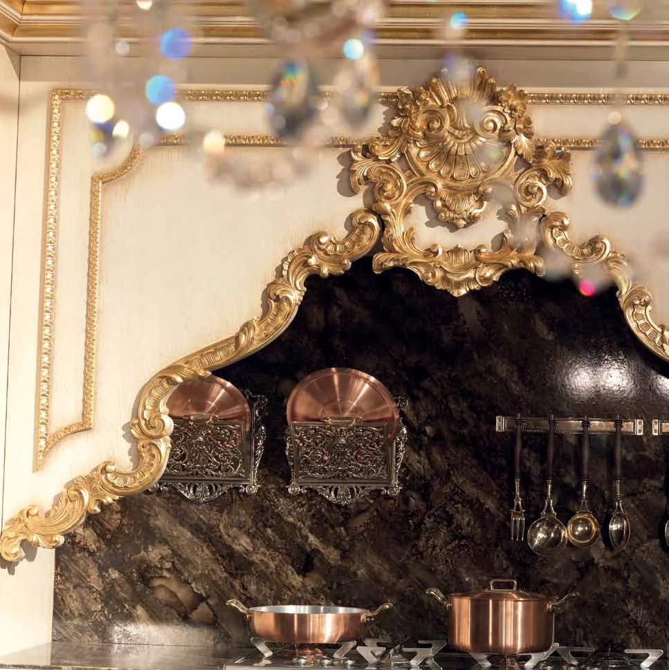 Кухня Casta Diva от итальянской фабрики Jumbo Collection – воплощение тонкого аристократичного вкуса и любви к роскоши. Ей присуще обилие резного декора в стиле барокко, богатая отделка золотом придает слегка состаренным белым фасадам парадный вид, и даже стекла в шкафчиках похожи на старинные венецианские зерка-ла.