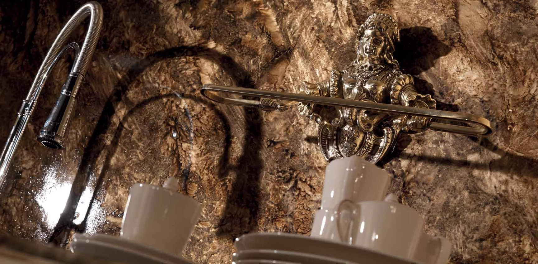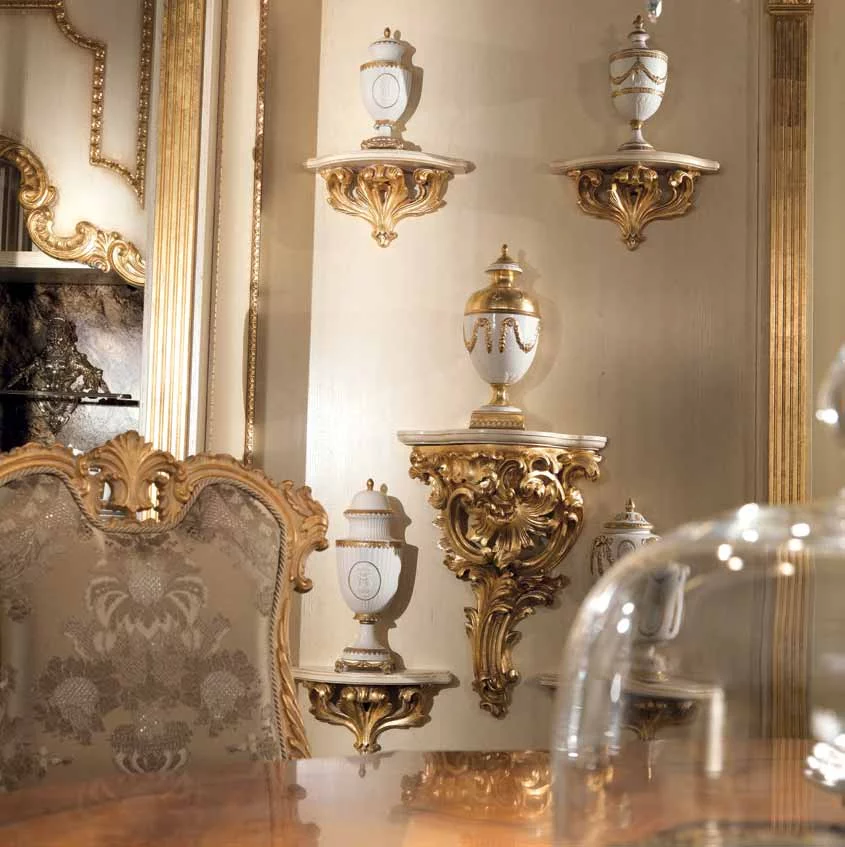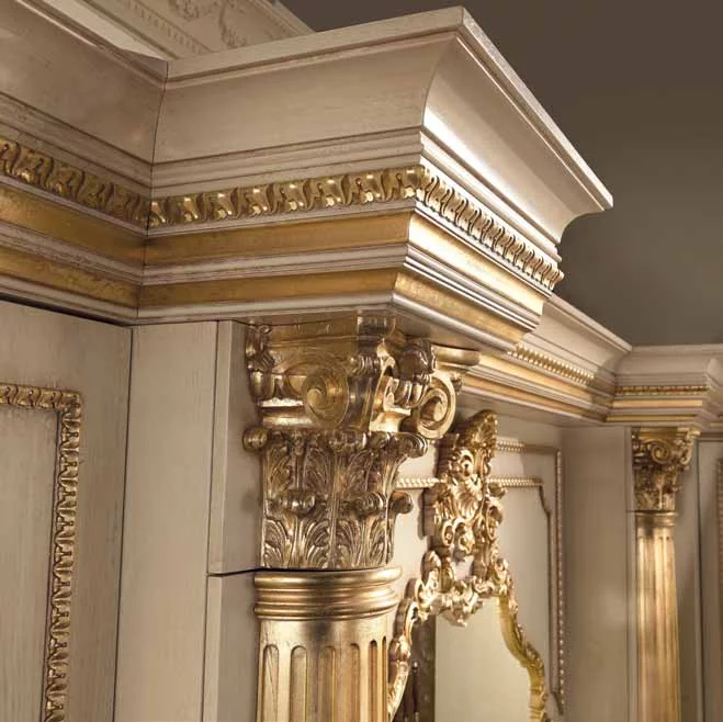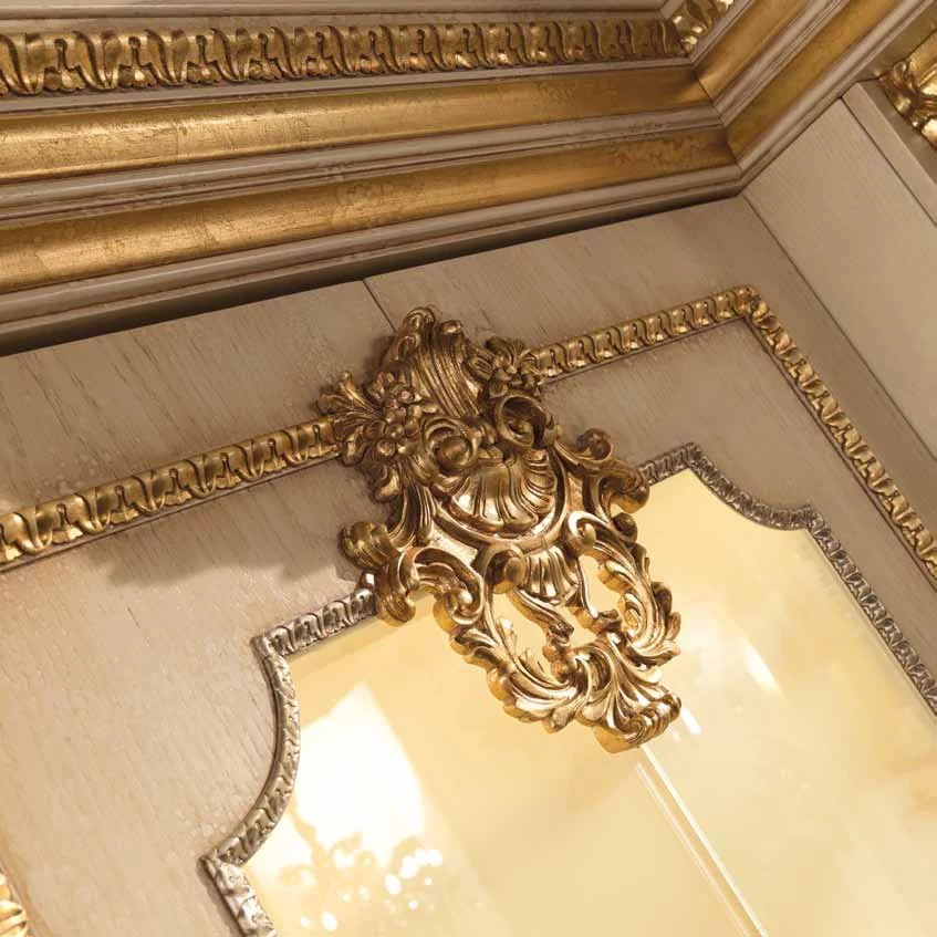 Кухня Casta Diva от итальянской фабрики Jumbo Collection – воплощение тонкого аристократичного вкуса и любви к роскоши. Ей присуще обилие резного декора в стиле барокко, богатая отделка золотом придает слегка состаренным белым фасадам парадный вид, и даже стекла в шкафчиках похожи на старинные венецианские зерка-ла.