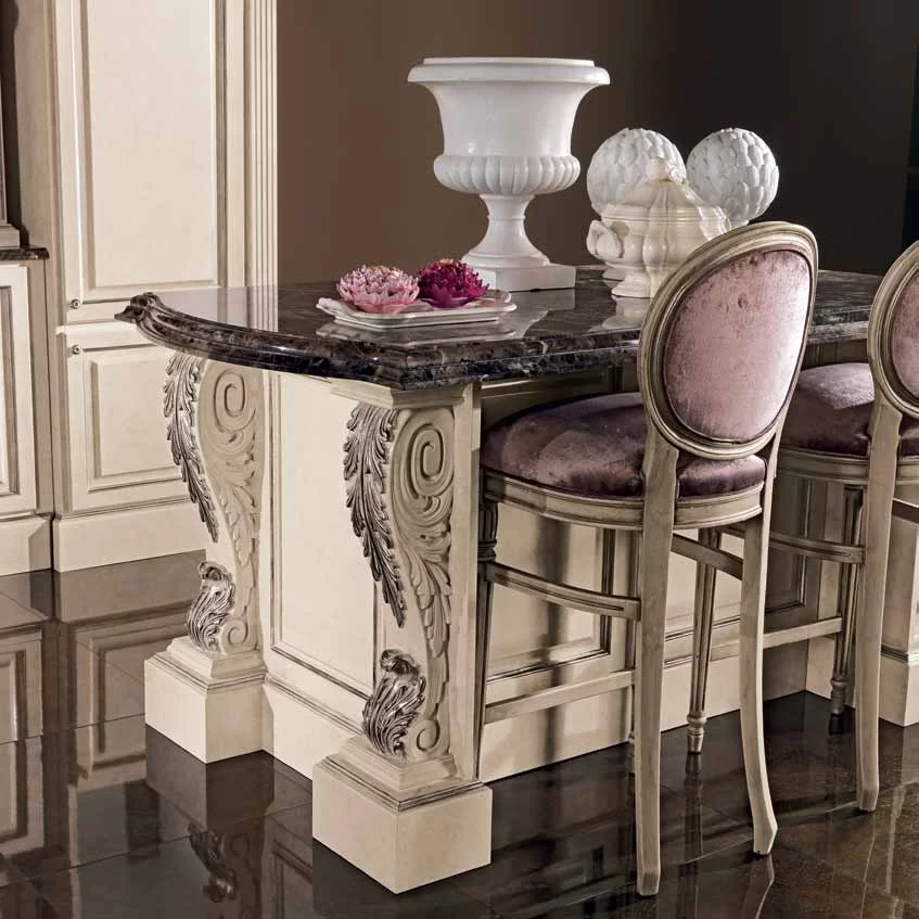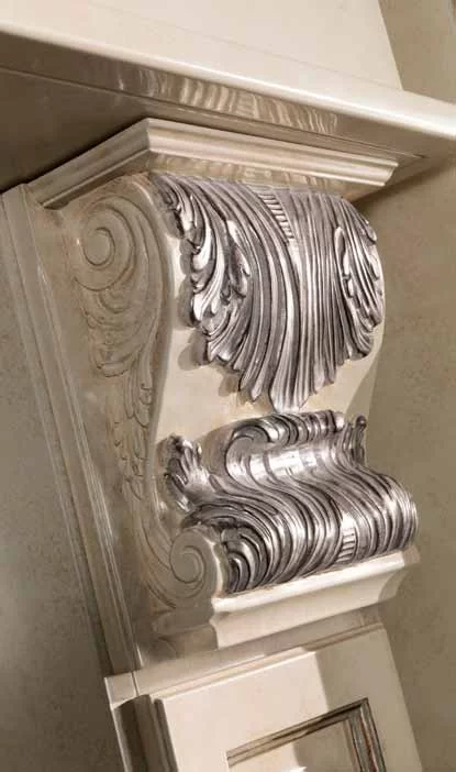 Для обработки натуральной древесины фасадов применена особая технология, позволившая получить поверхность с чуть заметными цветовыми переходами, резные декоры покрыты лаком под цвет старинного серебра.