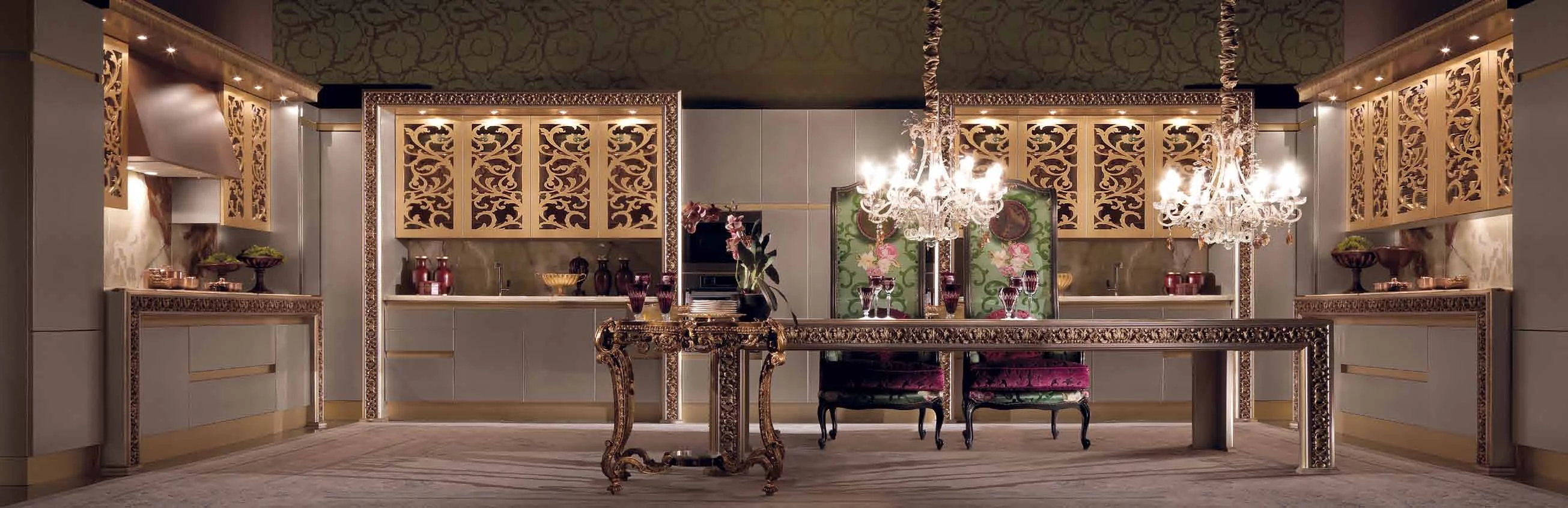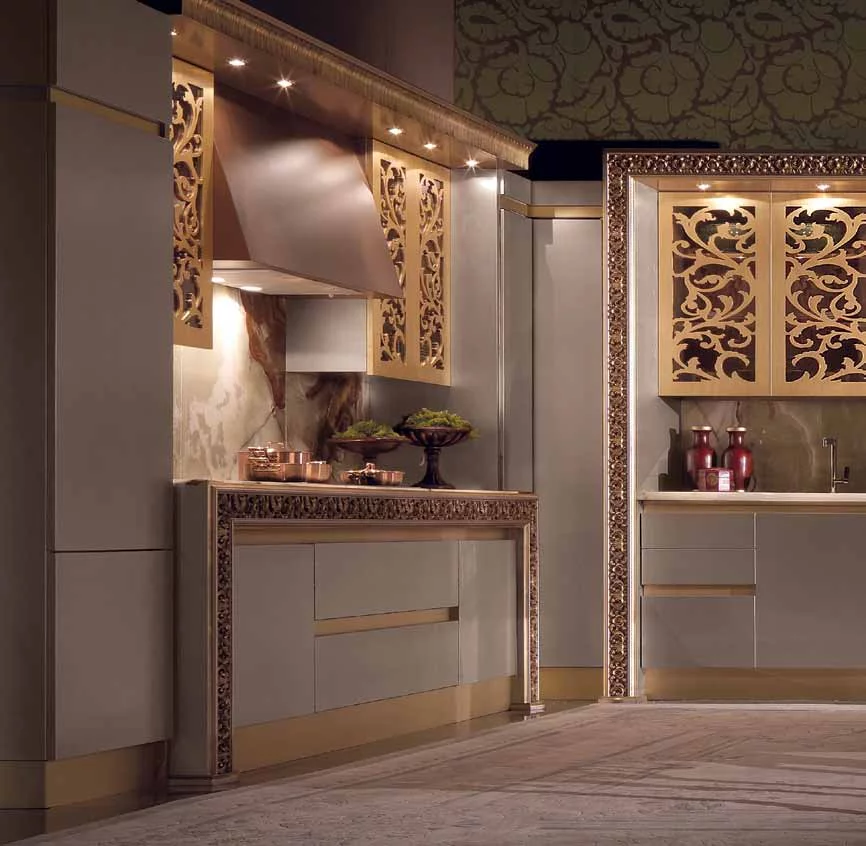 Итальянская кухня Matisse от Jumbo Collection представляет собой причудливую смесь двух совершенно разных концепций — классического стиля и современных инноваций. Предельно простые формы неожиданно, но очень удачно сочетаются с барочными элементами дизайна и золотыми резными украшениями.