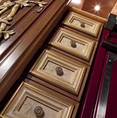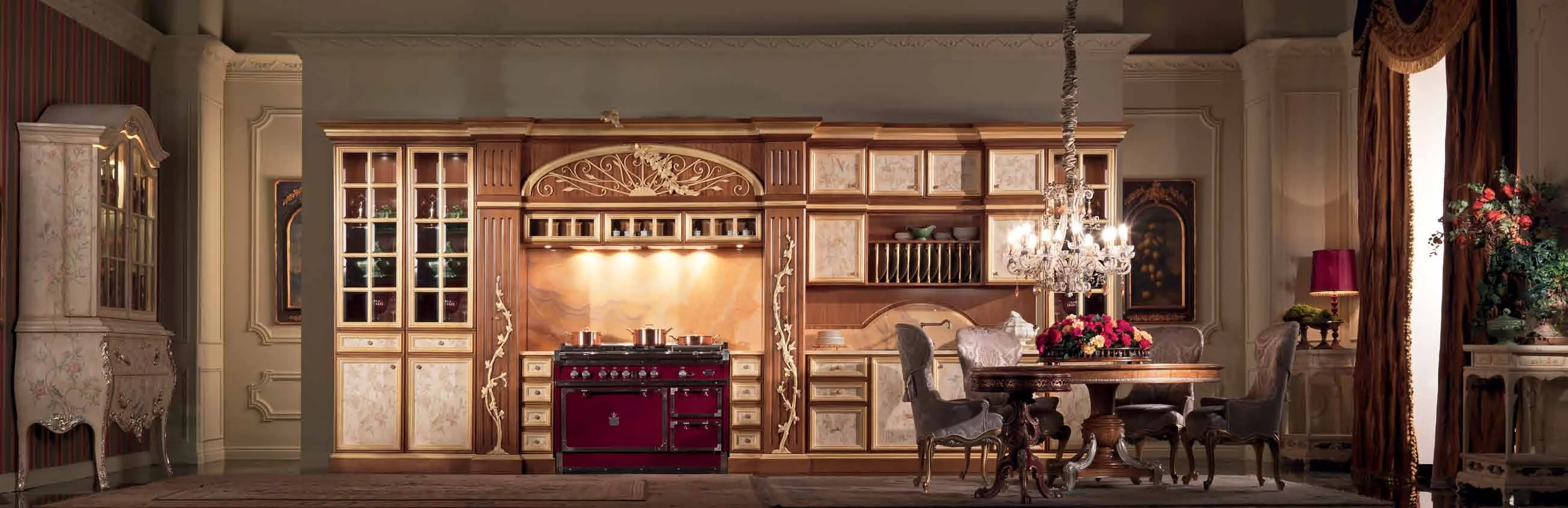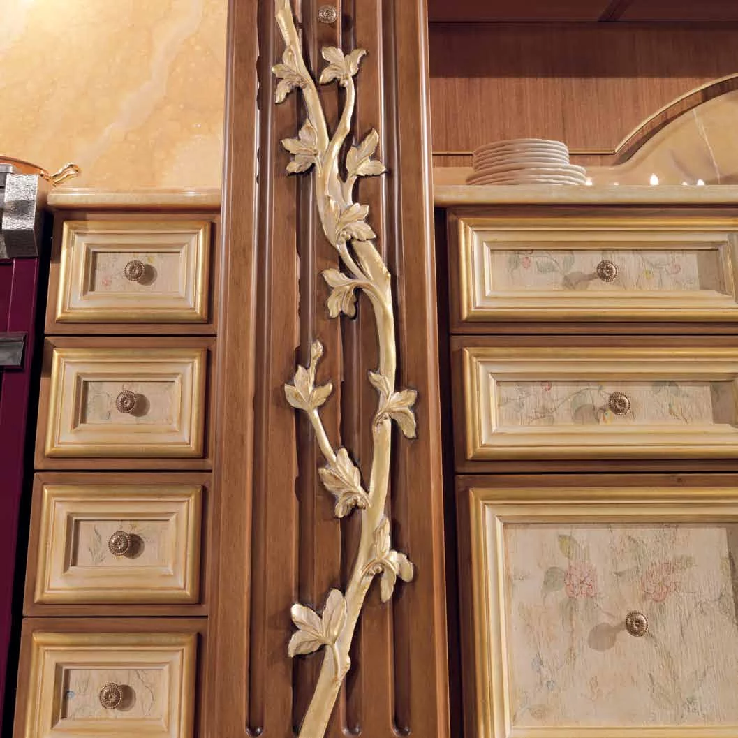Необыкновенно уютная кухня Piranesi, созданная на фабрике Jumbo Collection, декорирована в традиционном европейском стиле. Композиция декорирована множеством свойственных живой природе украшений: резные листья на декоративных колоннах и цветы на расписанных вручную фасадах.