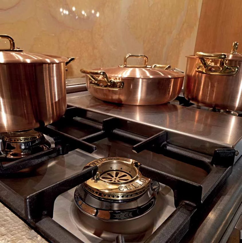 Естественный тон ореховой древесины удивительно гармонично сочетается с состаренным золотом на фасадах и теплым, чуть розоватым ониксом на рабочей по-верхности и фартуке кухни.