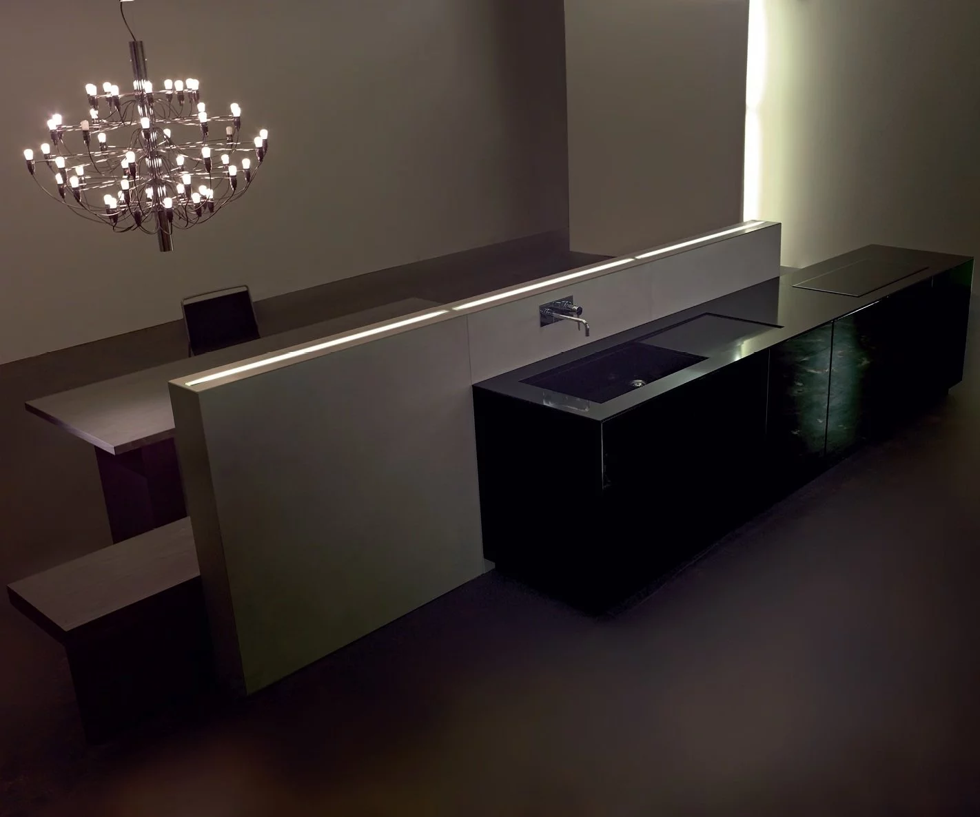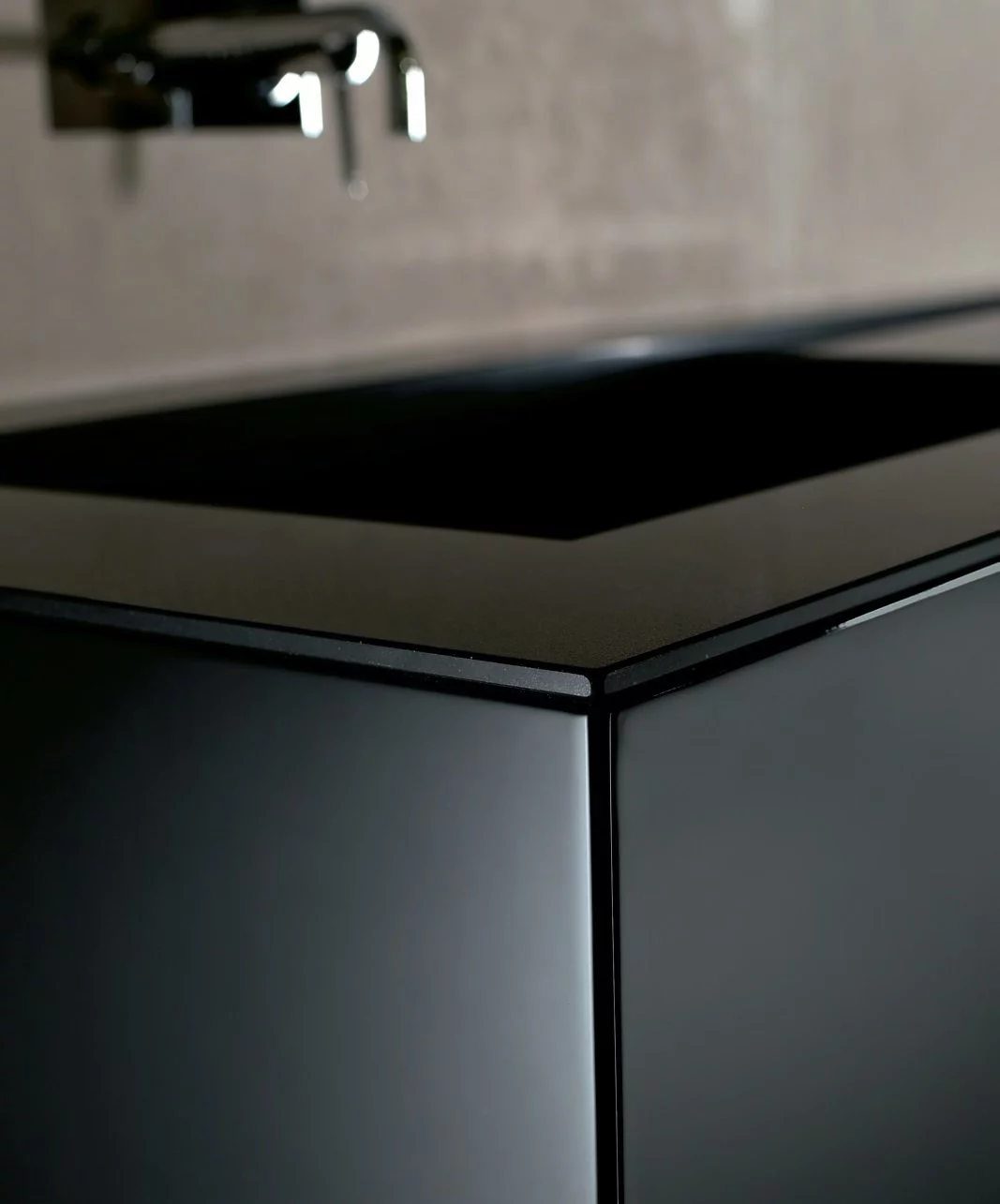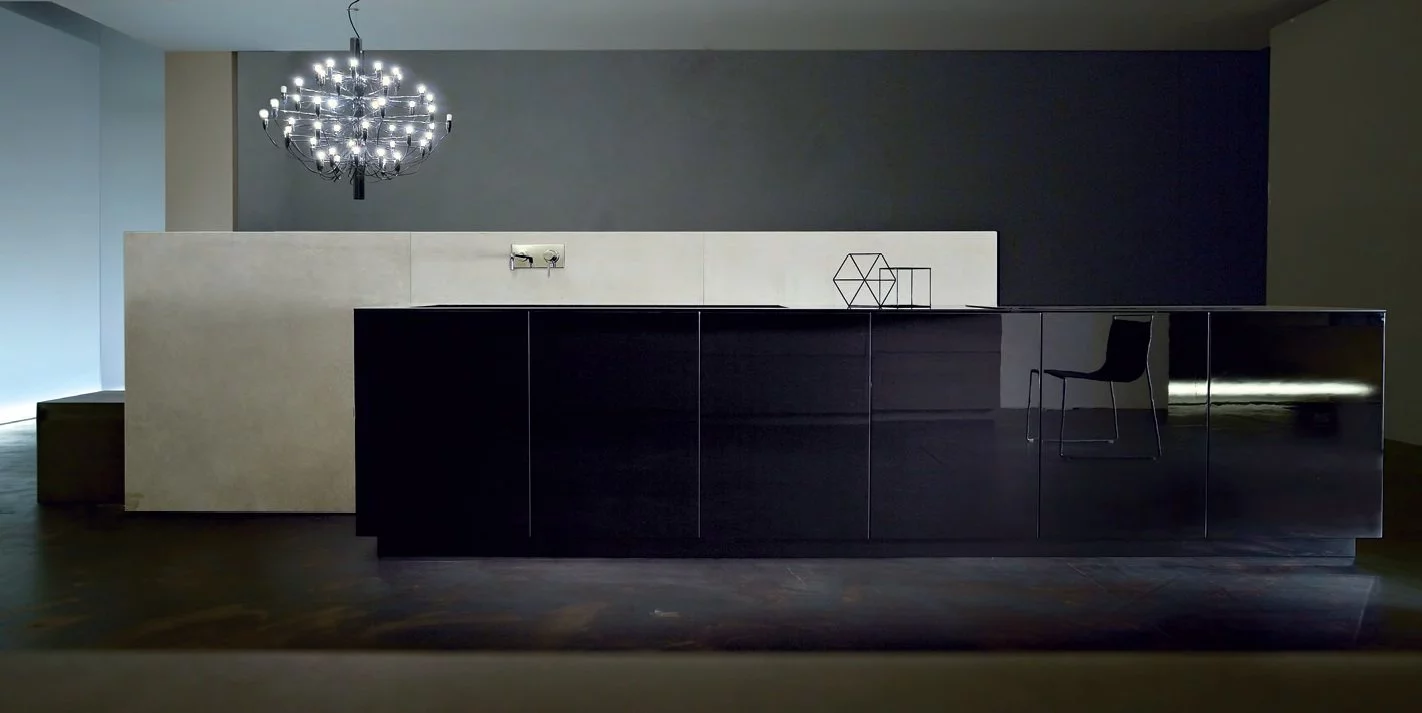 Представлена отделка кухни Ku45 с черными глянцевыми фасадами.