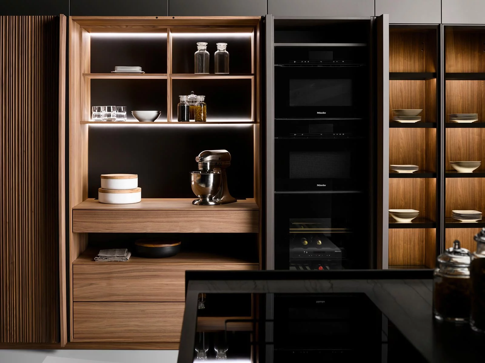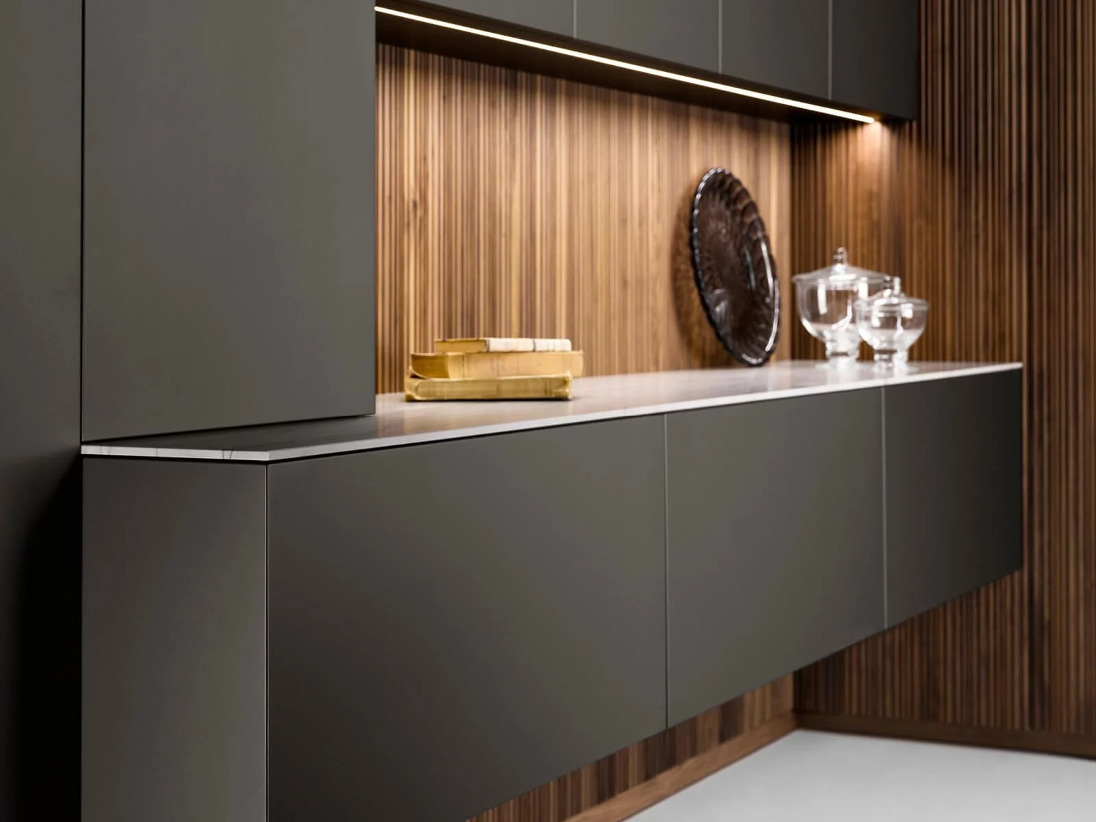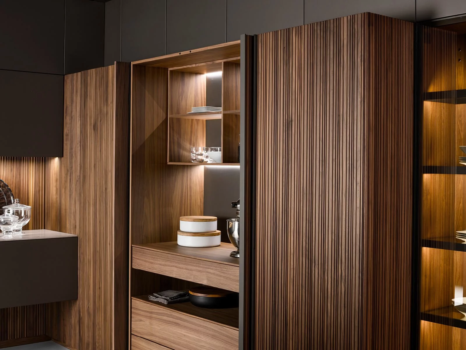 Отделка из ореха Canaletto придаёт помещению мягкий, тёплый оттенок и объединяет все элементы в единую гармоничную композицию. Вертикальные фрезерованные фасады выглядят стильно и аккуратно, добавляя кухне ощущение уюта и изысканности.