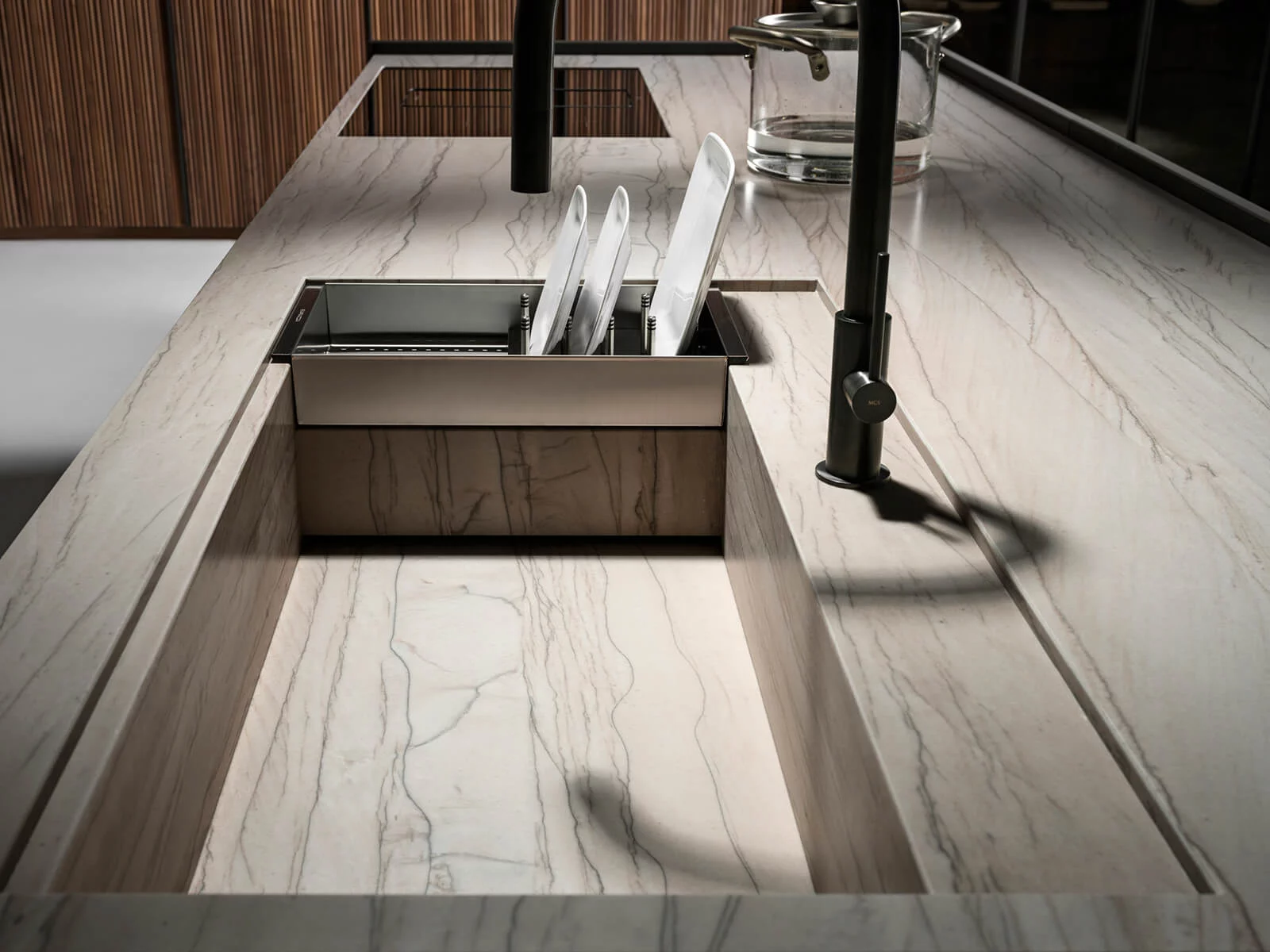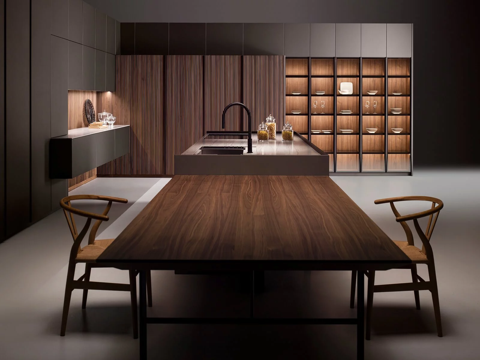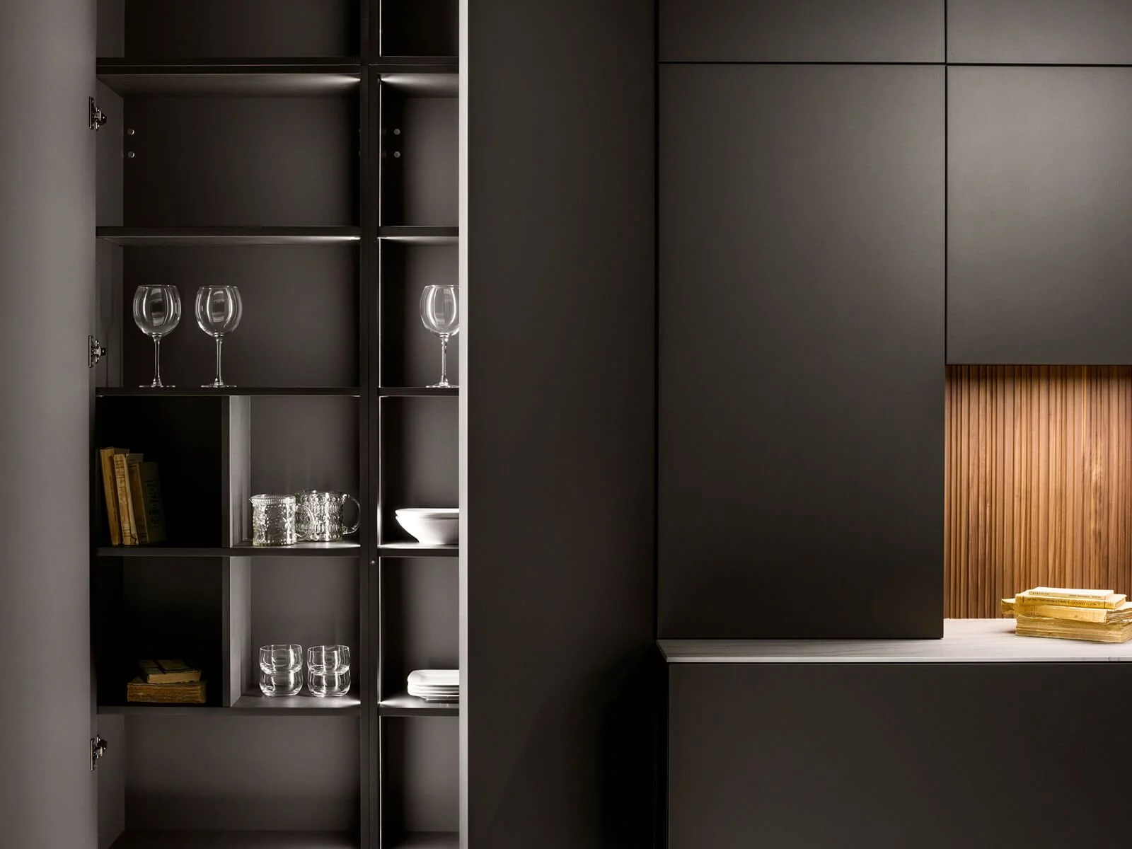 Отделка из ореха Canaletto придаёт помещению мягкий, тёплый оттенок и объединяет все элементы в единую гармоничную композицию. Вертикальные фрезерованные фасады выглядят стильно и аккуратно, добавляя кухне ощущение уюта и изысканности.