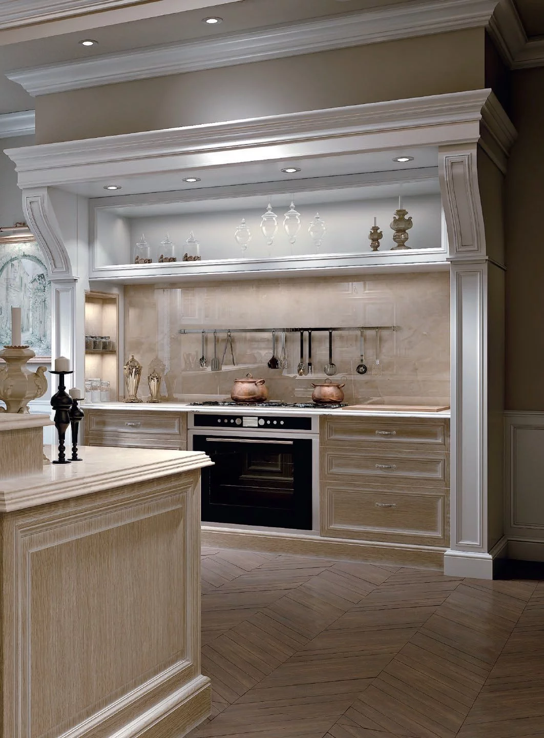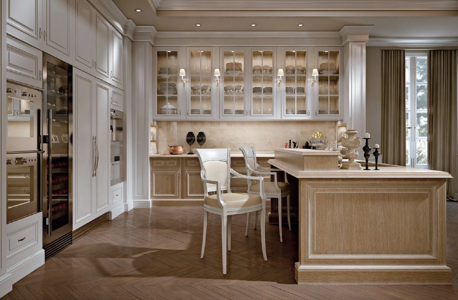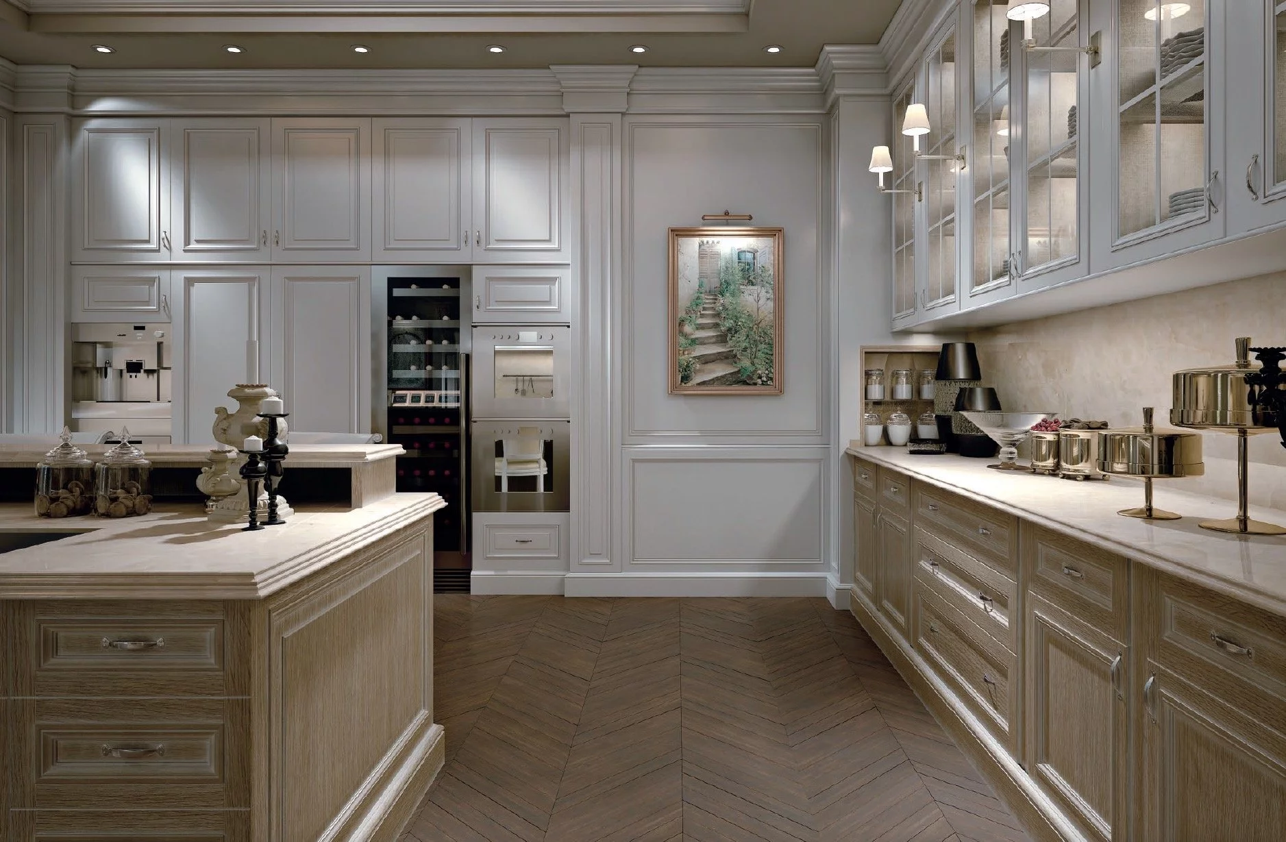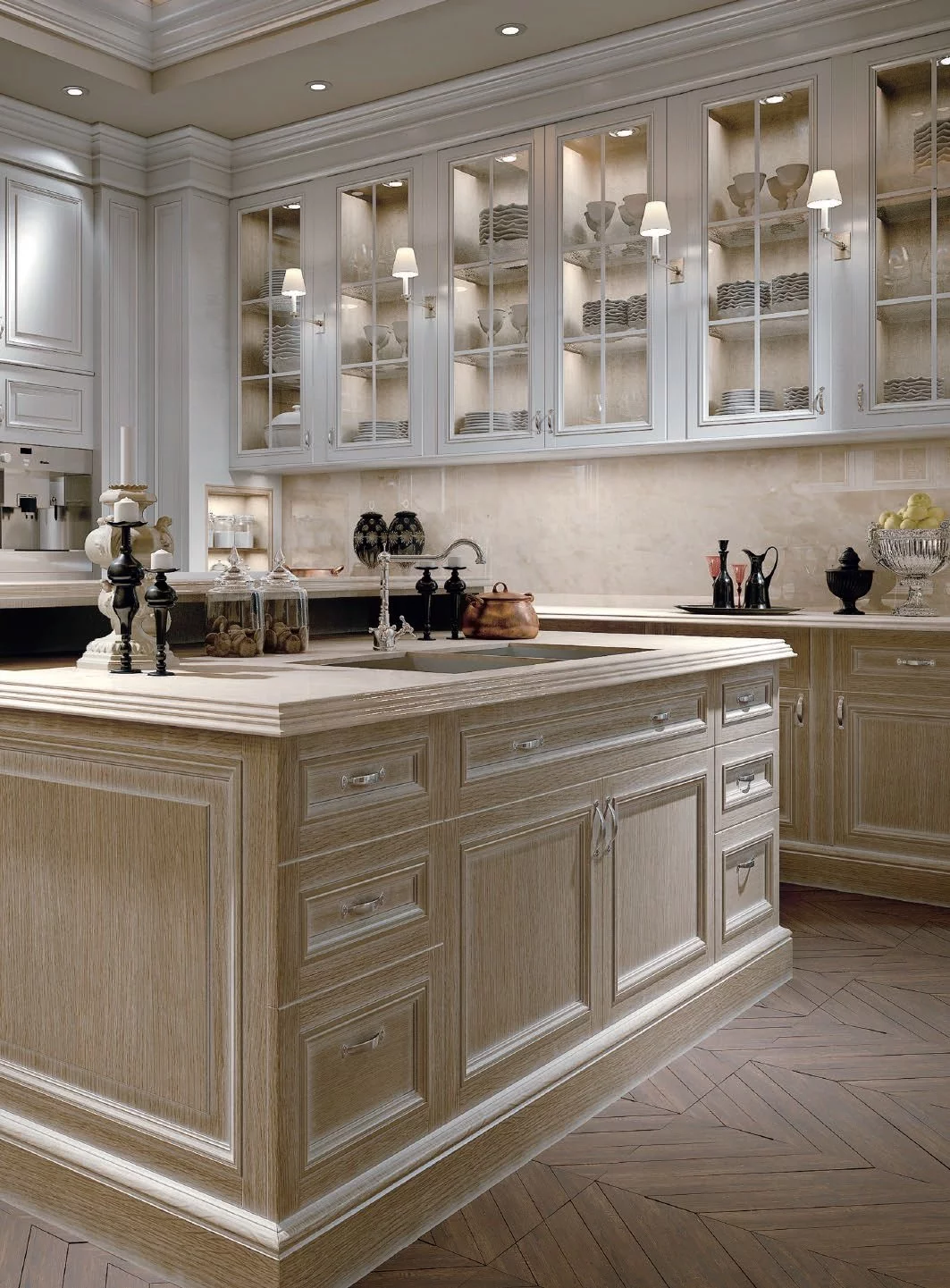 Минимализм в классическом стиле — это нежнейшая и романтичная кухня Oxford для любителей простого комфорта от ведущей итальянской фабрики Provasi. Никаких лишних деталей, только уместная фурнитура и пастельные кремовые и белые оттенки дарят этой модели неповторимую атмосферу райского уголка, в котором непременно хочется укрыться от шумного города после тяжелого трудового дня. Исходным материалом для кухни Oxford послужил массив древесины дорогой породы ореха, который в сочетании со стеклянными фасадами шкафчиков создают гармоничный внешний вид гарнитура. Этот образец также удобен в эксплуатации благодаря большому количеству шкафчиков и оснащён интегрированной подсветкой.