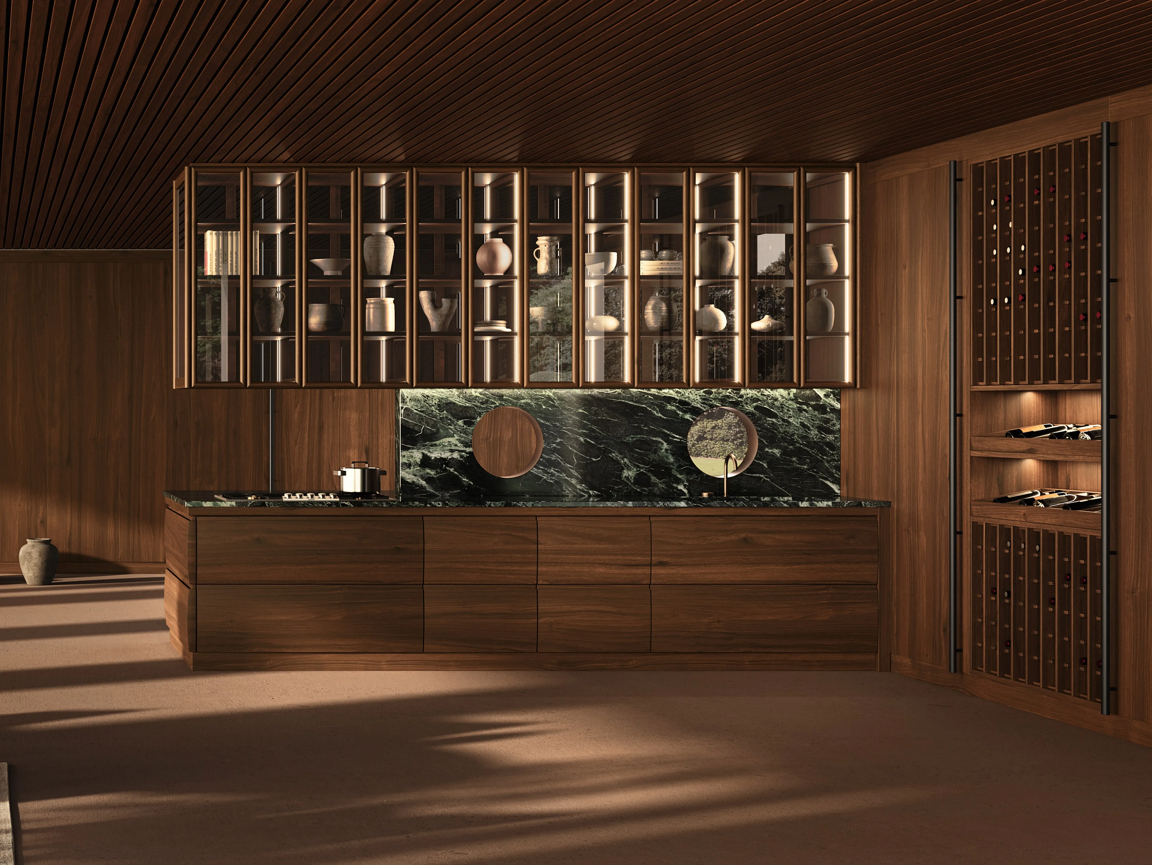 Кухня Chronos 2.2, являющаяся воплощением дизайнерских и производственных навыков компании, задумана как полуостров с двух сторон, идеально разделяя пространство и сохраняя при этом ощущение непрерывности. Эта модель отличается изящными округлыми дверцами в рабочей зоне и дополняется стеновыми модулями из дерева и бронзированного стекла с впечатляющей внутренней системой освещения. Зеленый мрамор Alpi становится декоративным элементом в заднем плане благодаря металлическим оконцам. Рядом с ним расположено просторное открытое помещение для хранения вин, между боковыми колоннами, где находятся кладовая и холодильник/духовка. Это помещение оборудовано гладкими дверцами с длинными линейными ручками, гармонирующими с эффектной архитектурой буазери на стенах. Буазери, также ручной работы из национального ореха и полноразмерная, не забывает о функциональности, предлагая сочетание фиксированных стен с хранилищами и проходными дверями.