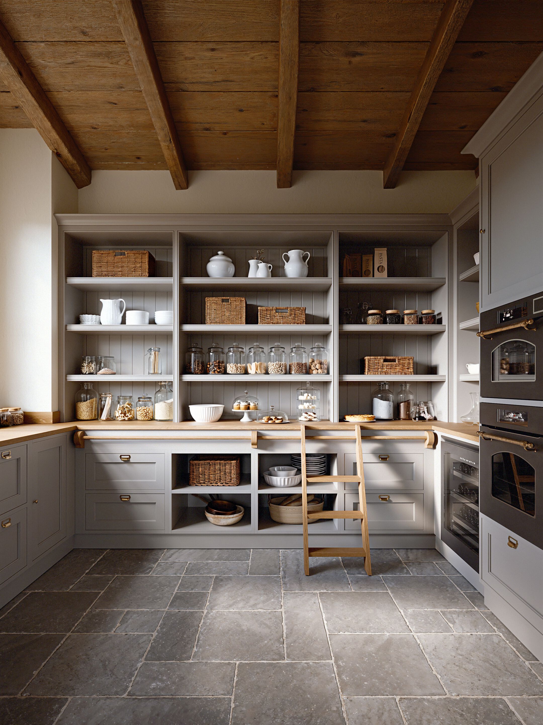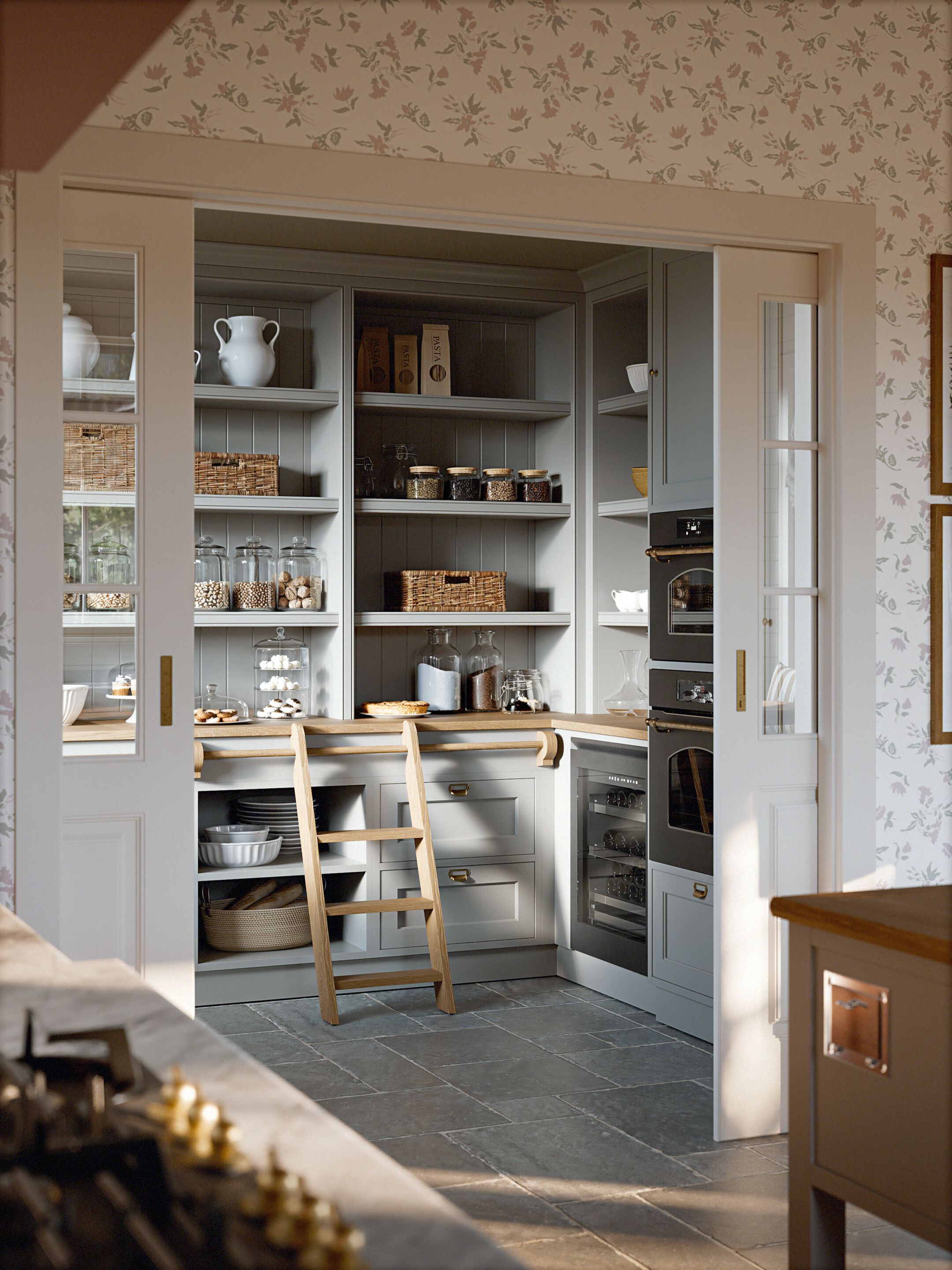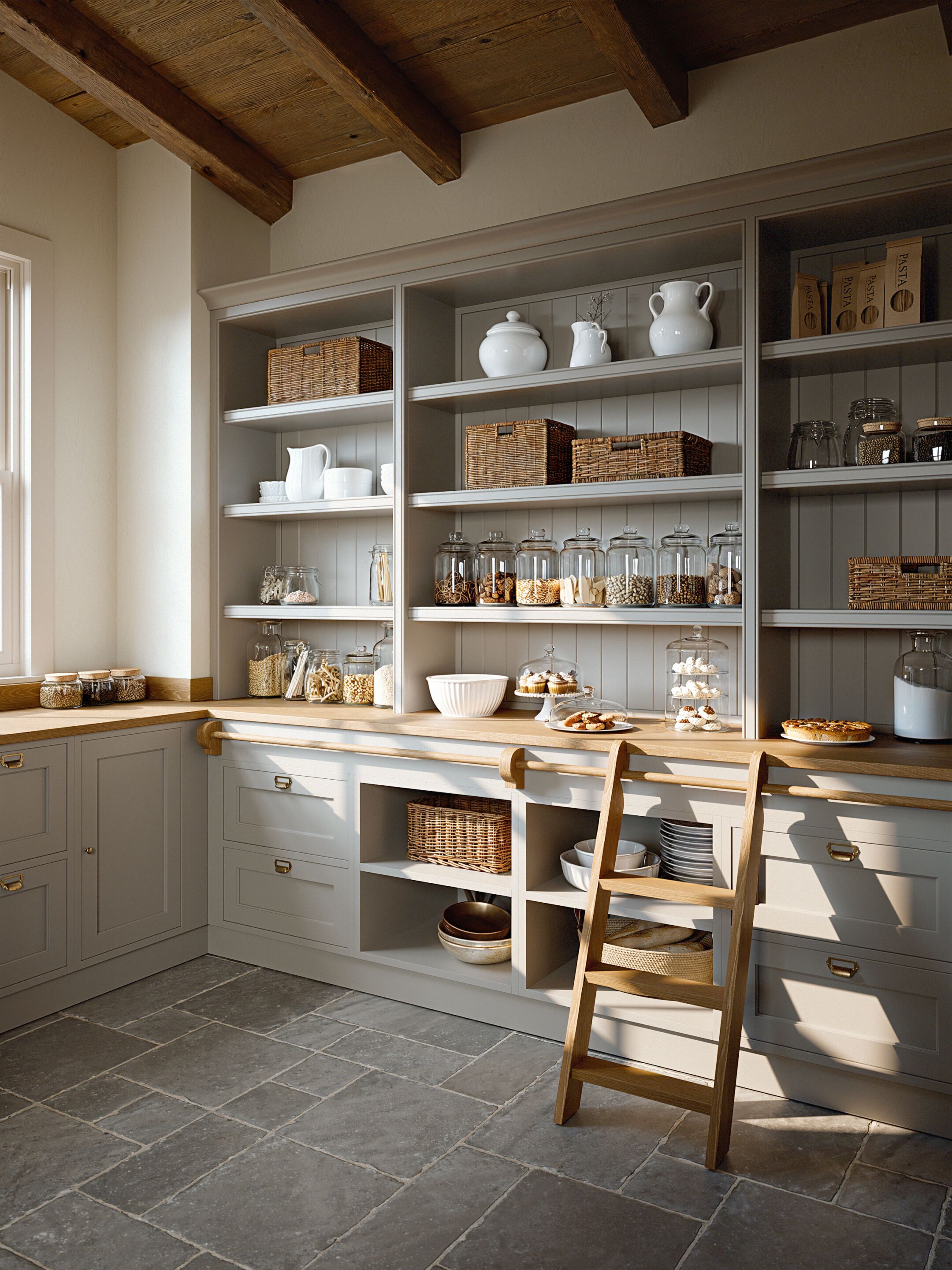 Но интереснее всего устроено пространство дальше. За раздвижными дверями спрятана кладовая — отдельная зона, где всё разложено по своим местам. Полки, лестница, банки, текстиль - всё напоминает о старых домах, где вещи хранят не просто так, а с вниманием.