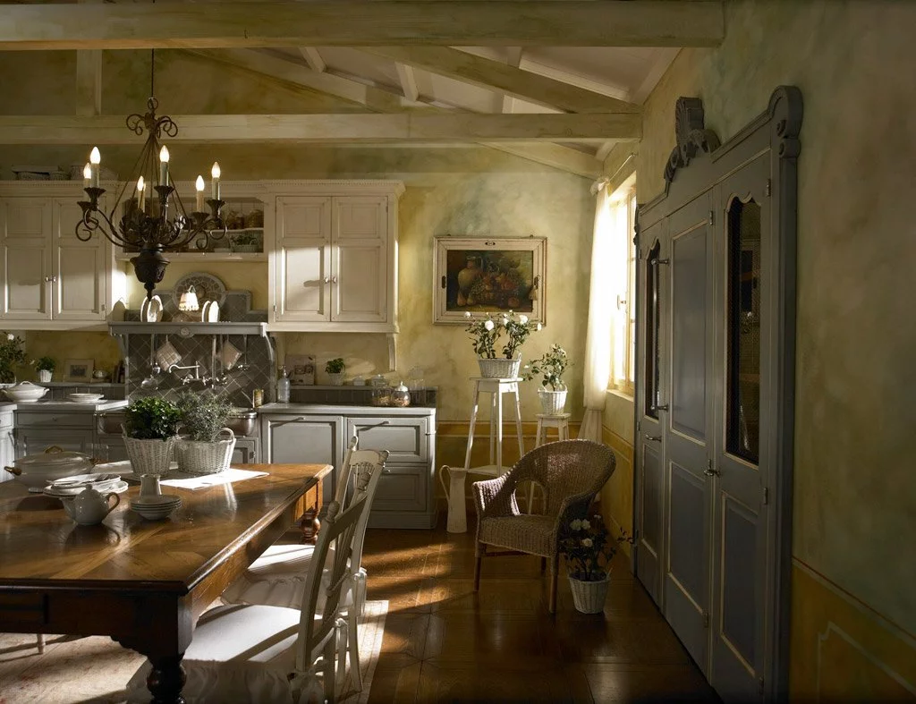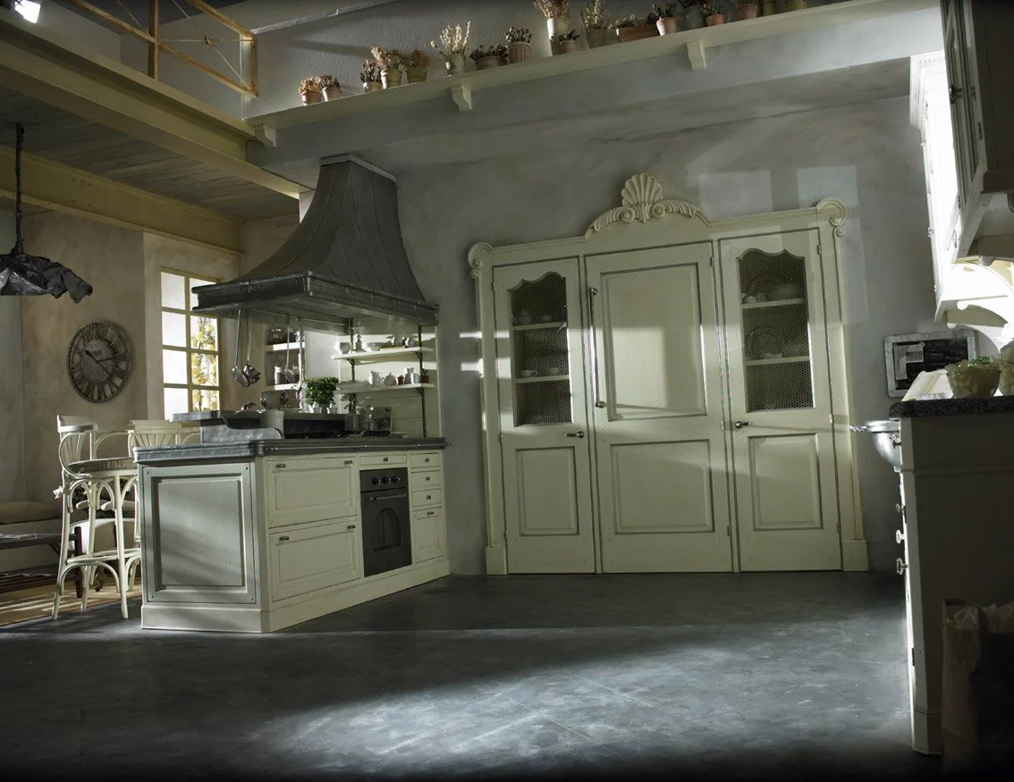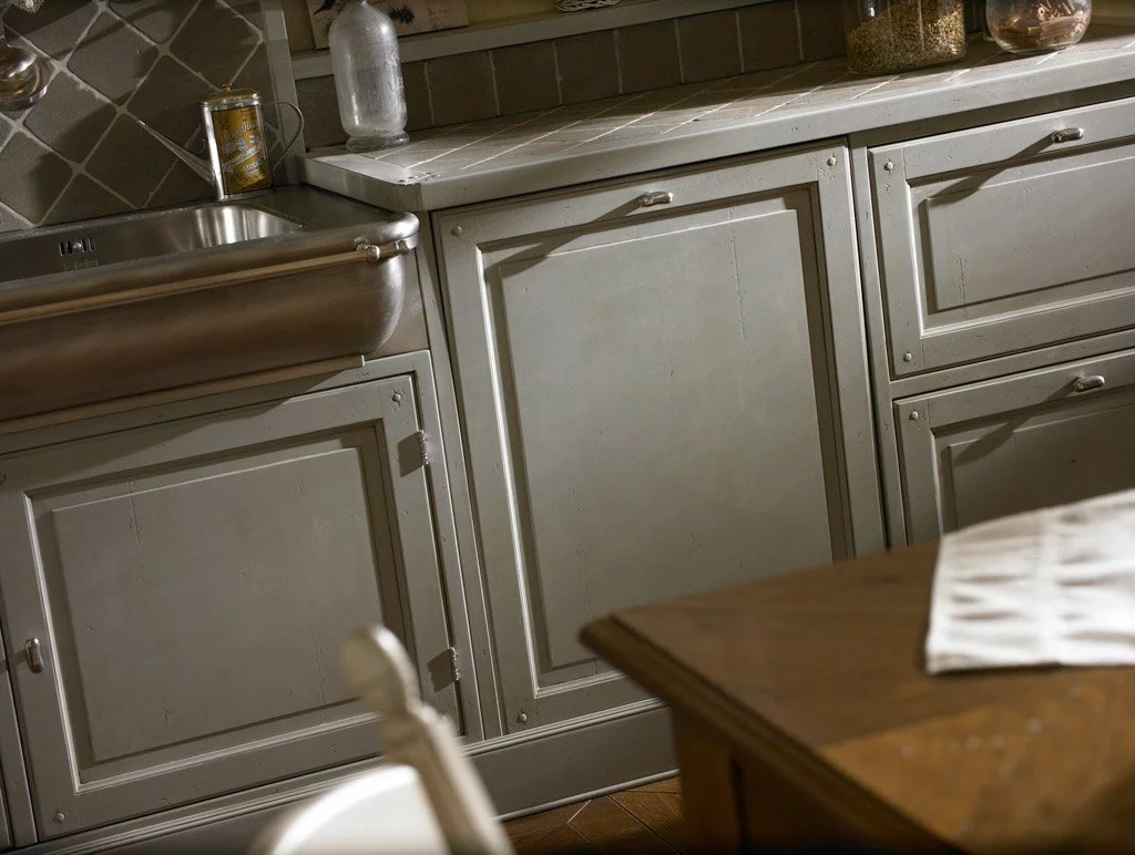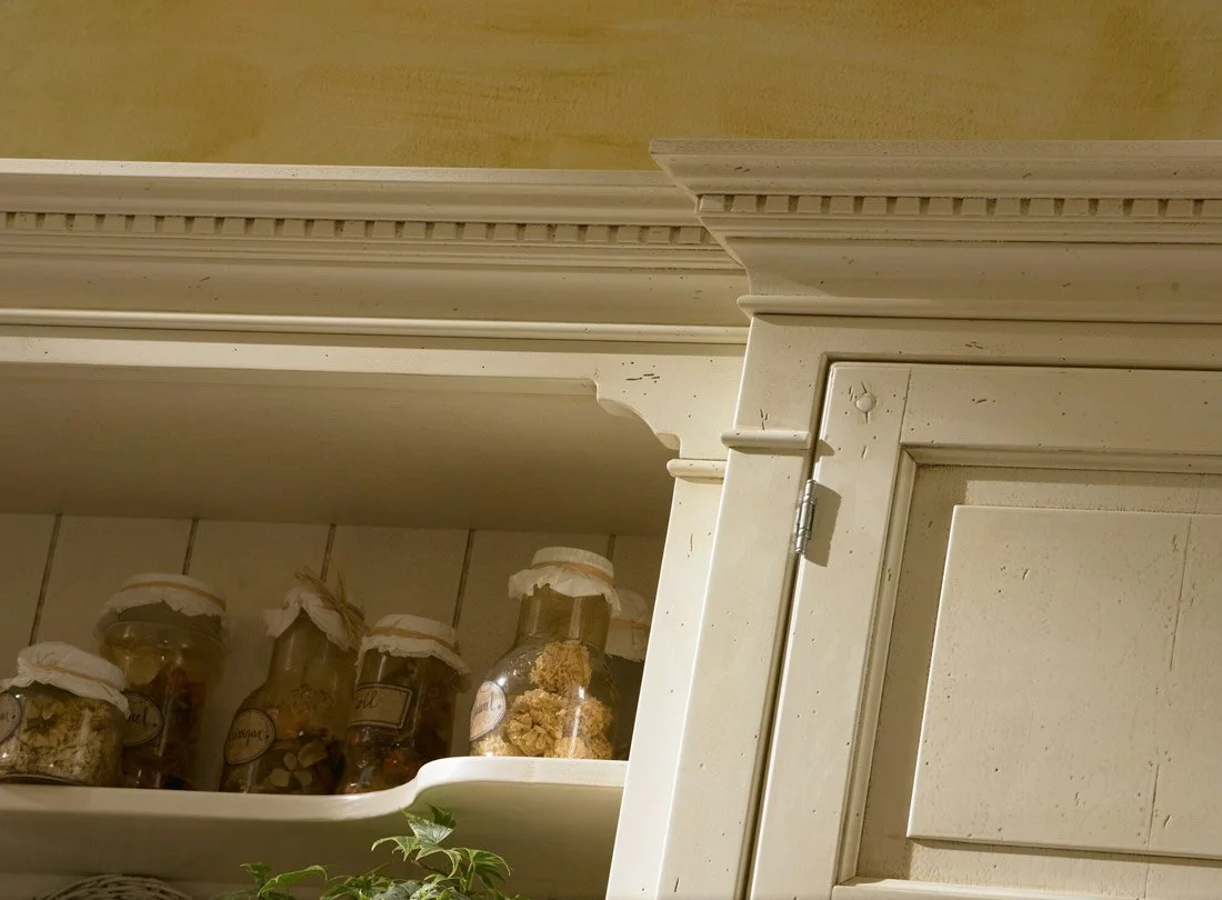 Однотонные кухонные фасады выполнены из высококачественного натурального дерева. Некоторые элементы гарнитура мастерски созданы с применением ручного труда в отделке. Технология искусственного состаривания придаёт кухне Dhialma очарование старинности.