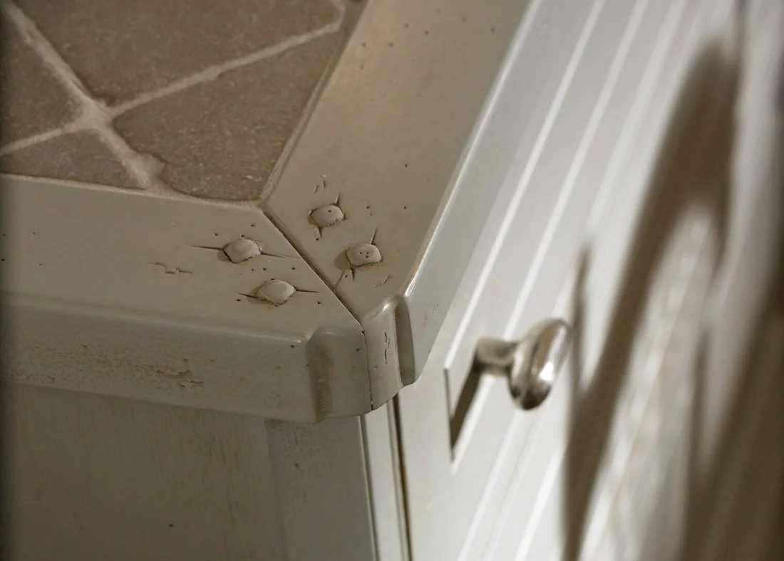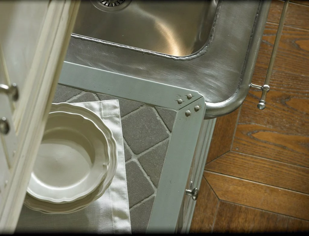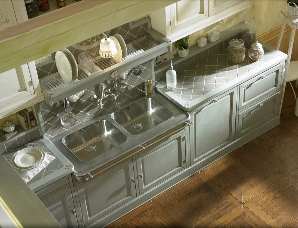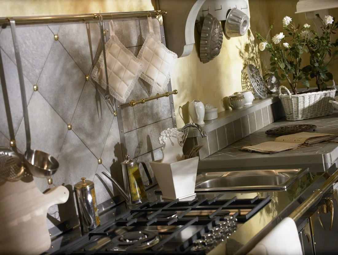 Однотонные кухонные фасады выполнены из высококачественного натурального дерева. Некоторые элементы гарнитура мастерски созданы с применением ручного труда в отделке. Технология искусственного состаривания придаёт кухне Dhialma очарование старинности.