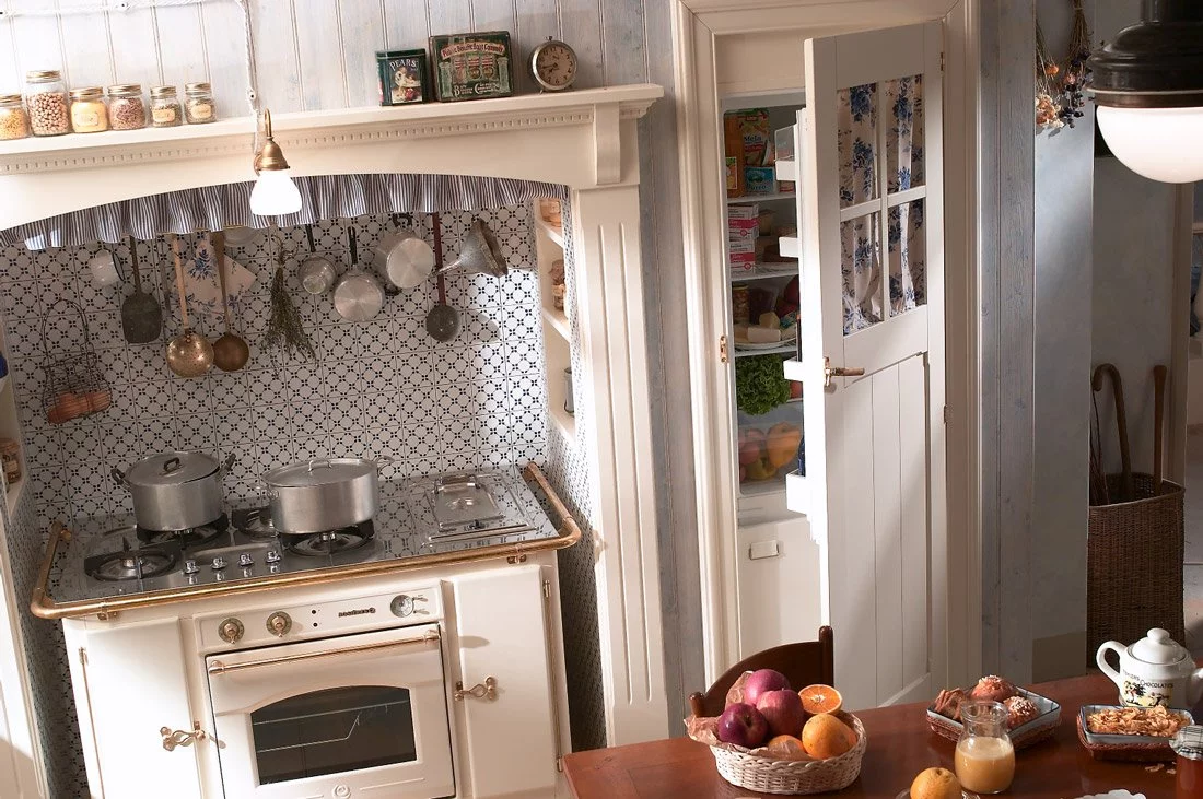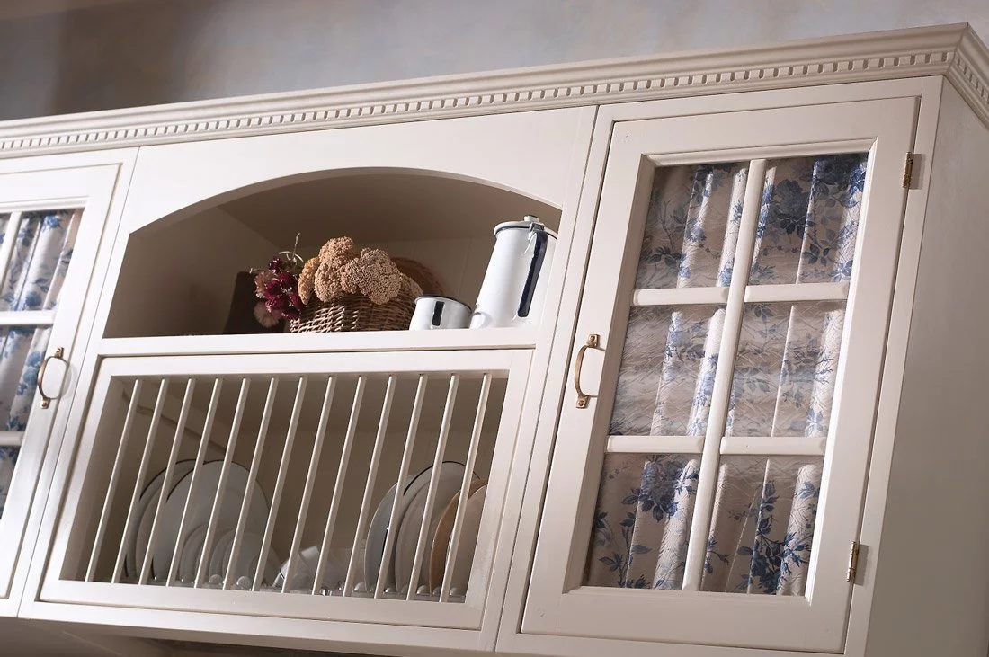 Конструкция кухни Old England состоит из широких тумб и навесных шкафов, декорированных медными ручками. Изящность гарнитуру придают открытые полки для хранения посуды и выразительные решётки на застеклённых дверцах.