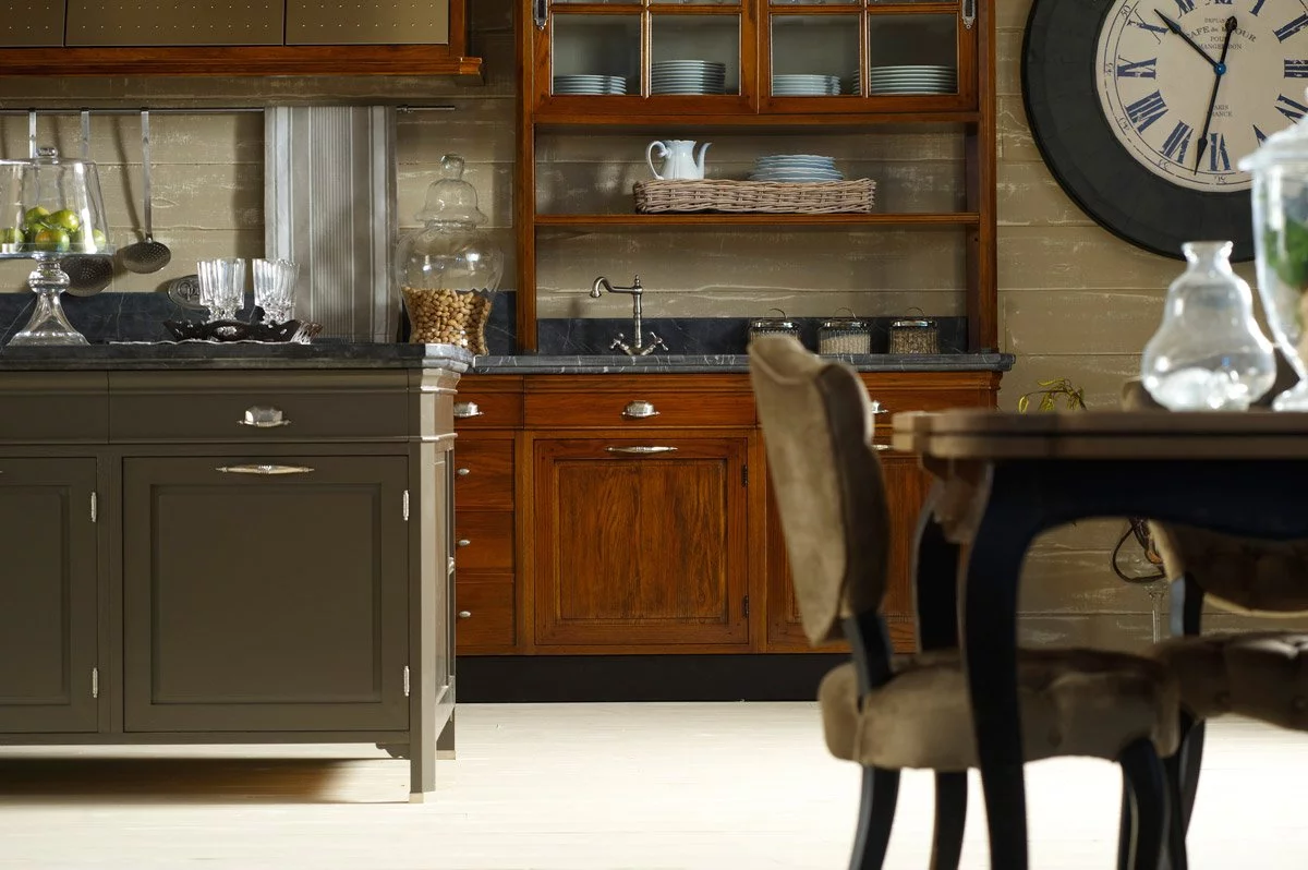 Конструкция создана из цельного экологичного древесного массива и окрашена в благородные пастельные тона. Дверцы верхних фасадов кухни Opera застеклены и декорированы решёткой. Дополнительное место для кухонных приборов и аксессуаров создаётся применением в гарнитуре широких открытых полок.